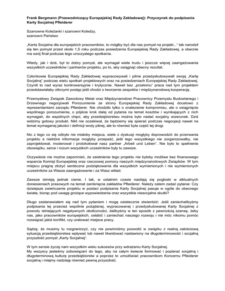 Frank Bergmann (Przewodniczący Europejskiej Rady Zakładowej): Przyczynek do podpisania Karty Socjalnej Pfleiderer Szanowne Koleżanki i szanowni Koledzy, szanowni Państwo „Karta Socjalna dla europejskich pracowników, to mógłby być dla nas pomysł na projekt...“ tak narodził się ten pomysł przed około 1,5 roku podczas posiedzenia Europejskiej Rady Zakładowej, a obecnie ma swój finał podczas tego uroczystego spotkania. Wtedy, jak i dziś, był to dobry pomysł, ale wymagał wiele trudu i jeszcze więcej zaangażowania wszystkich uczestników i partnerów projektu, po to, aby osiągnąć obecny rezultat. Członkowie Europejskiej Rady Zakładowej wypracowywali i pilnie przedyskutowywali swoją „Kartę Socjalną“ podczas wielu spotkań projektowych oraz na posiedzeniach Europejskiej Rady Zakładowej. Czynili to nad wyraz kontrowersyjnie i krytycznie. Nawet bez „przełomu“ praca nad tym projektem przedstawiałaby olbrzymi postęp jeśli chodzi o tworzenie zespołów i międzynarodową kooperację. Przemysłowy Związek Zawodowy Metal oraz Międzynarodowi Pracownicy Przemysłu Budowlanego i Drzewnego negocjowali Porozumienie ze strony Europejskiej Rady Zakładowej docelowo z reprezentantami zarządu Pfleiderer. Nie chodziło tylko o znalezienie kompromisu, ale o osiągnięcie wspólnego porozumienia, o pójście krok dalej od pytania na temat kosztów i wynikających z nich wymagań, do wspólnych chęci, aby przedsiębiorstwu można było nadać socjalny wizerunek. Dziś widzimy gotowy produkt. Nikt nie oczekiwał, że będziemy się spierać podczas negocjacji nawet na temat wymaganej jakości i definicji wody pitnej, ale to również była część tej drogi. Nic z tego co się odbyło nie miałoby miejsca, wiele z dyskusji mogłyby doprowodzić do przerwania projektu a niektóre informacje mogłyby przepaść, jeśli tego wszystkiego nie zorganizowałby, nie zaprojektował, moderował i protokołował nasz partner „Arbeit und Leben“. Nie było to spełnienie obowiązku, serce i rozum wszystkich uczestników były tu zawsze. Oczywiście nie można zapomnieć, że zaistnienie tego projektu nie byłoby możliwe bez finansowego wsparcia Komisji Europejskiej oraz rzeczowej pomocy naszych międzynarodowych Związków. W tym miejscu pragnę złożyć serdeczne podziękowania dla wszystkich wymienionych i nie wymienionych uczestników za Wasze zaangażowanie i za Wasz wkład. Zawsze istnieją jednak cienie. I tak, w ostatnim czasie nasilają się pogłoski w alktualnych doniesieniach prasowych na temat zamknięcia zakładów Pfleiderer. Należy zatem zadać pytanie: Czy dzisiejsze zwieńczenie projektu w postaci podpisania Karty Socjalnej pasuje w ogóle do obecnego świata, biorąc pod uwagę grożące wypowiedzenia oraz wszystkie niesocjalne skutki? Długo zastanawiałem się nad tym pytaniem i mogę ostatecznie stwierdzić: Jeśli zaniechalibyśmy podpisania tej przecież wspólnie pożądanej, wypracowanej i przedyskutowanej Karty Socjalnej z powodu istniejących negatywnych okoliczności, dalibyśmy w ten sposób z pewnością szansę, żeby nas, jako pracowników europejskich, osłabić i zaniechać naszego rozwoju i nie móc nikomu pomóc rozwiązać jakiś konflikt, czy uratować miejsce pracy. Sądzę, że musimy tu rozgraniczyć, czy nie powinniśmy pozwolić w związku z realną całościową sytuacją przedsiębiorstwa wpływać lub nawet likwidować nastawiony na długoterminowość i socjalną przyszłość pomysł „Karty Socjalnej“. W tym sensie życzę nam wszystkim wielu sukcesów przy wdrażaniu Karty Socjalnej. My wszyscy jesteśmy zobowiązani do tego, aby na całym świecie formować i popierać socjalną i długoterminową kulturę przedsiębiorstw a poprzez to umożliwiać pracownikom Koncernu Pfleiderer socjalną i miejmy nadzieję również pewną przyszłość.