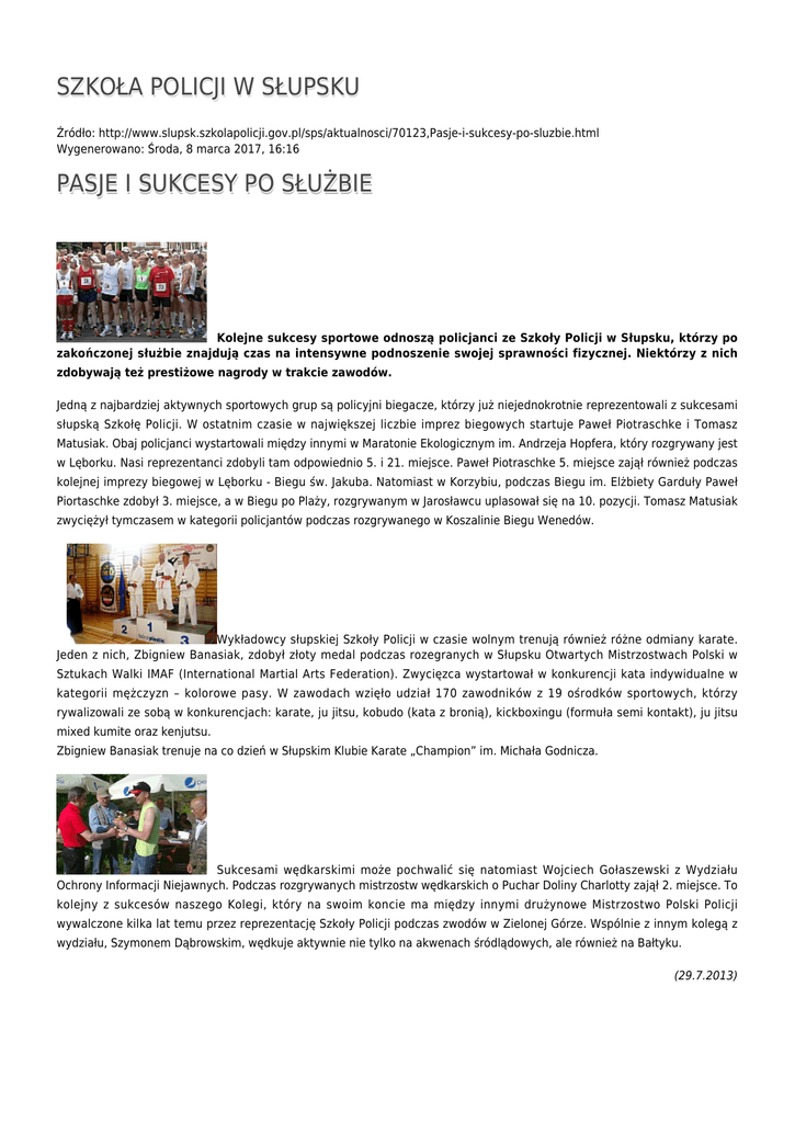 SZKOŁA POLICJI W SŁUPSKU Źródło: http://www.slupsk.szkolapolicji.gov.pl/sps/aktualnosci/70123,Pasje-i-sukcesy-po-sluzbie.html Wygenerowano: Środa, 8 marca 2017, 16:16 PASJE I SUKCESY PO SŁUŻBIE Kolejne sukcesy sportowe odnoszą policjanci ze Szkoły Policji w Słupsku, którzy po zakończonej służbie znajdują czas na intensywne podnoszenie swojej sprawności fizycznej. Niektórzy z nich zdobywają też prestiżowe nagrody w trakcie zawodów. Jedną z najbardziej aktywnych sportowych grup są policyjni biegacze, którzy już niejednokrotnie reprezentowali z sukcesami słupską Szkołę Policji. W ostatnim czasie w największej liczbie imprez biegowych startuje Paweł Piotraschke i Tomasz Matusiak. Obaj policjanci wystartowali między innymi w Maratonie Ekologicznym im. Andrzeja Hopfera, który rozgrywany jest w Lęborku. Nasi reprezentanci zdobyli tam odpowiednio 5. i 21. miejsce. Paweł Piotraschke 5. miejsce zajął również podczas kolejnej imprezy biegowej w Lęborku - Biegu św. Jakuba. Natomiast w Korzybiu, podczas Biegu im. Elżbiety Garduły Paweł Piortaschke zdobył 3. miejsce, a w Biegu po Plaży, rozgrywanym w Jarosławcu uplasował się na 10. pozycji. Tomasz Matusiak zwyciężył tymczasem w kategorii policjantów podczas rozgrywanego w Koszalinie Biegu Wenedów. Wykładowcy słupskiej Szkoły Policji w czasie wolnym trenują również różne odmiany karate. Jeden z nich, Zbigniew Banasiak, zdobył złoty medal podczas rozegranych w Słupsku Otwartych Mistrzostwach Polski w Sztukach Walki IMAF (International Martial Arts Federation). Zwycięzca wystartował w konkurencji kata indywidualne w kategorii mężczyzn – kolorowe pasy. W zawodach wzięło udział 170 zawodników z 19 ośrodków sportowych, którzy rywalizowali ze sobą w konkurencjach: karate, ju jitsu, kobudo (kata z bronią), kickboxingu (formuła semi kontakt), ju jitsu mixed kumite oraz kenjutsu. Zbigniew Banasiak trenuje na co dzień w Słupskim Klubie Karate „Champion” im. Michała Godnicza. Sukcesami wędkarskimi może pochwalić się natomiast Wojciech Gołaszewski z Wydziału Ochrony Informacji Niejawnych. Podczas rozgrywanych mistrzostw wędkarskich o Puchar Doliny Charlotty zajął 2. miejsce. To kolejny z sukcesów naszego Kolegi, który na swoim koncie ma między innymi drużynowe Mistrzostwo Polski Policji wywalczone kilka lat temu przez reprezentację Szkoły Policji podczas zwodów w Zielonej Górze. Wspólnie z innym kolegą z wydziału, Szymonem Dąbrowskim, wędkuje aktywnie nie tylko na akwenach śródlądowych, ale również na Bałtyku. (29.7.2013) Ocena: 0/5 (0) Tweetnij