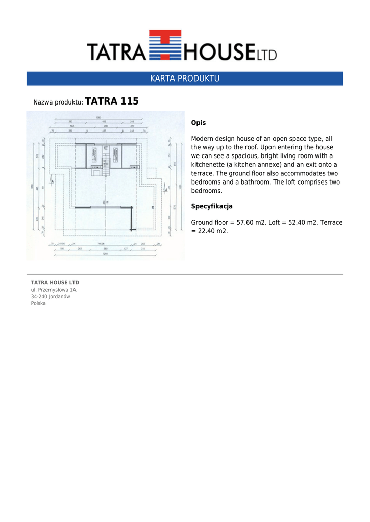 KARTA PRODUKTU Nazwa produktu: TATRA 115 Opis Modern design house of an open space type, all the way up to the roof. Upon entering the house we can see a spacious, bright living room with a kitchenette (a kitchen annexe) and an exit onto a terrace. The ground floor also accommodates two bedrooms and a bathroom. The loft comprises two bedrooms. Specyfikacja Ground floor = 57.60 m2. Loft = 52.40 m2. Terrace = 22.40 m2. TATRA HOUSE LTD ul. Przemysłowa 1A, 34-240 Jordanów Polska