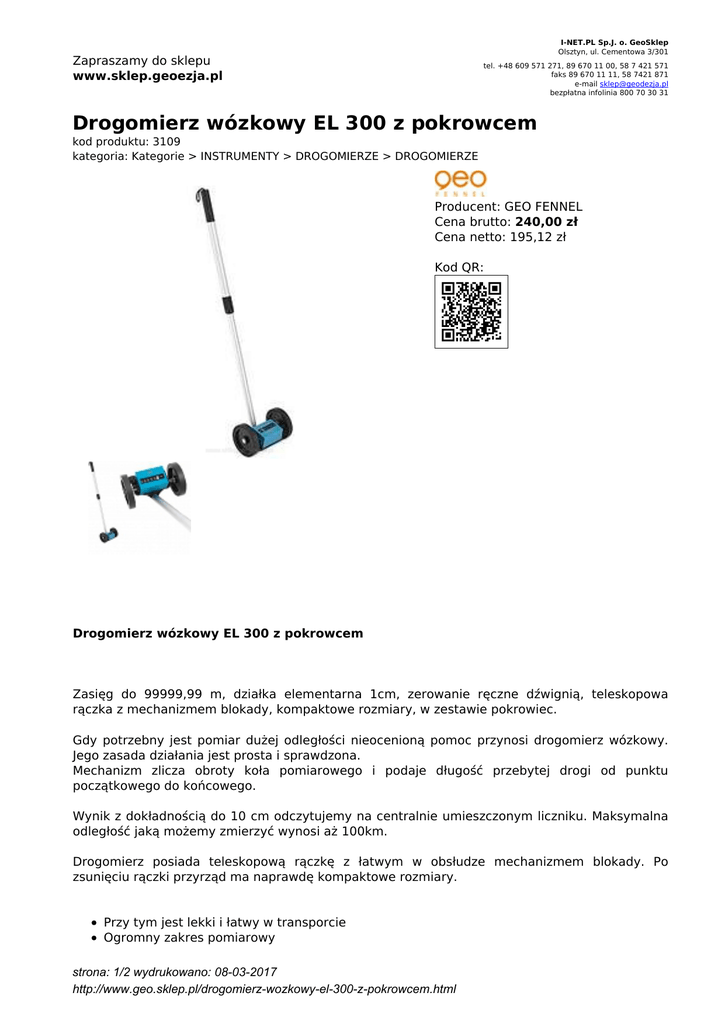 I-NET.PL Sp.J. o. GeoSklep Olsztyn, ul. Cementowa 3/301 Zapraszamy do sklepu www.sklep.geoezja.pl tel. +48 609 571 271, 89 670 11 00, 58 7 421 571 faks 89 670 11 11, 58 7421 871 e-mail [email protected] bezpłatna infolinia 800 70 30 31 Drogomierz wózkowy EL 300 z pokrowcem kod produktu: 3109 kategoria: Kategorie > INSTRUMENTY > DROGOMIERZE > DROGOMIERZE Producent: GEO FENNEL Cena brutto: 240,00 zł Cena netto: 195,12 zł Kod QR: Drogomierz wózkowy EL 300 z pokrowcem Zasięg do 99999,99 m, działka elementarna 1cm, zerowanie ręczne dźwignią, teleskopowa rączka z mechanizmem blokady, kompaktowe rozmiary, w zestawie pokrowiec. Gdy potrzebny jest pomiar dużej odległości nieocenioną pomoc przynosi drogomierz wózkowy. Jego zasada działania jest prosta i sprawdzona. Mechanizm zlicza obroty koła pomiarowego i podaje długość przebytej drogi od punktu początkowego do końcowego. Wynik z dokładnością do 10 cm odczytujemy na centralnie umieszczonym liczniku. Maksymalna odległość jaką możemy zmierzyć wynosi aż 100km. Drogomierz posiada teleskopową rączkę z łatwym w obsłudze mechanizmem blokady. Po zsunięciu rączki przyrząd ma naprawdę kompaktowe rozmiary. Przy tym jest lekki i łatwy w transporcie Ogromny zakres pomiarowy strona: 1/2 wydrukowano: 08-03-2017 http://www.geo.sklep.pl/drogomierz-wozkowy-el-300-z-pokrowcem.html Duży, czytelny licznik Kompaktowe rozmiary Rączka teleskopowa Dane techniczne: Zakres pomiarowy od 0 do 99999,99m Wartość działki elementarnej 0,01m Obwód koła pomiarowego 1/3m Zerowanie ręczne, dźwignią Masa (sam przyrząd) 819g strona: 2/2 wydrukowano: 08-03-2017 http://www.geo.sklep.pl/drogomierz-wozkowy-el-300-z-pokrowcem.html