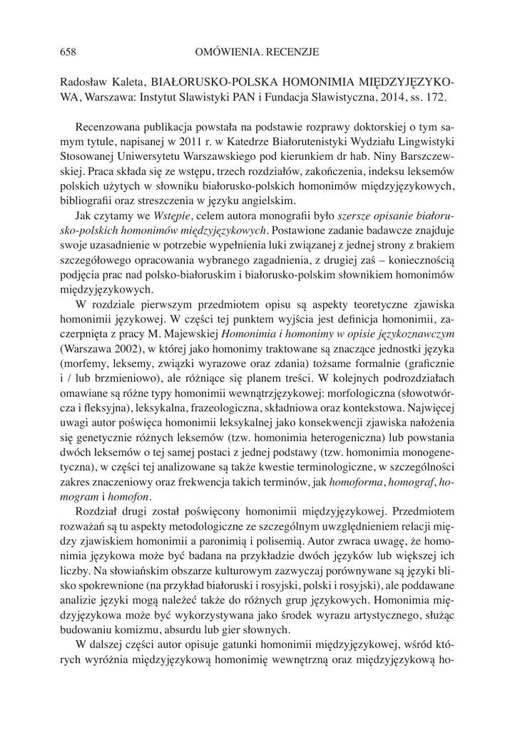 658 OMÓWIENIA. RECENZJE Radosław Kaleta, BIAŁORUSKO-POLSKA HOMONIMIA MIĘDZYJĘZYKOWA, Warszawa: Instytut Slawistyki PAN i Fundacja Slawistyczna, 2014, ss. 172. Recenzowana publikacja powstała na podstawie rozprawy doktorskiej o tym samym tytule, napisanej w 2011 r. w Katedrze Białorutenistyki Wydziału Lingwistyki Stosowanej Uniwersytetu Warszawskiego pod kierunkiem dr hab. Niny Barszczewskiej. Praca składa się ze wstępu, trzech rozdziałów, zakończenia, indeksu leksemów polskich użytych w słowniku białorusko-polskich homonimów międzyjęzykowych, bibliografii oraz streszczenia w języku angielskim. Jak czytamy we Wstępie, celem autora monografii było szersze opisanie białorusko-polskich homonimów międzyjęzykowych. Postawione zadanie badawcze znajduje swoje uzasadnienie w potrzebie wypełnienia luki związanej z jednej strony z brakiem szczegółowego opracowania wybranego zagadnienia, z drugiej zaś – koniecznością podjęcia prac nad polsko-białoruskim i białorusko-polskim słownikiem homonimów międzyjęzykowych. W rozdziale pierwszym przedmiotem opisu są aspekty teoretyczne zjawiska homonimii językowej. W części tej punktem wyjścia jest definicja homonimii, zaczerpnięta z pracy M. Majewskiej Homonimia i homonimy w opisie językoznawczym (Warszawa 2002), w której jako homonimy traktowane są znaczące jednostki języka (morfemy, leksemy, związki wyrazowe oraz zdania) tożsame formalnie (graficznie i / lub brzmieniowo), ale różniące się planem treści. W kolejnych podrozdziałach omawiane są różne typy homonimii wewnątrzjęzykowej: morfologiczna (słowotwórcza i fleksyjna), leksykalna, frazeologiczna, składniowa oraz kontekstowa. Najwięcej uwagi autor poświęca homonimii leksykalnej jako konsekwencji zjawiska nałożenia się genetycznie różnych leksemów (tzw. homonimia heterogeniczna) lub powstania dwóch leksemów o tej samej postaci z jednej podstawy (tzw. homonimia monogenetyczna), w części tej analizowane są także kwestie terminologiczne, w szczególności zakres znaczeniowy oraz frekwencja takich terminów, jak homoforma, homograf, homogram i homofon. Rozdział drugi został poświęcony homonimii międzyjęzykowej. Przedmiotem rozważań są tu aspekty metodologiczne ze szczególnym uwzględnieniem relacji między zjawiskiem homonimii a paronimią i polisemią. Autor zwraca uwagę, że homonimia językowa może być badana na przykładzie dwóch języków lub większej ich liczby. Na słowiańskim obszarze kulturowym zazwyczaj porównywane są języki blisko spokrewnione (na przykład białoruski i rosyjski, polski i rosyjski), ale poddawane analizie języki mogą należeć także do różnych grup językowych. Homonimia międzyjęzykowa może być wykorzystywana jako środek wyrazu artystycznego, służąc budowaniu komizmu, absurdu lub gier słownych. W dalszej części autor opisuje gatunki homonimii międzyjęzykowej, wśród których wyróżnia międzyjęzykową homonimię wewnętrzną oraz międzyjęzykową ho- OMÓWIENIA. RECENZJE 659 monimię zewnętrzną, a także homonimię homo- i heterogeniczną, pierwszo- i drugostopniową. Obszerny podrozdział dotyczy typologii homonimów językowych, zaczerpniętych między innymi z prac P. Stasińskiej, K. Wojan i R. Lipczuka. Poglądy wybranych lingwistów dotyczące homonimii są tu referowane szczegółowo. I tak, autor analizuje stan badań z zakresu homonimii polsko-słowackiej (na podstawie wyników badań M. Pančikovej), polsko-ukraińskiej (na podstawie dorobku M. Bednarz) oraz polsko-rosyjskiej (na podstawie publikacji P. Stasińskiej i Z. Grosbarta). Osobny rozdział został poświęcony przeglądowi prac białoruskich, dotyczących homonimii międzyjęzykowej. W części tej analizowane są osiągnięcia białoruskiej lingwistyki w zakresie opisu fałszywych przyjaciół w wybranych parach języków: białoruskim i niemieckim, białoruskim i włoskim, białoruskim i bułgarskim, białoruskim i ukraińskim, białoruskim i czeskim, białoruskim i chorwackim. Ze zrozumiałych względów najwięcej prac dotyczy homonimii białorusko-rosyjskiej, por. m.in. K. Kusal, Rosyjsko-polski słownik homonimów międzyjęzykowych (Warszawa 2002); W. Wychota, Беларуска-рускі слоўнік: міжмоўныя амонімы, паронімы і полісемія (Mińsk 2004); М. Smarszczok, E. Barysoglebskaja, Беларускія аднакарэнныя і сугучныя словы з рускімі адпаведнікамі (Mińsk 2002); S. Grabczikow, Межъязыковые омонимы и паронимы: Опыт словаря русско-белорусских омонимов и паронимов (Mińsk 1980); А. Szydłowskij, Лингвистические проблемы перевода на белорусский язык (Mińsk 1978). Rozdział trzeci zawiera analizę białorusko-polskich homonimów językowych. Jak dowodzi autor, opis badanej grupy świadczy o jej dużej różnorodności. Zbiór homonimów obejmuje zarówno homonimy całkowite, czyli takie, które różnią się w obu językach we wszystkich znaczeniach (por. brus. суткі, pol. doba), jak i niecałkowite, czyli takie, które występują w obydwu językach w co najmniej jednym znaczeniu, przy tym pozostałe ich znaczenia się różnią (por. brus. цмок, pol. 1. smok, 2. pot. cmoknięcie). W części tej czytelnik odnajdzie wykaz ponad siedemdziesięciu białorusko-polskich homonimów, reprezentujących literacką odmianę języka. Następnie autor omawia całkowite i niecałkowite białorusko-polskie homonimy leksykalno-gramatyczne, ze szczególnym uwzględnieniem imion męskich typu Янка, Алесь, Міхась oraz abrewiatur. Za właściwą część analizy należy uznać słownik białorusko-polskich homonimów całkowitych, opracowany na podstawie słowników definicyjnych współczesnego języka białoruskiego (są to: Тлумачальны сл