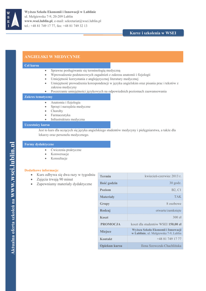 Wyższa Szkoła Ekonomii i Innowacji w Lublinie ul. Mełgiewska 7-9, 20-209 Lublin www.wsei.lublin.pl, e-mail: [email protected] tel.: +48 81 749 17 77, fax: +48 81 749 32 13 Kursy i szkolenia w WSEI ANGIELSKI W MEDYCYNIE Cel kursu Sprawne posługiwanie się terminologią medyczną Wprowadzenie podstawowych zagadnień z zakresu anatomii i fizjologii Umiejętność korzystania z anglojęzycznej literatury medycznej Umiejętność prowadzenia korespondencji w języku angielskim oraz pisania prac i tekstów z zakresu medycyny Poszerzanie umiejętności językowych na odpowiednich poziomach zaawansowania Zakres tematyczny Anatomia i fizjologia Sprzęt i narzędzia medyczne Choroby Farmaceutyka Infrastruktura medyczna Uczestnicy kursu Aktualna oferta szkoleń na www.wsei.lublin.pl Jest to kurs dla uczących się języka angielskiego studentów medycyny i pielęgniarstwa, a także dla lekarzy oraz personelu medycznego. Formy dydaktyczne Ćwiczenia praktyczne Konwersacje Konsultacje Dodatkowe informacje: Kurs odbywa się dwa razy w tygodniu Zajęcia trwają 90 minut Zapewniamy materiały dydaktyczne Termin Ilość godzin Poziom Materiały kwiecień-czerwiec 2013 r. 30 godz. B2, C1 TAK Grupy 8 osobowe Rodzaj otwarte/zamknięte Koszt 300 zł PROMOCJA koszt dla studentów WSEI 150,00 zł Miejsce Wyższa Szkoła Ekonomii i Innowacji w Lublinie, ul. Mełgiewska 7-9, Lublin Kontakt +48 81 749 17 77 Opiekun kursu Ilona Szewczuk-Chachlińska