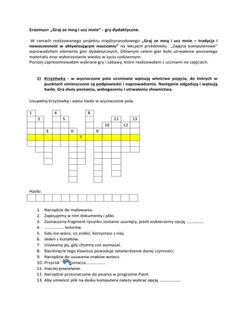 Erasmus+ „Graj ze mną i ucz mnie” - gry dydaktyczne. W ramach realizowanego projektu międzynarodowego „Graj ze mną i ucz mnie – tradycja i nowoczesność w aktywizującym nauczaniu” na lekcjach przedmiotu „Zajęcia komputerowe” wprowadziłam elementy gier dydaktycznych. Głównym celem gier było utrwalenie poznanego materiału oraz wykorzystanie wiedzy w życiu codziennym. Poniżej zaprezentowałam wybrane gry i zabawy, które realizowałam z uczniami na zajęciach. 1) Krzyżówka - w wyznaczone pola uczniowie wpisują właściwe pojęcia, do których w punktach umieszczone są podpowiedzi i naprowadzenia. Następnie odgadują i wpisują hasło. Gra służy poznaniu, wzbogaceniu i utrwaleniu słownictwa. Uzupełnij krzyżówkę i wpisz hasło w wyznaczone pola. 1 4 2 8 5 11 10 3 6 13 12 9 7 Hasło: 1. Narzędzie do malowania. 2. Zapisujemy w nim dokumenty i pliki. 3. Zaznaczony fragment rysunku zostanie usunięty, jeżeli wybierzemy opcję ……………. 4. ……………… kolorów. 5. Gdy nie wiesz, co zrobić, korzystasz z niej. 6. Jeden z kształtów. 7. Używamy jej, gdy chcemy coś wymazać. 8. Naciśnięcie tego klawisza powoduje zatwierdzenie danej czynności. 9. Narzędzie do usuwania znaków wstecz. 10. Przycisk oznacza …………….. 11. Inaczej powielanie. 12. Narzędzie przeznaczone do pisania w programie Paint. 13. Aby umieścić plik na dysku komputera należy wybrać opcję ………………. 2) Wykreślanka - polega na wyszukiwaniu wyrazów w diagramie. Wyrazy ułożone są poziomo, pionowo i po skosie. Uczniowie mają podaną listę pojęć i muszą je znaleźć, a następnie zaznaczyć kolorem. Gra służy poznaniu, wzbogaceniu i utrwaleniu słownictwa. Wykreśl (lub zaznacz kolorem) z tabeli następujące wyrazy: Edytor postaci, Logomocja, Treść, Kształty, Stalówki, Przybornik, Narzędzia, Łuk, Wygładzanie, Gumka, Elipsa L R A Z U W A S A R N E B N I M O K T R E Ś Ć T R A W E P O O U G A H D S E P I R V X E P J F A O W Y G Ł A D Z A N I E A D S K M T O M B F Ę D Z I A P R Z Y B O R N I K D R U T Y K O R A G R C E N T Z O D U P S T R E U P K J E M I L K Z A Z R O L M O K T A B A T O R Y W O D I K S Z T A Ł T Y R L E K L A P A T O C Z U H R Y J A A M A S T A L Ó W K I S Y N O G U R A E C Z K A R O W A N Y D Y M W S I T U D H E S D R A 3) Milionerzy - polega na wybieraniu spośród czterech propozycji właściwej odpowiedzi, która jest przepustką do kolejnej rundy. Każda runda jest coraz wyżej punktowana, a gra coraz bardziej emocjonująca. Jeśli nastąpi pomyłka, gra zostaje przerwana i trzeba zacząć od początku. Gra jest przykładem zdrowej rywalizacji i współpracy, utrwala słownictwo i uczy logicznego myślenia. 4) Wisielec - warunkiem wygranej jest odgadnięcie kluczowego słowa. Uczestnik otrzymuje podpowiedź i odgaduje poszczególne litery w wyrazie. Za każdy błąd, automatycznie dodawany jest fragment szubienicy z wisielcem. Gra utrwala pisownię słownictwa informatycznego. 5) Pary - gra polega na łączeniu w pary pojęć i rysunków, przedstawiających dane pojęcie, np. słowo „klawiatura” łączymy z obrazkiem, na którym widnieje dana część zestawu komputerowego. Gra przygotowuje do umiejętności praktycznego rozpoznawania elementów zestawu. Joanna PająK-Cieśla