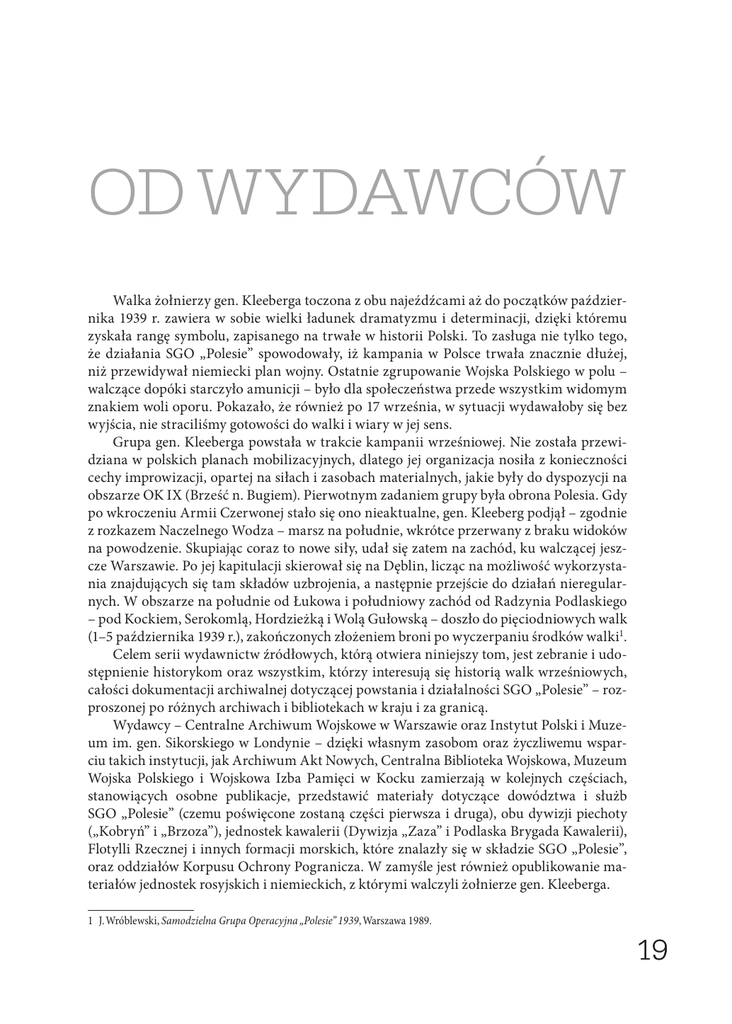OD WYDAWCÓW Walka żołnierzy gen. Kleeberga toczona z obu najeźdźcami aż do początków paździer nika 1939 r. zawiera w sobie wielki ładunek dramatyzmu i determinacji, dzięki któremu zyskała rangę symbolu, zapisanego na trwałe w historii Polski. To zasługa nie tylko tego, że działania SGO „Polesie” spowodowały, iż kampania w Polsce trwała znacznie dłużej, niż przewidywał niemiecki plan wojny. Ostatnie zgrupowanie Wojska Polskiego w polu – walczące dopóki starczyło amunicji – było dla społeczeństwa przede wszystkim widomym znakiem woli oporu. Pokazało, że również po 17 września, w sytuacji wydawałoby się bez wyjścia, nie straciliśmy gotowości do walki i wiary w jej sens. Grupa gen. Kleeberga powstała w trakcie kampanii wrześniowej. Nie została przewi dziana w polskich planach mobilizacyjnych, dlatego jej organizacja nosiła z konieczności cechy improwizacji, opartej na siłach i zasobach materialnych, jakie były do dyspozycji na obszarze OK IX (Brześć n. Bugiem). Pierwotnym zadaniem grupy była obrona Polesia. Gdy po wkroczeniu Armii Czerwonej stało się ono nieaktualne, gen. Kleeberg podjął – zgodnie z rozkazem Naczelnego Wodza – marsz na południe, wkrótce przerwany z braku widoków na powodzenie. Skupiając coraz to nowe siły, udał się zatem na zachód, ku walczącej jesz cze Warszawie. Po jej kapitulacji skierował się na Dęblin, licząc na możliwość wykorzysta nia znajdujących się tam składów uzbrojenia, a następnie przejście do działań nieregular nych. W obszarze na południe od Łukowa i południowy zachód od Radzynia Podlaskiego – pod Kockiem, Serokomlą, Hordzieżką i Wolą Gułowską – doszło do pięciodniowych walk (1–5 października 1939 r.), zakończonych złożeniem broni po wyczerpaniu środków walki1. Celem serii wydawnictw źródłowych, którą otwiera niniejszy tom, jest zebranie i udo stępnienie historykom oraz wszystkim, którzy interesują się historią walk wrześniowych, całości dokumentacji archiwalnej dotyczącej powstania i działalności SGO „Polesie” – roz proszonej po różnych archiwach i bibliotekach w kraju i za granicą. Wydawcy – Centralne Archiwum Wojskowe w Warszawie oraz Instytut Polski i Muze um im. gen. Sikorskiego w Londynie – dzięki własnym zasobom oraz życzliwemu wspar ciu takich instytucji, jak Archiwum Akt Nowych, Centralna Biblioteka Wojskowa, Muzeum Wojska Polskiego i Wojskowa Izba Pamięci w Kocku zamierzają w kolejnych częściach, stanowiących osobne publikacje, przedstawić materiały dotyczące dowództwa i służb SGO „Polesie” (czemu poświęcone zostaną części pierwsza i druga), obu dywizji piechoty („Kobryń” i „Brzoza”), jednostek kawalerii (Dywizja „Zaza” i Podlaska Brygada Kawalerii), Flotylli Rzecznej i innych formacji morskich, które znalazły się w składzie SGO „Polesie”, oraz oddziałów Korpusu Ochrony Pogranicza. W zamyśle jest również opublikowanie ma teriałów jednostek rosyjskich i niemieckich, z którymi walczyli żołnierze gen. Kleeberga. 1 J. Wróblewski, Samodzielna Grupa Operacyjna „Polesie” 1939, Warszawa 1989. 19 SGO „Polesie” w dokumentach i wspomnieniach Oprócz zachowanych dokumentów oraz relacji zebranych w czasie wojny we Francji, Rosji, Wielkiej Brytanii i Włoszech oraz bezpośrednio po jej zakończeniu w Niemczech i w Polsce, zgromadzonych następnie w IPMS i CAW oraz innych, wymienionych wcześniej instytucjach, w wydawnictwie wykorzystane zostaną zbiory Środowiska Kleeberczyków. Powstało ono w październiku 1969 r. jako działający w ramach stołecznego Związku Bojowników o Wolność i Demokrację klub kombatantów, byłych żołnierzy walczących w obronie Polesia, a następnie w Samodzielnej Grupie Operacyjnej „Polesie” pod dowódz twem gen. bryg. Franciszka Kleeberga. Później Środowisko Kleeberczyków rozszerzyło swoją działalność na teren całego kraju. Ważną rolę w działalności środowiska odgrywała Sekcja Historyczna, która za za sadniczy cel działania obrała sobie zbieranie materiałów historycznych od uczestników walk kampanii wrześniowej. Funkcję jej sekretarza pełnił w latach 1973–1983 Henryk Jasionowski, w czasie kampanii wrześniowej dowódca kompanii 83 pp Dywizji „Kobryń”. To głównie dzięki jego działalności do 31 sierpnia 1983 r. Komisja Historyczna zgromadzi ła 619 relacji oraz 583 ankiety osobowe. Jasionowski zajmował się archiwizacją zebranych materiałów, oddając na ten cel jeden pokój w swoim mieszkaniu. W ten sposób doszło do połączenia osobistych zbiorów Henryka Jasionowskiego ze zbiorami Środowiska. Po śmier ci Henryka Jasionowskiego w 1983 r. prowadzeniem archiwum – za zgodą Kleeberczyków – zajęła się jego żona Barbara Jasionowska. We wrześniu 2008 r. archiwum Środowiska Kleeberczyków trafiło do Centralnego Archiwum Wojskowego i zostało nazwane kolekcją SGO „Polesie” Henryka Jasionowskiego. W jej skład wchodzi 716 relacji, 839 ankiet oraz wiele innych materiałów, w tym doku mentacja Komisji Historycznej. Łącznie z archiwaliami wcześniej zgromadzonymi w CAW i Wojskowym Instytucie Historycznym2 tworzy to największy zbiór dotyczący dziejów SGO „Polesie”. *** W części pierwszej, którą stanowi niniejszy tom, zebrano zachowane dokumenty – w liczbie ponad trzystu3– głównie wytworzone przez dowództwo grupy oraz dowódz twa zgrupowań, a następnie dywizji „Kobryń” i „Brzoza”. Należy zaznaczyć, że ocalała większość rozkazów dowództwa SGO „Polesie” z drugiej połowy września i początków października, ale jeśli chodzi o dokumentację z okresu wcześniejszego, zwłaszcza między 10 a 18 września, to niestety dysponujemy jedynie jej ułamkową częścią4. Nie dotrwały do naszych czasów również – poza rozkazami i meldunkami przesyłanymi gen. Kleebergowi, znajdującymi się w aktach dowództwa grupy – materiały 
