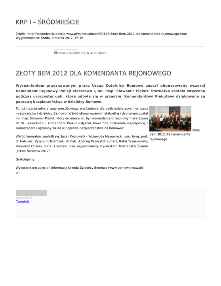KRP I – ŚRÓDMIEŚCIE Źródło: http://srodmiescie.policja.waw.pl/rs/aktualnosci/33146,Zloty-Bem-2012-dla-komendanta-rejonowego.html Wygenerowano: Środa, 8 marca 2017, 16:16 Strona znajduje się w archiwum. ZŁOTY BEM 2012 DLA KOMENDANTA REJONOWEGO Wyróżnieniem przyznawanym przez Urząd Dzielnicy Bemowo został uhonorowany wczoraj Komendant Rejonowy Policji Warszawa I, mł. insp. Sławomir Piekut. Statuetka została wręczona podczas uroczystej gali, która odbyła się w urzędzie. Komendantowi Piekutowi dziękowano za poprawę bezpieczeństwa w dzielnicy Bemowo. To już trzecia edycja tego prestiżowego wyróżnienia dla osób działających na rzecz mieszkańców i dzielnicy Bemowo. Wśród uhonorowanych statuetką i dyplomem został mł. insp. Sławomir Piekut, który do marca br. był komendantem rejonowym Warszawa IV. W uzasadnieniu komendant Piekut usłyszał słowa “Za doskonałą współpracę z samorządem i ogromny wkład w poprawę bezpieczeństwa na Bemowie”. Wśród laureatów znaleźli się: Jacek Kozłowski – Wojewoda Mazowiecki, gen. bryg. prof. dr hab. inż. Zygmunt Mierczyk, dr hab. Andrzej Krzysztof Kunert, Rafał Trzaskowski, Romuald Chałas, Rafał Lisowski oraz organizatorzy Rycerskich Mistrzostw Świata „Bitwa Narodów 2012”. Gratulujemy! Wykorzystano zdjęcie i informację Urzędu Dzielnicy Bemowo (www.bemowo.waw.pl) ah Ocena: 0/5 (0) Tweetnij Złoty Bem 2012 dla komendanta rejonowego