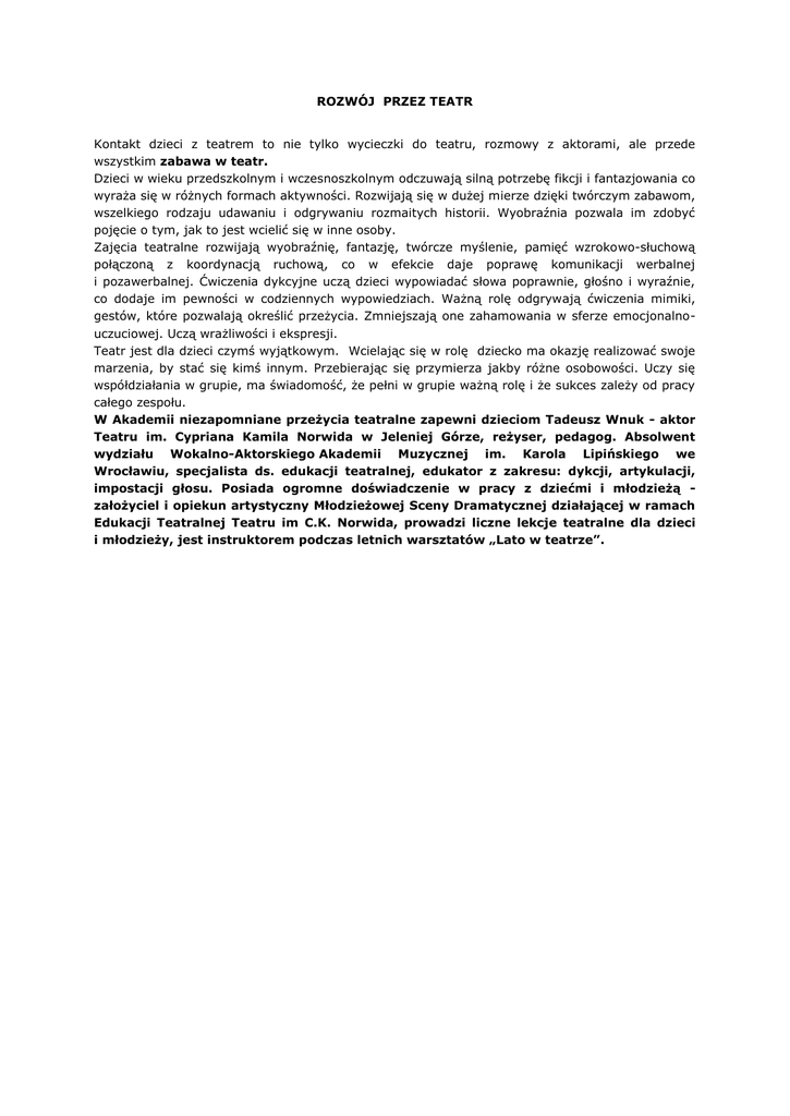 ROZWÓJ PRZEZ TEATR Kontakt dzieci z teatrem to nie tylko wycieczki do teatru, rozmowy z aktorami, ale przede wszystkim zabawa w teatr. Dzieci w wieku przedszkolnym i wczesnoszkolnym odczuwają silną potrzebę fikcji i fantazjowania co wyraża się w różnych formach aktywności. Rozwijają się w dużej mierze dzięki twórczym zabawom, wszelkiego rodzaju udawaniu i odgrywaniu rozmaitych historii. Wyobraźnia pozwala im zdobyć pojęcie o tym, jak to jest wcielić się w inne osoby. Zajęcia teatralne rozwijają wyobraźnię, fantazję, twórcze myślenie, pamięć wzrokowo-słuchową połączoną z koordynacją ruchową, co w efekcie daje poprawę komunikacji werbalnej i pozawerbalnej. Ćwiczenia dykcyjne uczą dzieci wypowiadać słowa poprawnie, głośno i wyraźnie, co dodaje im pewności w codziennych wypowiedziach. Ważną rolę odgrywają ćwiczenia mimiki, gestów, które pozwalają określić przeżycia. Zmniejszają one zahamowania w sferze emocjonalnouczuciowej. Uczą wrażliwości i ekspresji. Teatr jest dla dzieci czymś wyjątkowym. Wcielając się w rolę dziecko ma okazję realizować swoje marzenia, by stać się kimś innym. Przebierając się przymierza jakby różne osobowości. Uczy się współdziałania w grupie, ma świadomość, że pełni w grupie ważną rolę i że sukces zależy od pracy całego zespołu. W Akademii niezapomniane przeżycia teatralne zapewni dzieciom Tadeusz Wnuk - aktor Teatru im. Cypriana Kamila Norwida w Jeleniej Górze, reżyser, pedagog. Absolwent wydziału Wokalno-Aktorskiego Akademii Muzycznej im. Karola Lipińskiego we Wrocławiu, specjalista ds. edukacji teatralnej, edukator z zakresu: dykcji, artykulacji, impostacji głosu. Posiada ogromne doświadczenie w pracy z dziećmi i młodzieżą założyciel i opiekun artystyczny Młodzieżowej Sceny Dramatycznej działającej w ramach Edukacji Teatralnej Teatru im C.K. Norwida, prowadzi liczne lekcje teatralne dla dzieci i młodzieży, jest instruktorem podczas letnich warsztatów „Lato w teatrze”.