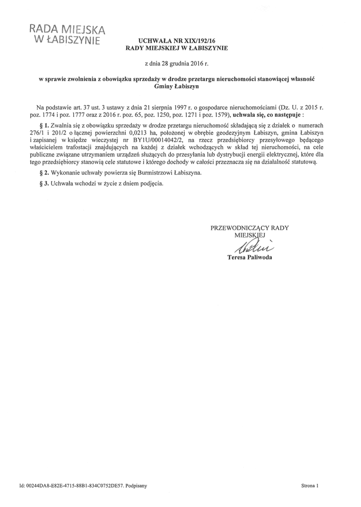 RADA MIEJSKA W ŁAB l SZYN l E UCHWAŁA NR xix/i92/i6 RADY MIEJSKIEJ W ŁABISZYNIE z dnia 28 grudnia 2016 r. w sprawie zwolnienia z obowiązku sprzedaży w drodze przetargu nieruchomości stanowiącej własność Gminy Łabiszyn Na podstawie art. 37 ust. 3 ustawy z dnia 21 sierpnia 1997 r. o gospodarce nieruchomościami (Dz. U. z 2015 r. póz. 1774 i póz. 1777 oraz z 2016 r. póz. 65, póz. 1250, póz. 1271 i póz. 1579), uchwala się, co następuje : § 1. Zwalnia się z obowiązku sprzedaży w drodze przetargu nieruchomość składającą się z działek o numerach 276/1 i 201/2 o łącznej powierzchni 0,0213 ha, położonej w obrębie geodezyjnym Łabiszyn, gmina Łabiszyn i zapisanej w księdze wieczystej nr B Y l U/00014042/2, na rzecz przedsiębiorcy przesyłowego będącego właścicielem trafostacji znajdujących na każdej z działek wchodzących w skład tej nieruchomości, na cele publiczne związane utrzymaniem urządzeń służących do przesyłania lub dystrybucji energii elektrycznej, które dla tego przedsiębiorcy stanowią cele statutowe i którego dochody w całości przeznacza się na działalność statutową. § 2. Wykonanie uchwały powierza się Burmistrzowi Łabiszyna. § 3. Uchwała wchodzi w życie z dniem podjęcia. PRZEWODNICZĄCY RADY MIEJSKIEJ Teresa Paliwoda Id: 00244DA8-E82E-4715-88B1-834C0752DE57. Podpisany Strona l Uzasadnienie Rada Miejska w Łabiszynie zgodnie z powołaną podstawą prawną może zwolnić z obowiązku sprzedaży w drodze przetargu nieruchomość gminną przeznaczoną na realizację celów publicznych m. in. związanych z utrzymaniem urządzeń służących do przesyłania lub dystrybucji energii elektrycznej na rzecz podmiotu, dla którego stanowią one cele statutowe i którego dochody w całości przeznacza się na działalność statutową. Do Burmistrza Łabiszyna zwrócił się z wnioskiem przedsiębiorca będący właścicielem urządzeń przesyłowych, które nie stanowią części składowych gruntu, o nabycie przedmiotowej nieruchomości w drodze bezprzetargowej. Wniosek ten uzasadnił tym, że na gruncie znajdują się trafostacje, które wchodzą w skład jego przedsiębiorstwa, a nabycie przedmiotowej nieruchomości nastąpi na realizację wyżej wskazanego celu publicznego. Ponadto przedsiębiorca oświadczył, że realizacja przedmiotowych celów publicznych stanowi jego cele statutowe, a uzyskane dochody w całości przeznacza się na działalność statutową. Wspomniane trafostacje zajmują niemal całą powierzchnię każdej z działek, na których się znajdują. Z wnioskiem o nabycie przedmiotowej nieruchomości nie zwróciły się inne osoby, które by spełniały warunki wynikające z art. 37 ust. 3 ustawy o gospodarce nieruchomościami. Wobec tego zasadnym jest podjąć niniejszą uchwałę. PRZEWODNICZĄCY RADY MIEJSKIEJ v Teresa Paliwoda Id: 00244DA8-E82E-4715-88B1-834C0752DE57. Podpisany Strona l