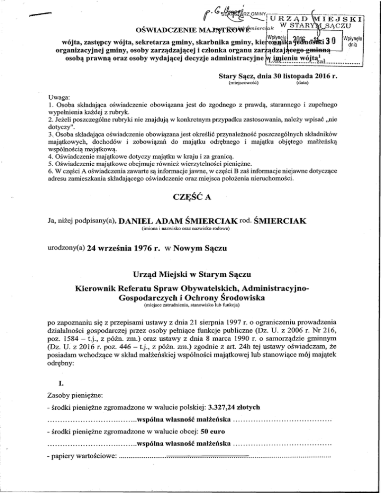 URZĄD O ŚW IA D CZEN IE M A J ^ T R o W fim ak lEJSKi W STAR1 i ^SĄ C ZU wójta, zastępcy wójta, sekretarza gminy, skarbnika gminy, kiei 'owipk a^tftioJiki 3 organizacyjnej gminy, osoby zarządzającej i członka organu zarządzającego gminną osobą prawną oraz osoby wydającej decyzje administracyjne Wymieniu wójta1^ Stary Sącz, dnia 30 listopada 2016 r. (miejscowość) (data) Uwaga: 1. Osoba składająca oświadczenie obowiązana jest do zgodnego z prawdą, starannego i zupełnego wypełnienia każdej z rubryk. 2. Jeżeli poszczególne rubryki nie znajdują w konkretnym przypadku zastosowania, należy wpisać „nie dotyczy". 3. Osoba składająca oświadczenie obowiązana jest określić przynależność poszczególnych składników majątkowych, dochodów i zobowiązań do majątku odrębnego i majątku objętego małżeńską wspólnością majątkową. 4. Oświadczenie majątkowe dotyczy majątku w kraju i za granicą. 5. Oświadczenie majątkowe obejmuje również wierzytelności pieniężne. 6. W części A oświadczenia zawarte są informacje jawne, w części B zaś informacje niejawne dotyczące adresu zamieszkania składającego oświadczenie oraz miejsca położenia nieruchomości. CZĘŚĆ A Ja, niżej podpisany(a), DANIEL ADAM ŚMIERCIAK rod. ŚMIERCIAK (imiona i nazwisko oraz nazwisko rodowe) urodzony(a) 24 września 1976 r. w Nowym Sączu Urząd Miejski w Starym Sączu Kierownik Referatu Spraw Obywatelskich, AdministracyjnoGospodarczych i Ochrony Środowiska (miejsce zatrudnienia, stanowisko lub funkcja) po zapoznaniu się z przepisami ustawy z dnia 21 sierpnia 1997 r. o ograniczeniu prowadzenia działalności gospodarczej przez osoby pełniące funkcje publiczne (Dz. U. z 2006 r. Nr 216, poz. 1584 - t.j., z późn. zm.) oraz ustawy z dnia 8 marca 1990 r. o samorządzie gminnym (Dz. U. z 2016 r. poz. 446 - t.j., z późn. zm.) zgodnie z art. 24h tej ustawy oświadczam, że posiadam wchodzące w skład małżeńskiej wspólności majątkowej lub stanowiące mój majątek odrębny: I. Zasoby pieniężne: - środki pieniężne zgromadzone w walucie polskiej: 3.327,24 złotych .......................................... ...wspólna własność małżeńska.............. - środki pieniężne zgromadzone w walucie obcej: 50 euro ...........................................wspólna własność małżeńska.............. - papiery wartościowe: Wpłynęło dnia na kwotę: II. 1. Dom o powierzchni: 151,50 m2, o wartości: 450.000 złotych, tytuł prawny: wspólna własność małżeńska. 2. Mieszkanie o powierzchni: . ttttt. m2, o wartości: 3. Gospodarstwo rolne: rodzaj gospodarstwa: o wartości: . tttttt. . rodzaj zabudowy: . tttttt. . , . tttttt.. . tttttt. . , tytuł prawny: powierzchnia: tytuł prawny: . tttttt.. . tttttt.. . tttttt.. Z tego tytułu osiągnąłem(ęłam) w roku ubiegłym przychód i dochód w wysokości: . tttttt.. 4. Inne nieruchomości: powierzchnia: działka 0,1870 ha o wartości: 100.000 złotych tytuł prawny: własność składającego oświadczenie. III. Posiadam udziały w spółkach handlowych - należy podać liczbę i emitenta ud ziałó w :............. ..............................................................Nie dotyczy.................................................................. udziały te stanowią pakiet większy niż 10% udziałów w spółce:...................................... ............. Z tego tytułu osiągnąłem(ęłam) w roku ubiegłym dochód w w ysokości:..................................... IV. Posiadam akcje w spółkach handlowych - należy podać liczbę i emitenta a k c ji:....................... .............................................................. Nie dotyczy ............................ .................................... akcje te stanowią pakiet większy niż 10% akcji w spółce:............................................................. Z tego tytułu osiągnąłem(ęłam) w roku ubiegłym dochód w w ysokości:.... .................... ........... V. Nabyłem(am) (nabył mój małżonek, z wyłączeniem mienia przynależnego do jego majątku odrębnego) od Skarbu Państwa, innej państwowej osoby prawnej, jednostek samorządu terytorialnego, ich związków lub od komunalnej osoby prawnej następujące mienie, które podlegało zbyciu w drodze przetargu - należy podać opis mienia i datę nabycia, od k o g o :....... ...................................... ........................Nie dotyczy........................................................... ...... VI. 1. Prowadzę działalność gospodarczą2 (należy podać formę prawną i przedmiot działalności): . Nie dotyczy............. ................................................... - osobiście.............................. - wspólnie z innymi osobami Z tego tytułu osiągnąłem(ęłam) w roku ubiegłym przychód i dochód w w ysokości:.............. 2. Zarządzam działalnością gospodarczą lub jestem przedstawicielem pełnomocnikiem takiej działalności (należy podać formę prawną i przedmiot działalności): ............... ........ ..............................................................Nie dotyczy............... .................................................. - osobiście ......................................... ................. .................... ................... ........................................ - wspólnie z innymi osobam i............ ......................... .................................... ................................ Z tego tytułu osiągnąłem(ęłam) w roku ubiegłym dochód w w ysokości:....................... —....... VII. 1. W spółkach handlowych (nazwa, siedziba spółki):....................Nie d o ty c zy ....... - jestem członkiem zarządu (od k ied y ):....................... ....... ......... ......... ......... ......... . - jestem członkiem rady nadzorczej (od k ied y ):....................................................... . - jestem członkiem komisji