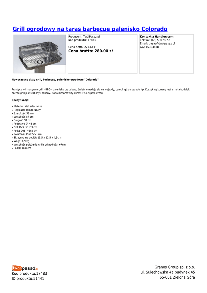 Grill ogrodowy na taras barbecue palenisko Colorado Producent: TwójPasaż.pl Kod produktu: 17483 Cena netto: 227,64 zł Kontakt z Handlowcem: Tel/Fax: (68) 506 50 56 Email: [email protected] GG: 45303488 Cena brutto: 280.00 zł Nowoczesny duży grill, barbecue, palenisko ogrodowe "Colorado" Praktyczny i masywny grill - BBQ - palenisko ogrodowe, świetnie nadaje się na wyjazdy, campingi, do ogrodu itp. Koszyk wykonany jest z metalu, dzięki czemu grill jest stabilny i solidny. Nada niesamowity klimat Twojej przestrzeni. Specyfikacja: ● ● ● ● ● ● ● ● ● ● ● ● ● Materiał: stal szlachetna Regulator temperatury Szerokość 38 cm Wysokość 87 cm Długość 58 cm Podstawa Ø: 43 cm Grill DxS: 53x33 cm Półka DxS: 46x8 cm Kolumna: 15x12x58 cm Skrzynka na popiół: 15,5 x 12,5 x 4,5cm Waga: 6,9 kg Wysokość położenia grilla od podłoża: 67cm Półka: 46x8cm Kod produktu:17483 ID produktu:51441 Granos Group sp. z o.o. ul. Sulechowska 4a budynek 45 65-001 Zielona Góra