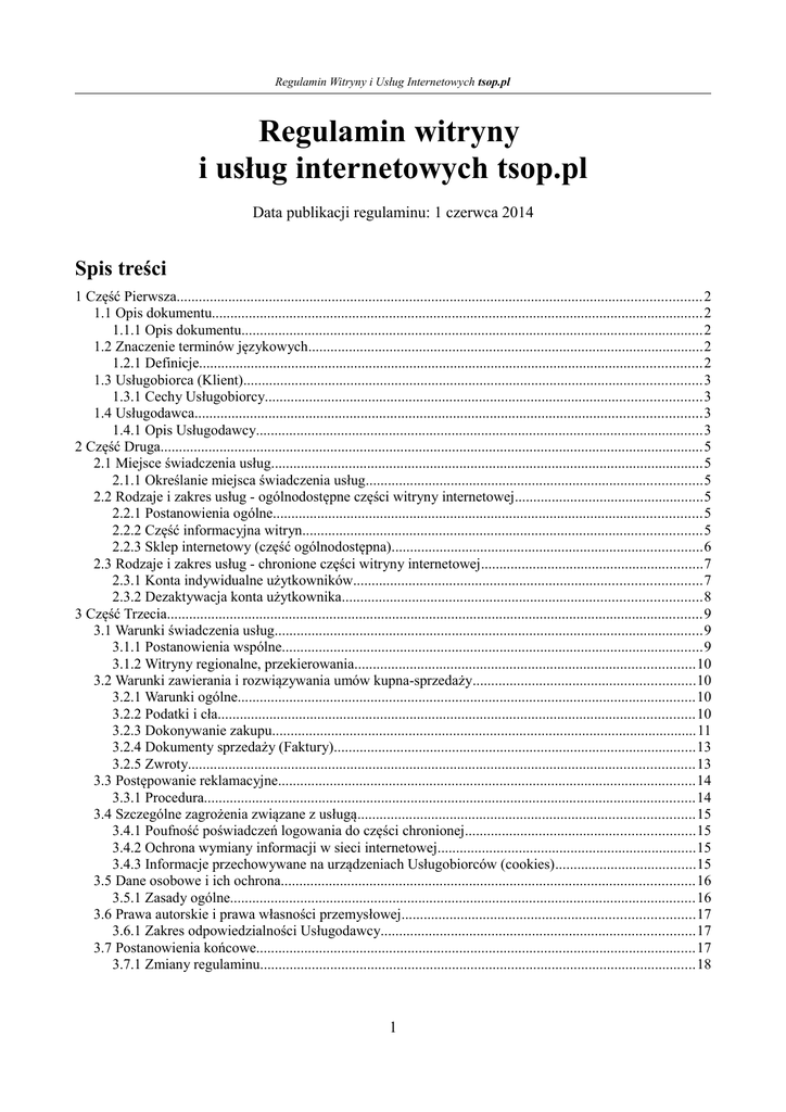 Regulamin Witryny i Usług Internetowych tsop.pl Regulamin witryny i usług internetowych tsop.pl Data publikacji regulaminu: 1 czerwca 2014 Spis treści 1 Część Pierwsza..............................................................................................................................................2 1.1 Opis dokumentu.....................................................................................................................................2 1.1.1 Opis dokumentu.............................................................................................................................2 1.2 Znaczenie terminów językowych...........................................................................................................2 1.2.1 Definicje........................................................................................................................................2 1.3 Usługobiorca (Klient)............................................................................................................................3 1.3.1 Cechy Usługobiorcy......................................................................................................................3 1.4 Usługodawca.........................................................................................................................................3 1.4.1 Opis Usługodawcy.........................................................................................................................3 2 Część Druga...................................................................................................................................................5 2.1 Miejsce świadczenia usług.....................................................................................................................5 2.1.1 Określanie miejsca świadczenia usług...........................................................................................5 2.2 Rodzaje i zakres usług - ogólnodostępne części witryny internetowej...................................................5 2.2.1 Postanowienia ogólne....................................................................................................................5 2.2.2 Część informacyjna witryn............................................................................................................5 2.2.3 Sklep internetowy (część ogólnodostępna)....................................................................................6 2.3 Rodzaje i zakres usług - chronione części witryny internetowej............................................................7 2.3.1 Konta indywidualne użytkowników..............................................................................................7 2.3.2 Dezaktywacja konta użytkownika.................................................................................................8 3 Część Trzecia.................................................................................................................................................9 3.1 Warunki świadczenia usług....................................................................................................................9 3.1.1 Postanowienia wspólne..................................................................................................................9 3.1.2 Witryny regionalne, przekierowania............................................................................................10 3.2 Warunki zawierania i rozwiązywania umów kupna-sprzedaży............................................................10 3.2.1 Warunki ogólne............................................................................................................................10 3.2.2 Podatki i cła.................................................................................................................................10 3.2.3 Dokonywanie zakupu...................................................................................................................11 3.2.4 Dokumenty sprzedaży (Faktury)..................................................................................................13 3.2.5 Zwroty.........................................................................................................................................13 3.3 Postępowanie reklamacyjne.................................................................................................................14 3.3.1 Procedura.....................................................................................................................................14 3.4 Szczególne zagrożenia związane z usługą...........................................................................................15 3.4.1 Poufność poświadczeń logowania do części chronionej..............................................................15 3.4.2 Ochrona wymiany informacji w sieci internetowej......................................................................15 3.4.3 Informacje przechowywane na urządzeniach Usługobiorców (cookies)......................................15 3.5 Dane osobowe i ich ochrona................................................................................................................16 3.5.1 Zasady ogólne..............................................................................................................................16 3.6 Prawa autorskie i prawa własności przemysłowej...............................................................................17 3.6.1 Zakres odpowiedzialności Usługodawcy.....................................................................................17 3.7 Postanowienia końcowe.......................................................................................................................17 3.7.1 Zmiany regulaminu..........................................................................................