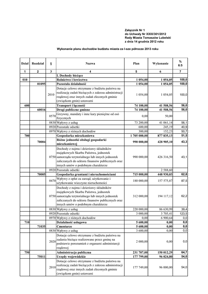 Załącznik Nr 1 do Uchwały Nr XXIX/301/2012 Rady Miasta Tomaszów Lubelski z dnia 14 grudnia 2012 roku Wykonanie planu dochodów budżetu miasta za I-sze półrocze 2013 roku Dział Rozdział 1 2 010 01095 600 60016 700 70004 70005 710 71035 750 75011 § Nazwa 3 4 I. Dochody bieżące Rolnictwo i łowiectwo Pozostała działalność Dotacje celowe otrzymane z budżetu państwa na realizację zadań bieżących z zakresu administracji 2010 rządowej oraz innych zadań zleconych gminie (związkom gmin) ustawami Transport i łączność Drogi publiczne gminne Grzywny, mandaty i inne kary pieniężne od osó 0570 fizycznych 0830 Wpływy z usług 0920 Pozostałe odsetki 0970 Wpływy z różnych dochodów Gospodarka mieszkaniowa Różne jednostki obsługi gospodarki mieszkaniowej Dochody z najmu i dzierżawy składników majątkowych Skarbu Państwa, jednostek 0750 samorządu terytorialnego lub innych jednostek zaliczanych do sektora finansów publicznych oraz innych umów o podobnym charakterze 0920 Pozostałe odsetki Gospodarka gruntami i nieruchomościami Wpływy z opłat za zarząd, użytkowanie i 0470 użytkowanie wieczyste nieruchomości Dochody z najmu i dzierżawy składników majątkowych Skarbu Państwa, jednostek 0750 samorządu terytorialnego lub innych jednostek zaliczanych do sektora finansów publicznych oraz innych umów o podobnym charakterze 0830 Wpływy z usług 0920 Pozostałe odsetki 0970 Wpływy z różnych dochodów Działalność usługowa Cmentarze 0830 Wpływy z usług Dotacje celowe otrzymane z budżetu państwa na zadania bieżące realizowane przez gminę na 2020 podstawie porozumień z organami administarcji rządowej Administracja publiczna Urzędy wojewódzkie Dotacje celowe otrzymane z budżetu państwa na realizację zadań bieżących z zakresu administracji 2010 rządowej oraz innych zadań zleconych gminie (związkom gmin) ustawami Plan Wykonanie % 6:5 5 6 7 1 054,00 1 054,00 1 054,05 1 054,05 100,0 100,0 1 054,00 1 054,05 100,0 74 100,00 74 100,00 41 508,56 41 508,56 56,0 56,0 0,00 50,00 73 200,00 600,00 300,00 1 705 000,00 41 061,14 245,19 152,23 877 835,13 56,1 40,9 50,7 51,5 990 000,00 428 905,10 43,3 990 000,00 426 316,50 43,1 715 000,00 2 588,60 448 930,03 62,8 180 000,00 157 575,87 87,5 312 000,00 194 117,12 62,2 220 000,00 3 000,00 0,00 5 600,00 5 600,00 3 600,00 86 630,99 3 705,41 6 900,64 0,00 0,00 0,00 39,4 123,5 0,0 0,0 0,0 0,0 2 000,00 0,00 0,0 231 707,00 177 799,00 150 012,29 96 024,80 64,7 54,0 177 749,00 96 000,00 54,0 75023 Dochody jednostek samorządu terytorialnego związane z realizacją zadań z zakresu 2360 administracji rządowej oraz innych zadań zleconych ustawami Urzędy gmin (miast i miast na prawach powiatu) Dochody z najmu i dzierżawy składników majątkowych Skarbu Państwa, jednostek 0750 samorządu terytorialnego lub innych jednostek zaliczanych do sektora finansów publicznych oraz innych umów o podobnym charakterze 0830 Wpływy z usług 0920 Pozostałe odsetki 0970 Wpływy z różnych dochodów 50,00 24,80 49,6 24 700,00 53 987,49 218,6 0,00 8 415,13 0,0 16 100,00 8 000,00 600,00 9 483,72 35 567,80 520,84 58,9 444,6 86,8 Promocja jednostek samorządu terytorialnego 29 208,00 0,00 0,0 Dotacje celowe w ramach programów finansowanych z udziałem środków europejskich 2007 oraz środków, o krórych mowa w art.5 ust.1 pkt 3 oraz ust. 3 pkt 5 i 6 ustawy, lub płatności w ramach budżetu środków europejskich 29 208,00 0,00 0,0 3 619,00 1 807,00 49,9 3 619,00 1 807,00 49,9 3 619,00 1 807,00 49,9 1 000,00 1 000,00 1 000,00 1 000,00 100,0 100,0 1 000,00 1 000,00 100,0 25 000,00 10 609,66 42,4 25 000,00 10 609,66 42,4 25 000,00 10 609,66 42,4 24 351 754,00 11 584 100,52 47,6 40 200,00 19 857,58 49,4 40 000,00 19 663,20 49,2 200,00 194,38 97,2 5 326 075,00 2 925 024,11 54,9 4 800 000,00 2 610 020,12 54,4 75075 751 75101 752 75212 754 75416 756 75601 75615 Urzędy naczelnych organów władzy państwowej, kontroli i ochrony prawa oraz sądownictwa Urzędy naczelnych organów władzy państwowej, kontroli i ochrony prawa Dotacje celowe otrzymane z budżetu państwa na realizację zadań bieżących z zakresu administracji 2010 rządowej oraz innych zadań zleconych gminie (związkom gmin) ustawami Obrona narodowa Pozostałe wydatki obronne Dotacje celowe otrzymane z budżetu państwa na realizację zadań bieżących z zakresu administracji 2010 rządowej oraz innych zadań zleconych gminie (związkom gmin) ustawami Bezpieczeństwo publiczne i ochrona przeciwpożarowa Straż gminna (miejska) Grzywny, mandaty i inne kary pieniężne od osó 0570 fizycznych Dochody od osób prawnych, od osób fizycznych i od innych jednostek nieposiadających osobowości prawnej oraz wydatki związane z ich poborem Wpływy z podatku dochodowego od osób fizycznych 0350 Podatek od działalności gospodarczej osób fizycznych, opłacany w formie karty podatkowej 0910 Odsetki od nieterminowych wpłat z tytułu podatków i opłat Wpływy z podatku rolnego, podatku leśnego, podatku od czynności cywilnoprawnych, podatków i opłat lokalnych od osób prawnych i innych jednostek organizacyjnych 0310 Podatek od nieruchomości 0320 Podatek rolny 0330 Podatek leśny 0340 Podatek od środków transportowych 0500 Podatek od czynności cywilnoprawnych Odsetki od nieterminowych wpłat z tytułu 0910 podatków i opłat 75616 75618 75619 75621 758 75801 75807 75814 75831 801 80101 80104 Wpływy z podatku rolnego, podatku leśnego, podatku od spadków i darowizn, podatku od czynności cywilnoprawnych oraz podatków i opłat lokalnych od osób fizycznych 0310 Podatek od nieruchomości 0320 Podatek rolny 0330 Podatek leśny 0340 Podatek od środków transportowych 0360 Podatek od spadków i darowizn 0370 Opłata od posiadania psów 0430 Wpływy z opłaty targowej 0440 Wpływy z opłaty miejscowej 0500 Podatek od czynności cywilnoprawnych Odsetki od nieterminowych wpłat z tytułu 0910 podatków i opłat Wpływy z innych opłat stanowiących dochody jednostek sam