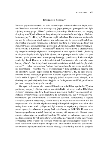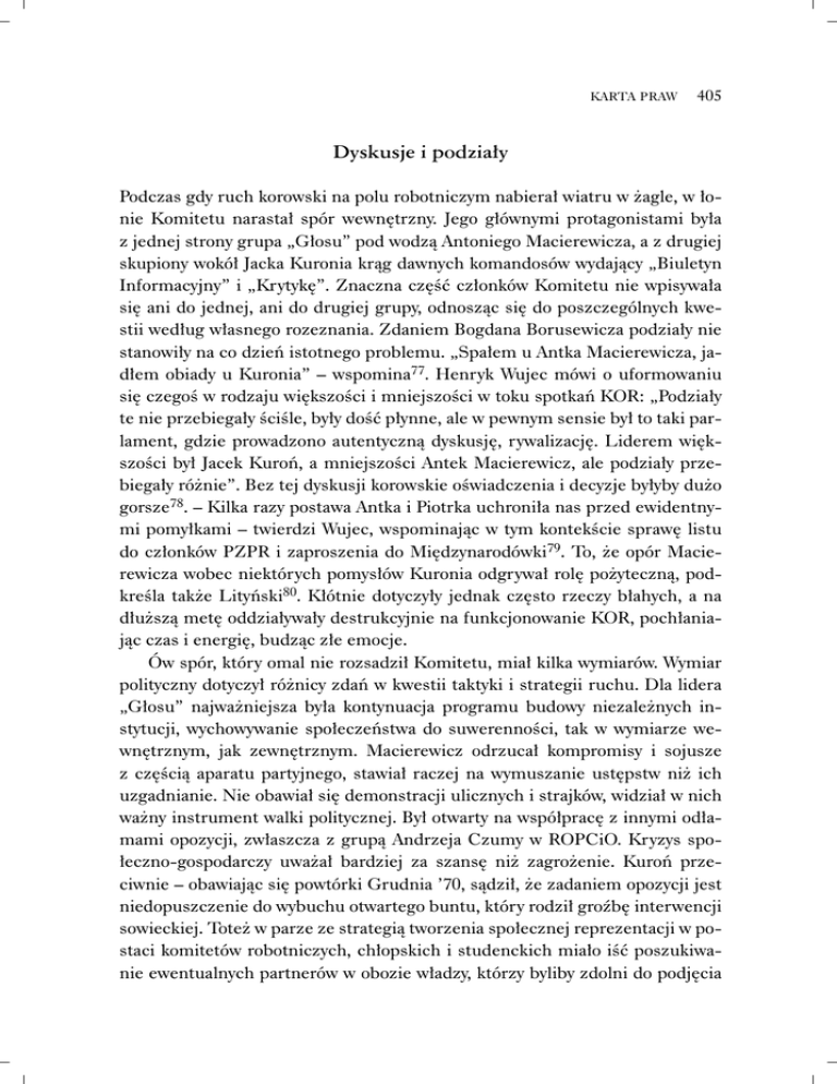 KARTA PRAW 405 Dyskusje i podziały Podczas gdy ruch korowski na polu robotniczym nabierał wiatru w żagle, w łonie Komitetu narastał spór wewnętrzny. Jego głównymi protagonistami była z jednej strony grupa „Głosu” pod wodzą Antoniego Macierewicza, a z drugiej skupiony wokół Jacka Kuronia krąg dawnych komandosów wydający „Biuletyn Informacyjny” i „Krytykę”. Znaczna część członków Komitetu nie wpisywała się ani do jednej, ani do drugiej grupy, odnosząc się do poszczególnych kwestii według własnego rozeznania. Zdaniem Bogdana Borusewicza podziały nie stanowiły na co dzień istotnego problemu. „Spałem u Antka Macierewicza, jadłem obiady u Kuronia” – wspomina77. Henryk Wujec mówi o uformowaniu się czegoś w rodzaju większości i mniejszości w toku spotkań KOR: „Podziały te nie przebiegały ściśle, były dość płynne, ale w pewnym sensie był to taki parlament, gdzie prowadzono autentyczną dyskusję, rywalizację. Liderem większości był Jacek Kuroń, a mniejszości Antek Macierewicz, ale podziały przebiegały różnie”. Bez tej dyskusji korowskie oświadczenia i decyzje byłyby dużo gorsze78. – Kilka razy postawa Antka i Piotrka uchroniła nas przed ewidentnymi pomyłkami – twierdzi Wujec, wspominając w tym kontekście sprawę listu do członków PZPR i zaproszenia do Międzynarodówki79. To, że opór Macierewicza wobec niektórych pomysłów Kuronia odgrywał rolę pożyteczną, podkreśla także Lityński80. Kłótnie dotyczyły jednak często rzeczy błahych, a na dłuższą metę oddziaływały destrukcyjnie na funkcjonowanie KOR, pochłaniając czas i energię, budząc złe emocje. Ów spór, który omal nie rozsadził Komitetu, miał kilka wymiarów. Wymiar polityczny dotyczył różnicy zdań w kwestii taktyki i strategii ruchu. Dla lidera „Głosu” najważniejsza była kontynuacja programu budowy niezależnych instytucji, wychowywanie społeczeństwa do suwerenności, tak w wymiarze wewnętrznym, jak zewnętrznym. Macierewicz odrzucał kompromisy i sojusze z częścią aparatu partyjnego, stawiał raczej na wymuszanie ustępstw niż ich uzgadnianie. Nie obawiał się demonstracji ulicznych i strajków, widział w nich ważny instrument walki politycznej. Był otwarty na współpracę z innymi odłamami opozycji, zwłaszcza z grupą Andrzeja Czumy w ROPCiO. Kryzys społeczno-gospodarczy uważał bardziej za szansę niż zagrożenie. Kuroń przeciwnie – obawiając się powtórki Grudnia ’70, sądził, że zadaniem opozycji jest niedopuszczenie do wybuchu otwartego buntu, który rodził groźbę interwencji sowieckiej. Toteż w parze ze strategią tworzenia społecznej reprezentacji w postaci komitetów robotniczych, chłopskich i studenckich miało iść poszukiwanie ewentualnych partnerów w obozie władzy, którzy byliby zdolni do podjęcia 406 SIŁA BEZSILNYCH. HISTORIA KOR reform liberalizujących system – dopóki nie będzie za późno. W tej wizji rolą KOR było bardziej tworzenie warunków do negocjacji między zrewoltowanym społeczeństwem a rządem niż przewodzenie walce o wolność na barykadach, choć nie oznaczało to porzucenia żmudnej organizacji samoobrony społecznej. Umiarkowane i konstruktywne nastawienie Kuronia oddawało najlepiej hasło: „Zamiast palić komitety – zakładaj własne!”, które zresztą „Głos” popierał. Natomiast stosunek grupy Kuronia do ROPCiO obciążony był negatywnymi emocjami i podejrzliwością, zwłaszcza wobec śladów myślenia endeckiego. Odwołania do tradycji były ważne dla ideowego wymiaru sporu. Kuroń budował swoje zasady ideowe, opierając się przede wszystkim na doświadczeniach – dobrych i złych – lewicy, której czuł się przedstawicielem. Dla niego i jego przyjaciół oczekiwaną perspektywę tworzył socjalizm demokratyczny w ramach pluralistycznej demokracji81. Zagranicznym dziennikarzom powtarzał, że gdyby KOR miał tworzyć partię polityczną, to byłoby to ugrupowanie socjaldemokratyczne. Wyraźnie też określał przeciwnika. „Jestem przekonany, że ideologia narodowo-totalitarna odrodzi się w naszym kraju tak w opozycji, jak i w aparacie władzy. Komunizm jako ideologia w Polsce nie istnieje. Za głównego przeciwnika ideowego opozycji demokratycznej uważam więc narodowców” – pisał w pierwszym numerze „Krytyki”. „Głos”, jak widzieliśmy, także chętnie przywoływał tradycję Polskiej Partii Socjalistycznej. Za istotne uważał też jednak dokonania obozu narodowego sprzed 1918 roku i jego przywódcy Romana Dmowskiego. W publicystyce pisma obecne były również wątki tradycji liberalnej. Krytycznie oceniano natomiast rewizjonizm i inne próby reformowania socjalizmu realnego, ważne dla grupy „Krytyki”. Trzecim wymiarem sporu była walka o przywództwo w ruchu korowskim, które w powszechnej opinii sprawował Kuroń, a do którego aspirował także Macierewicz. Kuroń wybijał się na czoło niezmordowaną aktywnością i polityczną inwencją, miał także za sobą legendę więźnia politycznego i głównego wroga reżimu. Większość członków Komitetu wywodziła się z tradycji lewicowej – łatwo znajdował wspólny język ze „Starszym Państwem”, nie mówiąc już o dawnych komandosach, na których lojalność zawsze mógł liczyć. Macierewicz przewodził kręgowi „Czarnej Jedynki”, jednak spośród członków KOR stale wspierał go jedynie Piotr Naimski. Toteż sprzeciwiał się wszelkim działaniom, które oceniał jako próbę przekształcenia KSS w grupę o charakterze politycznym – jego poglądy znalazłyby się wtedy na marginesie. Redaktor „Głosu” podkreślał więc, że Komitet powstał jako ciało ponadpolityczne, grupujące ludzi z różnych opcji ideowych. Źródłem jego sukcesu było odsunięcie na bok różnic i podporządkowanie doraźnych działań politycznych celom nad- KARTA PRAW 407 rzędnym. Tylko tak KOR mógł mobilizować społeczeństwo