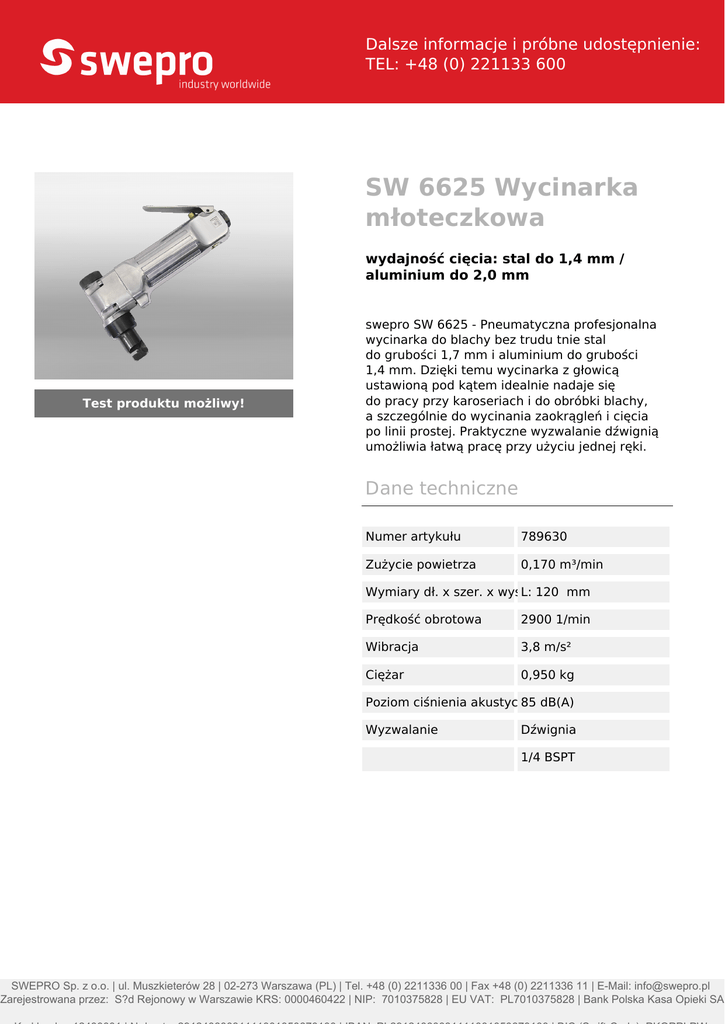 Dalsze informacje i próbne udostępnienie: TEL: +48 (0) 221133 600 SW 6625 Wycinarka młoteczkowa wydajność cięcia: stal do 1,4 mm / aluminium do 2,0 mm Test produktu możliwy! swepro SW 6625 - Pneumatyczna profesjonalna wycinarka do blachy bez trudu tnie stal do grubości 1,7 mm i aluminium do grubości 1,4 mm. Dzięki temu wycinarka z głowicą ustawioną pod kątem idealnie nadaje się do pracy przy karoseriach i do obróbki blachy, a szczególnie do wycinania zaokrągleń i cięcia po linii prostej. Praktyczne wyzwalanie dźwignią umożliwia łatwą pracę przy użyciu jednej ręki. Dane techniczne Numer artykułu 789630 Zużycie powietrza 0,170 m³/min Wymiary dł. x szer. x wys.L: 120 mm Prędkość obrotowa 2900 1/min Wibracja 3,8 m/s² Ciężar 0,950 kg Poziom ciśnienia akustycznego 85 dB(A) Wyzwalanie Dźwignia 1/4 BSPT SWEPRO Sp. z o.o. | ul. Muszkieterów 28 | 02-273 Warszawa (PL) | Tel. +48 (0) 2211336 00 | Fax +48 (0) 2211336 11 | E-Mail: [email protected] Zarejestrowana przez: S?d Rejonowy w Warszawie KRS: 0000460422 | NIP: 7010375828 | EU VAT: PL7010375828 | Bank Polska Kasa Opieki SA Powered by TCPDF (www.tcpdf.org)