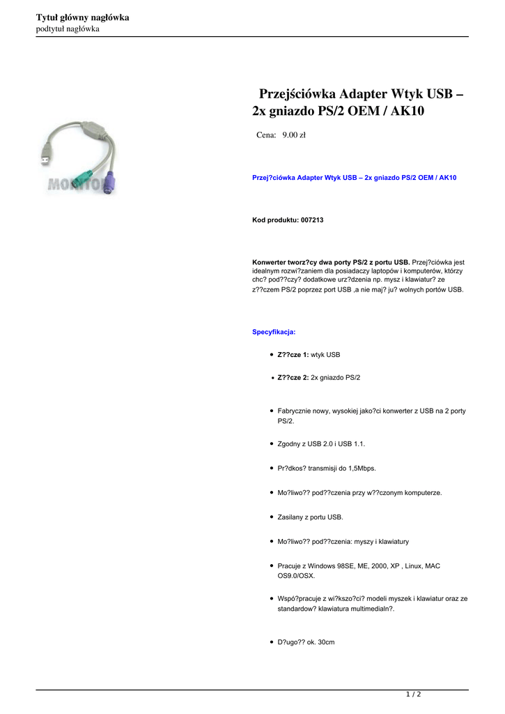 Tytuł główny nagłówka podtytuł nagłówka Przejściówka Adapter Wtyk USB – 2x gniazdo PS/2 OEM / AK10 Cena: 9.00 zł Przej?ciówka Adapter Wtyk USB – 2x gniazdo PS/2 OEM / AK10 Kod produktu: 007213 Konwerter tworz?cy dwa porty PS/2 z portu USB. Przej?ciówka jest idealnym rozwi?zaniem dla posiadaczy laptopów i komputerów, którzy chc? pod??czy? dodatkowe urz?dzenia np. mysz i klawiatur? ze z??czem PS/2 poprzez port USB ,a nie maj? ju? wolnych portów USB. Specyfikacja: Z??cze 1: wtyk USB Z??cze 2: 2x gniazdo PS/2 Fabrycznie nowy, wysokiej jako?ci konwerter z USB na 2 porty PS/2. Zgodny z USB 2.0 i USB 1.1. Pr?dkos? transmisji do 1,5Mbps. Mo?liwo?? pod??czenia przy w??czonym komputerze. Zasilany z portu USB. Mo?liwo?? pod??czenia: myszy i klawiatury Pracuje z Windows 98SE, ME, 2000, XP , Linux, MAC OS9.0/OSX. Wspó?pracuje z wi?kszo?ci? modeli myszek i klawiatur oraz ze standardow? klawiatura multimedialn?. D?ugo?? ok. 30cm 1/2 Tytuł główny nagłówka podtytuł nagłówka Waga [kg]: 0,030 Jednostka miary: sztuka Szczegóły Długość Rodzaje przyłączy Kable i Przejścia USB - PS/2 PS2 do klawiatury i myszki 2/2 Powered by TCPDF (www.tcpdf.org)