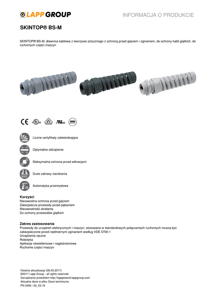 INFORMACJA O PRODUKCIE SKINTOP® BS-M SKINTOP® BS-M, dławnica kablowa z tworzywa sztucznego z ochroną przed gięciem i zginaniem, do ochrony kabli giętkich, do ruchomych części maszyn Liczne certyfikaty zatwierdzające Optymalne odciążenie Maksymalna ochrona przed wibracjami Duże zakresy zaciskania Automatyka przemysłowa Korzyści Niezawodna ochrona przed gięciem Zabezpiecza przewody przed pękaniem Niezawodność działania Do ochrony przewodów giętkich Zakres zastosowania Przewody do urządzeń elektrycznych i maszyn, stosowane w standardowych połączeniach ruchomych muszą być zabezpieczone przed nadmiernym zginaniem według VDE 0700-1 Urządzenia ręczne Robotyka Aplikacje oświetleniowe i nagłośnieniowe Ruchome części maszyn Ostania aktualizacja (06.03.2017) ©2017 Lapp Group - all rights reserved. Zarządzanie produktem http://lapppoland.lappgroup.com Aktualne dane w pliku Dane techniczne. PN 0456 / 02_03.16 INFORMACJA O PRODUKCIE SKINTOP® BS-M Normy i aprobaty UL file no. E79903 Budowa produktu Metryczny gwint przyłączeniowy zgodny z DIN EN 60423 Bazowe informacje techniczne DIN IEC 62444 Uwaga Pasujące akcesoria, patrz SKINTOP® z gwintem metrycznym - akcesoria Przeciwnakrętki w grupie SKINTOP® GMP-GL-M Wersja SKINTOP® BSR-M, z wkładem do dławienia przewodów o mniejszej średnicy, na zapytanie Wersja SKINTOP® BS M ISO z dłuższym gwintem przyłączeniowym nie posiada aprobaty DNV Dane techniczne Klasyfikacja: ETIM 5.0 Class-ID: EC000441 Opis klasy ETIM 5.0: Dławnica kablowa Uwaga: Wymiary montażowe i momenty dokręcania: patrz tabela T21 Na zapytanie: Z uszczelniającym pierścieniem redukcyjnym Kolor: RAL 7001 srebrnoszary RAL 7035 jasnoszary RAL 9005 czarny/odporny na działanie promieniowania UV Materiał: Korpus: poliamid Uszczelnienie: CR Stopień ochrony: IP 68 - 5 bar Zakres temperatury: Od -20°C do +100°C Wskazówka Fotografie nie mogą być używane do wymiarowania oraz nie stanowią szczegółowego odwzorowania przedstawionych produktów. * Podane ceny to ceny netto bez podatku VAT i dodatkowych opłat. Sprzedaż klientom biznesowym. Ostania aktualizacja (06.03.2017) ©2017 Lapp Group - all rights reserved. Zarządzanie produktem http://lapppoland.lappgroup.com Aktualne dane w pliku Dane techniczne. PN 0456 / 02_03.16 Powered by TCPDF (www.tcpdf.org) Oznaczenie produktu/rozmiar Zakres dławionych średnic ØF [mm] Rozmiar klucza SW w mm Długość całkowita C [mm] Długość gwintu [mm] SKINTOP® BS-M srebrnoszary 53111600 M 12 x 1,5 3,5 - 7 15 64 8 53111610 M 16 x 1,5 4,5 - 10 19 86 8 53111620 M 20 x 1,5 7 - 13 25 101 8 53111630 M 25 x 1,5 9 - 17 30 125 9 53111640 M 32 x 1,5 11 - 21 36 149 10 53111700 M 12 x 1,5 3,5 - 7 15 64 8 53111710 M 16 x 1,5 4,5 - 10 19 86 8 53111720 M 20 x 1,5 7 - 13 25 101 8 53111730 M 25 x 1,5 9 - 17 30 125 9 53111740 M 32 x 1,5 11 - 21 36 149 10 53111800 M 12 x 1,5 3,5 - 7 15 64 8 53111810 M 16 x 1,5 4,5 - 10 19 86 8 53111820 M 20 x 1,5 7 - 13 25 101 8 53111830 M 25 x 1,5 9 - 17 30 125 9 53111840 M 32 x 1,5 11 - 21 36 149 10 SKINTOP® BS-M czarny SKINTOP® BS-M Ostania aktualizacja (06.03.2017) ©2017 Lapp Group - all rights reserved. Zarządzanie produktem http://lapppoland.lappgroup.com Aktualne dane w pliku Dane techniczne. PN 0456 / 02_03.16 Numer katalogowy SKINTOP® BS-M jasnoszary SKINTOP® BS M ISO srebrnoszary (z długim metrycznym gwintem przyłączeniowym) M 16 x 1,5 ISO 3,5 - 8 19 77,5 12 53017630 M 20 x 1,5 ISO 5 - 12 24 102 13 53017640 M 25 x 1,5 ISO 9 - 14 27 114,5 13 SKINTOP® BS M ISO czarny (z długim metrycznym gwintem przyłączeniowym) 53017810 M 16 x 1,5 ISO 3,5 - 8 19 77,5 12 53017830 M 20 x 1,5 ISO 5 - 12 24 102 13 53017840 M 25 x 1,5 ISO 9 - 14 27 114,5 13 INFORMACJA O PRODUKCIE 53017610 Powered by TCPDF (www.tcpdf.org) INFORMACJA O PRODUKCIE SKINTOP® BS-M Ostania aktualizacja (06.03.2017) ©2017 Lapp Group - all rights reserved. Zarządzanie produktem http://lapppoland.lappgroup.com Aktualne dane w pliku Dane techniczne. PN 0456 / 02_03.16