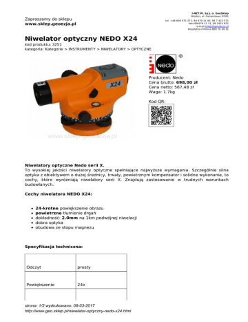 I-NET.PL Sp.J. o. GeoSklep Olsztyn, ul. Cementowa 3/301 Zapraszamy do sklepu www.sklep.geoezja.pl tel. +48 609 571 271, 89 670 11 00, 58 7 421 571 faks 89 670 11 11, 58 7421 871 e-mail [email protected] bezpłatna infolinia 800 70 30 31 Niwelator optyczny NEDO X24 kod produktu: 3251 kategoria: Kategorie > INSTRUMENTY > NIWELATORY > OPTYCZNE Producent: Nedo Cena brutto: 698,00 zł Cena netto: 567,48 zł Waga: 1.7kg Kod QR: Niwelatory optyczne Nedo serii X. To wysokiej jakości niwelatory optyczne spełniające najwyższe wymagania. Szczególnie silna optyka z obiektywem o dużej średnicy, trwały, powietrznym kompensator i solidne wykonanie, to cechy, które wyróżniają niwelatory serii X. Znajdują zastosowanie w trudnych warunkach budowlanych. Cechy niwelatora NEDO X24: 24-krotne powiększenie obrazu powietrzne tłumienie drgań dokładność: 2.0mm na 1km podwójnej niwelacji dobra optyka obudowa ze stopu magnezu Specyfikacja techniczna: Odczyt prosty Powiększenie 24x strona: 1/2 wydrukowano: 08-03-2017 http://www.geo.sklep.pl/niwelator-optyczny-nedo-x24.html Średnica obiektywu 36 mm Najkrótsza celowa 0,6 m Stała mnożenia 100 Zakres kompensatora pracy +/- 15' Dokładność ustawienia +/- 0,5" Podział koła poziomego 400 gon Czułość libelii 8'/2 mm Błąd 1 km podwójnej +/-2,0 mm niwelacji Norma szczelności IP 54 Ciężar 1,7 kg Gwint łączący 5/8" strona: 2/2 wydrukowano: 08-03-2017 http://www.geo.sklep.pl/niwelator-optyczny-nedo-x24.html