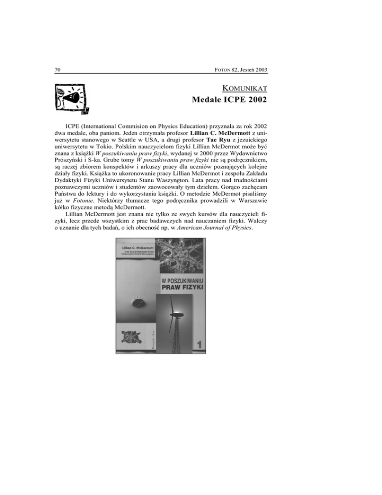 70 FOTON 82, Jesień 2003 KOMUNIKAT Medale ICPE 2002 ICPE (International Commision on Physics Education) przyznała za rok 2002 dwa medale, oba paniom. Jeden otrzymała profesor Lillian C. McDermott z uniwersytetu stanowego w Seattle w USA, a drugi profesor Tae Ryu z jezuickiego uniwersytetu w Tokio. Polskim nauczycielom fizyki Lillian McDermot może być znana z książki W poszukiwaniu praw fizyki, wydanej w 2000 przez Wydawnictwo Prószyński i S-ka. Grube tomy W poszukiwaniu praw fizyki nie są podręcznikiem, są raczej zbiorem konspektów i arkuszy pracy dla uczniów poznających kolejne działy fizyki. Książka to ukoronowanie pracy Lillian McDermot i zespołu Zakładu Dydaktyki Fizyki Uniwersytetu Stanu Waszyngton. Lata pracy nad trudnościami poznawczymi uczniów i studentów zaowocowały tym dziełem. Gorąco zachęcam Państwa do lektury i do wykorzystania książki. O metodzie McDermot pisaliśmy już w Fotonie. Niektórzy tłumacze tego podręcznika prowadzili w Warszawie kółko fizyczne metodą McDermott. Lillian McDermott jest znana nie tylko ze swych kursów dla nauczycieli fizyki, lecz przede wszystkim z prac badawczych nad nauczaniem fizyki. Walczy o uznanie dla tych badań, o ich obecność np. w American Journal of Physics. FOTON 82, Jesień 2003 71 Profesor Tae Ryu mieli okazję poznać nauczyciele, uczestnicy polsko-japońskiego spotkania nauczycieli fizyki sprzed dziesięciu lat (Foton 12, 1992). Tae Ryu była inicjatorką otwarcia się japońskich nauczycieli fizyki na kontakty z resztą świata. To z jej inicjatywy grupa entuzjastycznych nauczycieli fizyki założyła stowarzyszenie „Zbłąkane Koty” (Stray cats). Te Zbłąkane Koty są autorami bardzo zmyślnych demonstracji i pokazów, które kiedyś pokazywali w Krakowie (artykuł Rafała Leszczyńskiego w Fotonie 12) i które z zapałem pokazują na świecie, równocześnie podglądając i udoskonalając pomysły innych. Tae Ryu jest bardzo aktywna w ICPE, w GIREP-ie. Jest inicjatorką wielu akcji, organizatorką ważnych seminariów i spotkań. Jest też bardziej ceniona na świecie niż w rodzinnej Japonii, chociaż to w znacznej mierze dzięki niej w niektórych japońskich szkołach lekcje fizyki nie wyglądają już jak za czasów młodego Koshiby. Tae Ryu jest niewątpliwie jedną z najgłębiej myślących osób zajmujących się nauczaniem fizyki. Tae Ryu z Zofią Gołąb-Meyer na konferencji GIREP-u w Toruniu w 1991