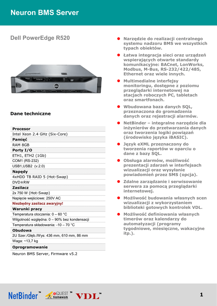 Neuron BMS Server Dell PowerEdge R520 Narzędzie do realizacji centralnego systemu nadzoru BMS we wszystkich typach obiektów. Łatwa integracja sieci oraz urządzeń wspierających otwarte standardy komunikacyjne: BACnet, LonWorks, Modbus, M-Bus, RS-232/422/485, Ethernet oraz wiele innych. Multimedialne interfejsy monitoringu, dostępne z poziomu przeglądarki internetowej na stacjach roboczych PC, tabletach oraz smartfonach. Wbudowana baza danych SQL, Dane techniczne przeznaczona do gromadzenia danych oraz rejestracji alarmów. NetBinder – integralne narzędzie dla Procesor Intel Xeon 2.4 GHz (Six-Core) Pamięć RAM 8GB Porty I/O ETH1, ETH2 (1Gb) COM1 (RS-232) USB1,USB2 (v.2.0) Napędy 4xHDD TB RAID 5 (Hot-Swap) DVD±RW Zasilacz 2x 750 W (Hot-Swap) Napięcie wejściowe: 250V AC Niezbędny zasilacz awaryjny! Warunki pracy Temperatura otoczenia: 0 – 60 °C Wilgotność względna: 0 – 90% bez kondensacji Temperatura składowania: -10 – 70 °C Obudowa 2U Szer./Głęb./Wys: 436 mm, 610 mm, 86 mm Waga: ~13,7 kg inżynierów do przetwarzania danych oraz tworzenia logiki powiązań (środowisko języka iBASIC). Język eXML przeznaczony do tworzenia raportów w oparciu o dane z bazy SQL. Obsługa alarmów, możliwość prezentacji zdarzeń w interfejsach wizualizacji oraz wysyłanie powiadomień przez SMS (opcja). Zdalne zarządzanie i serwisowanie serwera za pomocą przeglądarki internetowej. Możliwość budowania własnych scen wizualizacji z wykorzystaniem biblioteki gotowych kontrolek VDL. Możliwość definiowania własnych timerów oraz kalendarzy do automatyzacji (programy tygodniowe, miesięczne, wakacyjne itp.). Oprogramowanie Neuron BMS Server, Firmware v5.2 1 Neuron BMS Server Charakterystyka ogólna Bezpieczeństwo w sieci Internet Neuron BMS Server to kolektor danych przeznaczony do monitoringu sieci oraz urządzeń, automatyki wspierających otwarte standardy komunikacyjne we wszystkich typach budynków. Pod kontrolą serwera mogą znaleźć się podsystemy techniczne związane z oświetleniem, HVAC, liczniki zużycia mediów, zasilania, siłownie solarne i fotowoltaiczne, technologia wody oraz wiele innych. Serwer Neuron umożliwia prowadzenie nadzoru obiektu przez Internet, zapewniając pełne bezpieczeństwo obsługi. Oprogramowanie zainstalowane na serwerze ochrania wbudowany firewall oraz szereg mechanizmów kryptograficznych, używanych do zabezpieczania transmisji danych w połączeniach internetowych. System wykrywa wszelkie próby zgadywania haseł oraz pomyłki popełniane podczas logowań. Administrator może nadawać użytkownikom indywidualne lub grupowe uprawnienia do części administracyjnej oraz do obiektów na scenach monitoringu. Serwer umożliwia wielostanowiskowy monitoring obiektu przy pomocy stacji roboczych PC, paneli dotykowych, przenośnych tabletów oraz smartfonów. Personel techniczny budynku otrzymuje zintegrowany, multimedialny interfejs wizualizacji, pozwalający nadzorować aktualne stany urządzeń na scenach monitoringu oraz reagować na pojawiające się zdarzenia alarmowe. Rysunek 1. Przykładowy schemat integracji w serwerowni z wykorzystaniem Neuron BMS Server. Obsługa alarmów Serwer posiada łatwy w obsłudze, konfigurowalny interfejs do monitoringu alarmów. Każdy cyfrowy lub analogowy parametr może być zdefiniowany jako alarm a następnie rejestrowany w tabeli logowania w bazie danych SQL i wyświetlany na ekranie. Zdarzenia alarmowe mogą być filtrowane wg określonego priorytetu i wyświetlane wraz z towarzyszącymi sygnałami dźwiękowymi. Rysunek 3. Pełnoekranowa obsługa alarmów. W większych budynkach, wydzielone podsystemy HVAC można przekazać pod kontrolę lokalnym, wyspecjalizowanym serwerom Neuron Box. Analogicznie można wydzielić monitoring systemów bezpieczeństwa, realizowany wówczas przez serwer Astro SMS. 2 Neuron BMS Server W razie wystąpienia alarmu system wskazuje lokalizację obiektu na scenie monitoringu oraz wspiera operatora w podjęciu działań w celu usunięcia problemu, udostępniając niezbędną dokumentację techniczną oraz raporty. Rejestracja danych Informacje pochodzące z urządzeń mogą być dowolnie przetwarzane oraz rejestrowane w lokalnej bazie danych SQL serwera. Operatorzy mogą definiować własne tabele logowania w celu gromadzenia różnego rodzaju danych, np. pomiarowych z czujników temperatury, stany liczników, ciepłomierzy, zdarzenia alarmowe itp. Tak przygotowane informacje mogą być źródłem danych dla definiowanych przez operatorów raportów. Narzędzia dla integratorów Serwer posiada wbudowane oprogramowanie NetBinder przeznaczone dla integratorów, umożliwiające diagnostykę serwera, monitoring stanu drajwerów oraz kontrolę parametrów sieciowych. Oprócz wielu funkcji diagnostycznych narzędzie oferuje możliwość zdalnej pracy grupowej dla integratorów. Rysunek 5. Narzędzie NetBinder. Raporty W części administracyjnej serwera dostępne jest środowisko języka eXML, służące do definiowania raportów. W zależności od potrzeb użytkownika, raporty można definiować w postaci prostych zestawień tabelarycznych lub wykresów. Dostęp do danych w bazie odbywa się przy pomocy zapytań języka SQL. Rysunek 4. Przykładowy raport graficzny w języku eXML. NetBinder to także środowisko programistyczne i uruchomieniowe dla kodu źródłowego języka iBASIC, przeznaczone do przetwarzania danych oraz programowania logiki komunikacji sieciowej. Interfejsy monitoringu Interfejs monitoringu został zaprojektowany tak, aby umożliwić pełny nadzór nad wieloma różnymi systemami występującymi na jednym lub wielu obiektach. Odpowiednio przygotowane sceny monitoringu można umieścić w odpowiednich kategoriach branżowych, oddzielnie dla różnych obiektów. Na scenach mogą być prezentowane wielkości fizyczne, odtwarzane strumienie wideo a w przypadku wystąpienia określonego zdarzenia - komunikaty głosowe lub dźwiękowe z serwera plików MP3