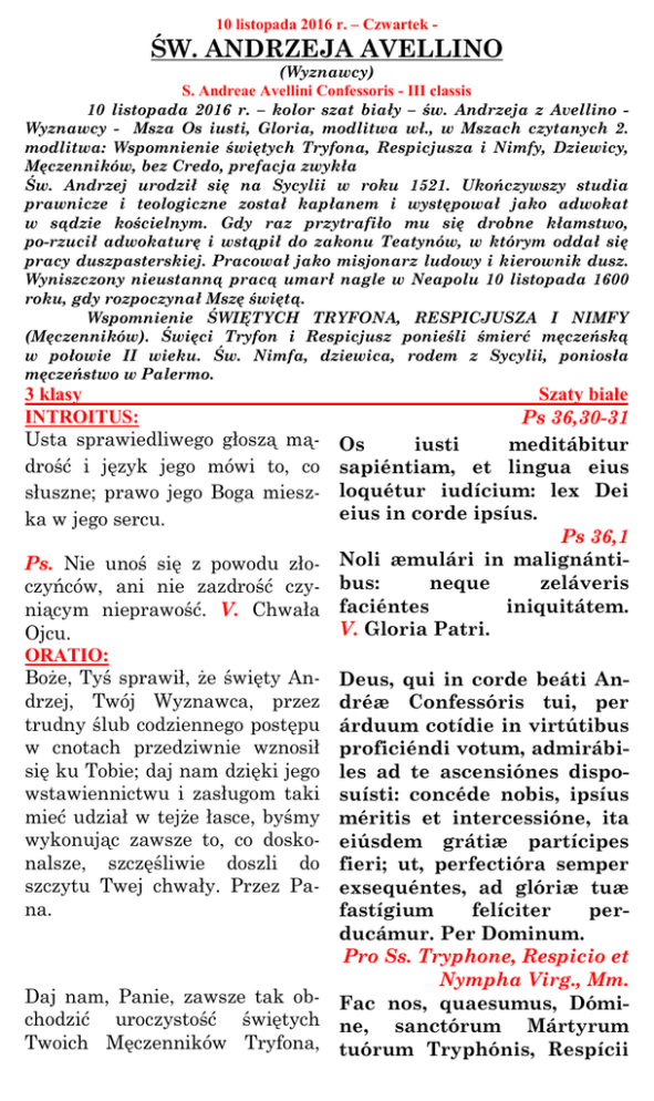 10 listopada 2016 r. – Czwartek - ŚW. ANDRZEJA AVELLINO (Wyznawcy) S. Andreae Avellini Confessoris - III classis 10 listopada 2016 r. – kolor szat biały – św. Andrzeja z Avellino Wyznawcy - Msza Os iusti, Gloria, modlitwa wł., w Mszach czytanych 2. modlitwa: Wspomnienie świętych Tryfona, Respicjusza i Nimfy, Dziewicy, Męczenników, bez Credo, prefacja zwykła Św. Andrzej urodził się na Sycylii w roku 1521. Ukończywszy studia prawnicze i teologiczne został kapłanem i występował jako adwokat w sądzie kościelnym. Gdy raz przytrafiło mu się drobne kłamstwo, porzucił adwokaturę i wstąpił do zakonu Teatynów, w którym oddał się pracy duszpasterskiej. Pracował jako misjonarz ludowy i kierownik dusz. Wyniszczony nieustanną pracą umarł nagle w Neapolu 10 listopada 1600 roku, gdy rozpoczynał Mszę świętą. Wspomnienie ŚWIĘTYCH TRYFONA, RESPICJUSZA I NIMFY (Męczenników). Święci Tryfon i Respicjusz ponieśli śmierć męczeńską w połowie II wieku. Św. Nimfa, dziewica, rodem z Sycylii, poniosła męczeństwo w Palermo. Szaty białe Ps 36,30-31 Os iusti meditábitur sapiéntiam, et lingua eius loquétur iudícium: lex Dei eius in corde ipsíus. Ps 36,1 Noli æmulári in malignántiPs. Nie unoś się z powodu złoneque zeláveris czyńców, ani nie zazdrość czy- bus: faciéntes iniquitátem. niącym nieprawość. V. Chwała V. Gloria Patri. Ojcu. ORATIO: Boże, Tyś sprawił, że święty An- Deus, qui in corde beáti Andrzej, Twój Wyznawca, przez dréæ Confessóris tui, per trudny ślub codziennego postępu árduum cotídie in virtútibus w cnotach przedziwnie wznosił proficiéndi votum, admirábisię ku Tobie; daj nam dzięki jego les ad te ascensiónes dispowstawiennictwu i zasługom taki suísti: concéde nobis, ipsíus mieć udział w tejże łasce, byśmy méritis et intercessióne, ita wykonując zawsze to, co dosko- eiúsdem grátiæ partícipes nalsze, szczęśliwie doszli do fieri; ut, perfectióra semper szczytu Twej chwały. Przez Pa- exsequéntes, ad glóriæ tuæ na. fastígium felíciter perducámur. Per Dominum. Pro Ss. Tryphone, Respicio et Nympha Virg., Mm. Daj nam, Panie, zawsze tak ob- Fac nos, quaesumus, Dómichodzić uroczystość świętych ne, sanctórum Mártyrum Twoich Męczenników Tryfona, tuórum Tryphónis, Respícii 3 klasy INTROITUS: Usta sprawiedliwego głoszą mądrość i język jego mówi to, co słuszne; prawo jego Boga mieszka w jego sercu. Respicjusza i Nimfy, abyśmy za ich wstawiennictwem doznali Twojej dobroczynnej opieki. Przez Pana. et Nymphæ semper festa sectári: quorum suffrágiis, protectiónis tuæ dona sentiámus.Per Dominum. LECTIO: Błogosławiony bogacz, którego znaleziono bez winy, który nie gonił za złotem. Któż to jest? Wychwalać go będziemy, uczynił bowiem rzeczy podziw wzbudzające między swoim ludem. Któż poddany pod tym względem próbie został doskonały? Poczytane mu to będzie za chlubę. Kto mógł zgrzeszyć, a nie zgrzeszył, uczynić źle, a nie uczynił? Dobra jego zostaną utwierdzone, a zgromadzenie opowiadać będzie jego dobrodziejstwa. Syr 31,8-11 Beátus vir, qui invéntus est sine mácula, et qui post aurum non ábiit, nec sperávit in pecúnia et thesáuris. Quis est hic, et laudábimus eum? fecit enim mirabília in vita sua. Qui probátus est in illo, et perféctus est, erit illi glória ætérna: qui potuit tránsgredi, et non est transgréssus: fácere mala, et non fecit: ídeo stabilíta sunt bona illíus in Dómino, et eleemósynis illíus enarrábit omnis ecclésia sanctórum. Ps 91,13n Iustus ut palma florébit: sicut cedrus Líbani multiplicábitur in domo Dómini. V. Annuntiándum mane misericórdiam tuam, et veritátem tuam per noctem. Jk 1,12 Allelúia, allelúia. V. Beátus vir, qui suffert tentatiónem: quóniam, cum probátus fúerit, accípiet corónam vitæ. Alleluia. Łk 12,35-40 In illo témpore: Dixit Iesus discípulis suis: Sint lumbi vestri præcíncti, et lucernæ ardéntes in mánibus vestris, et vos símiles homínibus exspectántibus dóminum suum, quando revertátur a núptiis: ut, cum vénerit et pulsáverit, conféstim apériant ei. Beáti servi illi, quos, cum vénerit dóminus, GRADUALE: Sprawiedliwy zakwitnie jak palma, rozrośnie się jak cedr na Libanie w domu Pańskim. V. By głosić z rana Twoje miłosierdzie, a wierność Twoją nocami. ALLELUJA: Alleluja, alleluja. V. Błogosławiony człowiek, który zniesie pokusę, bo utwierdziwszy się otrzyma wieniec żywota. Alleluja. EVANGELIUM: Niech będą przepasane biodra wasze i zapalone pochodnie! A wy [bądźcie] podobni do ludzi, oczekujących swego pana, kiedy z uczty weselnej powróci, aby mu zaraz otworzyć, gdy nadejdzie i zakołacze. Szczęśliwi owi słudzy, których pan zastanie czuwających, gdy nadejdzie. Zaprawdę, powiadam wam: Przepasze się i każe im zasiąść do stołu, a obchodząc będzie im usługiwał. Czy o drugiej, czy o trzeciej straży przyjdzie, szczęśliwi oni, gdy ich tak zastanie. A to rozumiejcie, że gdyby gospodarz wiedział, o której godzinie złodziej ma przyjść, nie pozwoliłby włamać się do swego domu. Wy też bądźcie gotowi, gdyż o godzinie, której się nie domyślacie, Syn Człowieczy przyjdzie». invénerit vigilántes: amen, dico vobis, quod præcínget se, et fáciet illos discúmbere, et tránsiens ministrábit illis. Et si vénerit in secúnda vigília, et si in tértia vigília vénerit, et ita invénerit, beáti sunt servi illi. Hoc autem scitóte, quóniam, si sciret paterfamílias, qua hora fur veníret, vigiláret útique, et non síneret pérfodi domum suam. Et vos estóte paráti, quia, qua hora non putátis, Fílius hóminis véniet. OFFERTORIUM: Ps 88,25 Z nim moja wierność i moja ła- Véritas mea et misericórdia ska; w moim imieniu moc jego mea cum ipso: et in nómine wzrośnie. meo exaltábitur cornu eius. SECRETA: Wspominając Twoich Świętych Laudis tibi, Dómine, hóstias składamy Ci, Panie, ofiarę chwa