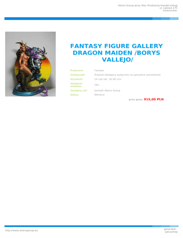Aliens Group Jerzy Stec Produkcja-Handel-Usługi ul. Lipowa 17C Inowrocław FANTASY FIGURE GALLERY DRAGON MAIDEN /BORYS VALLEJO/ Producent: Yamato Dostępność: Produkt dostępny wyłącznie na specjalne zamówienie Wysokość: 14 cali (ok. 35,56 cm) Kategoria wiekowa: 18+ Dostępny od*: kontakt Aliens Group Status: Wkrótce price gross: http://www.aliensgroup.eu 915,00 PLN generator: aptusshop