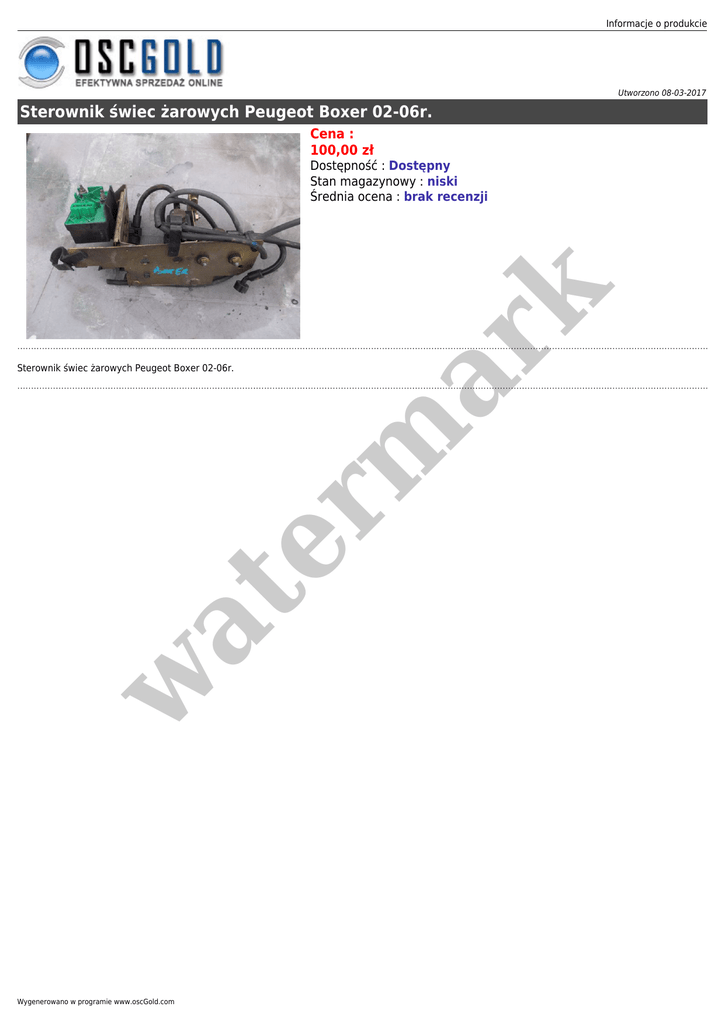 Informacje o produkcie Utworzono 08-03-2017 Sterownik świec żarowych Peugeot Boxer 02-06r. Cena : 100,00 zł er m ar k Dostępność : Dostępny Stan magazynowy : niski Średnia ocena : brak recenzji w at Sterownik świec żarowych Peugeot Boxer 02-06r. Wygenerowano w programie www.oscGold.com