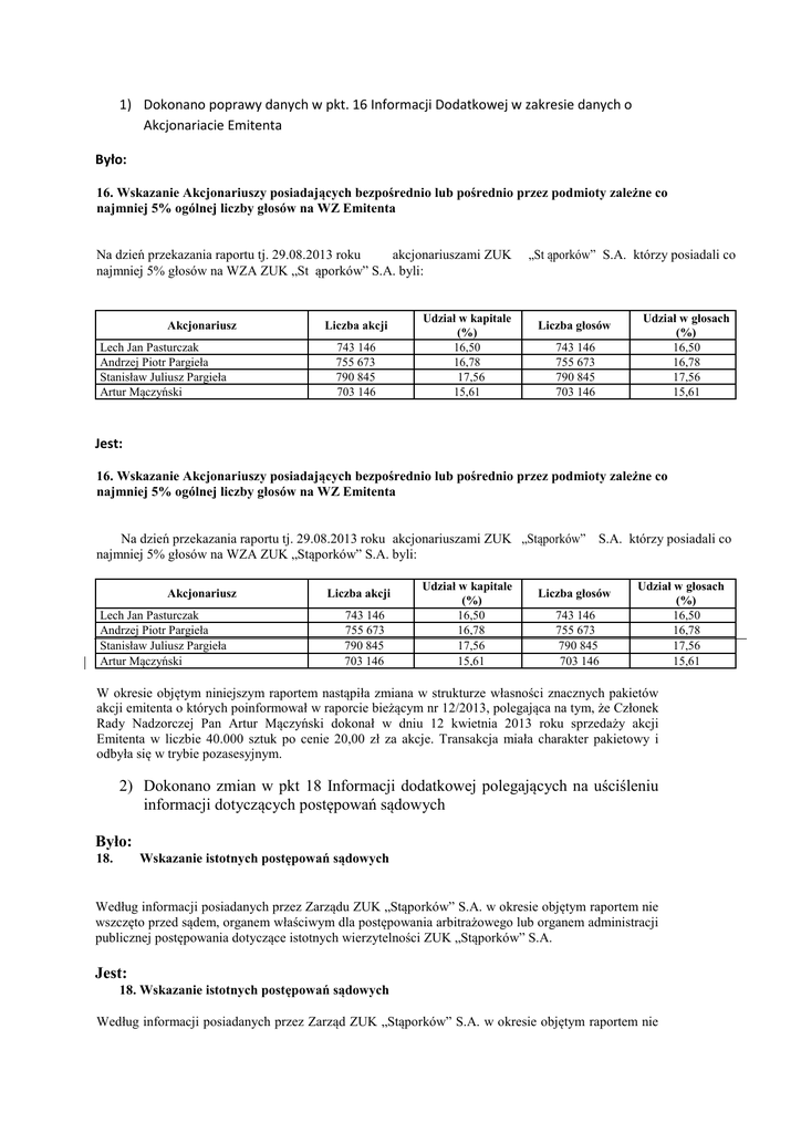 1) Dokonano poprawy danych w pkt. 16 Informacji Dodatkowej w zakresie danych o Akcjonariacie Emitenta Było: 16. Wskazanie Akcjonariuszy posiadających bezpośrednio lub pośrednio przez podmioty zależne co najmniej 5% ogólnej liczby głosów na WZ Emitenta Na dzień przekazania raportu tj. 29.08.2013 roku akcjonariuszami ZUK najmniej 5% głosów na WZA ZUK „St ąporków” S.A. byli: Akcjonariusz Lech Jan Pasturczak Andrzej Piotr Pargieła Stanisław Juliusz Pargieła Artur Mączyński Liczba akcji 743 146 755 673 790 845 703 146 Udział w kapitale (%) 16,50 16,78 17,56 15,61 „St ąporków” S.A. którzy posiadali co Liczba głosów 743 146 755 673 790 845 703 146 Udział w głosach (%) 16,50 16,78 17,56 15,61 Jest: 16. Wskazanie Akcjonariuszy posiadających bezpośrednio lub pośrednio przez podmioty zależne co najmniej 5% ogólnej liczby głosów na WZ Emitenta Na dzień przekazania raportu tj. 29.08.2013 roku akcjonariuszami ZUK „Stąporków” S.A. którzy posiadali co najmniej 5% głosów na WZA ZUK „Stąporków” S.A. byli: Akcjonariusz Lech Jan Pasturczak Andrzej Piotr Pargieła Stanisław Juliusz Pargieła Artur Mączyński Liczba akcji 743 146 755 673 790 845 703 146 Udział w kapitale (%) 16,50 16,78 17,56 15,61 Liczba głosów 743 146 755 673 790 845 703 146 Udział w głosach (%) 16,50 16,78 17,56 15,61 W okresie objętym niniejszym raportem nastąpiła zmiana w strukturze własności znacznych pakietów akcji emitenta o których poinformował w raporcie bieżącym nr 12/2013, polegająca na tym, że Członek Rady Nadzorczej Pan Artur Mączyński dokonał w dniu 12 kwietnia 2013 roku sprzedaży akcji Emitenta w liczbie 40.000 sztuk po cenie 20,00 zł za akcje. Transakcja miała charakter pakietowy i odbyła się w trybie pozasesyjnym. 2) Dokonano zmian w pkt 18 Informacji dodatkowej polegających na uściśleniu informacji dotyczących postępowań sądowych Było: 18. Wskazanie istotnych postępowań sądowych Według informacji posiadanych przez Zarządu ZUK „Stąporków” S.A. w okresie objętym raportem nie wszczęto przed sądem, organem właściwym dla postępowania arbitrażowego lub organem administracji publicznej postępowania dotyczące istotnych wierzytelności ZUK „Stąporków” S.A. Jest: 18. Wskazanie istotnych postępowań sądowych Według informacji posiadanych przez Zarząd ZUK „Stąporków” S.A. w okresie objętym raportem nie wszczęto przed sądem, organem administracji publicznej lub organem właściwym dla postępowania arbitrażowego żadnego postępowania dotyczącego zobowiązań lub wierzytelności ZUK „Stąporków” S.A., którego wartość stanowi co najmniej 10% kapitałów własnych Emitenta. 3. Doprecyzowano i sprostowano zapisy pkt 17 Informacji dodatkowej Było: 17. Akcje oraz opcje na akcje posiadane przez osoby zarządzające lub nadzorujące Emitenta Stan posiadania akcji lub opcji na akcje przez osoby zarządzające lub nadzorujące Emitenta na dzień 29.08.2013r. przedstawiał się następująco: Grzegorz Pasturczak Maciej Walkiewicz Lech Jan Pasturczak Andrzej Piotr Pargieła Stanisław Juliusz Pargieła Artur Mączyński Jacek Wilk Prezes Zarządu Wiceprezes Zarządu Przewodniczący Rady Nadzorczej Sekretarz Rady Nadzorczej Członek Rady Nadzorczej Członek Rady Nadzorczej Członek Rady Nadzorczej nie posiada akcji ani opcji na akcje Emitenta nie posiada akcji ani opcji na akcje Emitenta posiada 743146akcji Emitenta, nie posiada opcji na akcje Emitenta; posiada 755673 akcji Emitenta, nie posiada opcji na akcje Emitenta; posiada 790845 akcji Emitenta, nie posiada opcji na akcje Emitenta; posiada 703146akcji Emitenta, nie posiada opcji na akcje Emitenta; nie posiada akcji ani opcji na akcje Emitenta; W okresie od przekazania poprzedniego raportu okresowego do dnia dzisiejszego (tj. od 15.05.2013 r. do 29.08.2013r.) nastąpiły następujące zmiany w posiadaniu akcji ZUK „St ąporków” S.A. przez osoby zarz ądzające: Pan Artur Mączyński zbył 40 000 akcji Spółki. Jest: 17. Akcje oraz opcje na akcje posiadane przez osoby zarządzające lub nadzorujące Emitenta Stan posiadania akcji lub opcji na akcje przez osoby zarządzające lub nadzorujące Emitenta na dzień 29.08.2013r. przedstawiał się następująco: Grzegorz Pasturczak Maciej Walkiewicz Lech Jan Pasturczak Andrzej Piotr Pargieła Stanisław Juliusz Pargieła Artur Mączyński Jacek Wilk Prezes Zarządu Wiceprezes Zarządu Przewodniczący Rady Nadzorczej Sekretarz Rady Nadzorczej Członek Rady Nadzorczej Członek Rady Nadzorczej Członek Rady Nadzorczej nie posiada akcji ani opcji na akcje Emitenta nie posiada akcji ani opcji na akcje Emitenta posiada 743146akcji Emitenta, nie posiada opcji na akcje Emitenta; posiada 755673 akcji Emitenta, nie posiada opcji na akcje Emitenta; posiada 790845 akcji Emitenta, nie posiada opcji na akcje Emitenta; posiada 703146akcji Emitenta, nie posiada opcji na akcje Emitenta; nie posiada akcji ani opcji na akcje Emitenta; W okresie od przekazania poprzedniego raportu okresowego do dnia dzisiejszego (tj. od 15.05.2013 r. do 29.08.2013r.) nie nastąpiły zmiany w posiadaniu akcji ZUK „Stąporków” S.A. przez osoby zarządzające ani nadzorujące. : W okresie objętym niniejszym raportem nastąpiła zmiana w strukturze własności znacznych pakietów akcji emitenta o których poinformował w raporcie bieżącym nr 12/2013, polegająca na tym, że Członek Rady Nadzorczej Pan Artur Mączyński dokonał w dniu 12 kwietnia 2013 roku sprzedaży akcji Emitenta w liczbie 40.000 sztuk po cenie 20,00 zł za akcje. Transakcja miała charakter pakietowy i odbyła się w trybie pozasesyjnym.