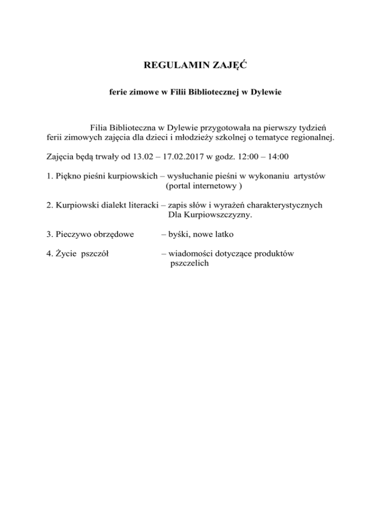 REGULAMIN ZAJĘĆ ferie zimowe w Filii Bibliotecznej w Dylewie Filia Biblioteczna w Dylewie przygotowała na pierwszy tydzień ferii zimowych zajęcia dla dzieci i młodzieży szkolnej o tematyce regionalnej. Zajęcia będą trwały od 13.02 – 17.02.2017 w godz. 12:00 – 14:00 1. Piękno pieśni kurpiowskich – wysłuchanie pieśni w wykonaniu artystów (portal internetowy ) 2. Kurpiowski dialekt literacki – zapis słów i wyrażeń charakterystycznych Dla Kurpiowszczyzny. 3. Pieczywo obrzędowe – byśki, nowe latko 4. Życie pszczół – wiadomości dotyczące produktów pszczelich