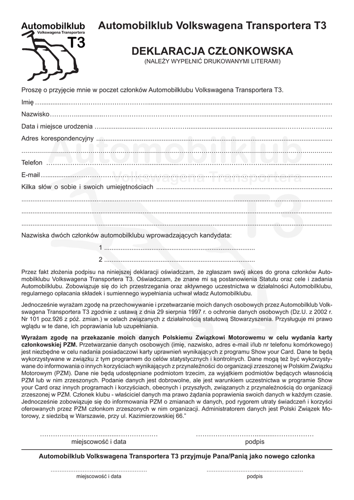 Automobilklub Volkswagena Transportera T3 Automobilklub Volkswagena Transportera T3 DEKLARACJA CZŁONKOWSKA (Należy wypełnić drukowanymi literami) Proszę o przyjęcie mnie w poczet członków Automobilklubu Volkswagena Transportera T3. Imię …...............………………………………...................................................................................................... Nazwisko …………...............……………………………………….................................................................…… Data i miejsce urodzenia …......................………………….....................................................………………….. Automobilklub Adres korespondencyjny .................................................................................................................................. ............................................................................................................................................................. Telefon ………………………………………..................……………………………………..........................…….. Volkswagena Transportera E-mail …...............…………………………………………………………………………..................................…… T3 Kilka słów o sobie i swoich umiejętnościach ................................................................................................. .......................................................................................................................................................................... ......................................................................................................................................................................... ......................................................................................................................................................................... Nazwiska dwóch członków automobilklubu wprowadzających kandydata: 1 ................................................................................... 2 ................................................................................... Przez fakt złożenia podpisu na niniejszej deklaracji oświadczam, że zgłaszam swój akces do grona członków Automobilklubu Volkswagena Transportera T3. Oświadczam, że znane mi są postanowienia Statutu oraz cele i zadania Automobilklubu. Zobowiązuje się do ich przestrzegania oraz aktywnego uczestnictwa w działalności Automobilklubu, regularnego opłacania składek i sumiennego wypełniania uchwał władz Automobilklubu. Jednocześnie wyrażam zgodę na przechowywanie i przetwarzanie moich danych osobowych przez Automobilklub Volkswagena Transportera T3 zgodnie z ustawą z dnia 29 sierpnia 1997 r. o ochronie danych osobowych (Dz.U. z 2002 r. Nr 101 poz.926 z póź. zmian.) w celach związanych z działalnością statutową Stowarzyszenia. Przysługuje mi prawo wglądu w te dane, ich poprawiania lub uzupełniania. Wyrażam zgodę na przekazanie moich danych Polskiemu Związkowi Motorowemu w celu wydania karty członkowskiej PZM. Przetwarzanie danych osobowych (imię, nazwisko, adres e-mail i/lub nr telefonu komórkowego) jest niezbędne w celu nadania posiadaczowi karty uprawnień wynikających z programu Show your Card. Dane te będą wykorzystywane w związku z tym programem do celów statystycznych i kontrolnych. Dane mogą też być wykorzystywane do informowania o innych korzyściach wynikających z przynależności do organizacji zrzeszonej w Polskim Związku Motorowym (PZM). Dane nie będą udostępniane podmiotom trzecim, za wyjątkiem podmiotów będących własnością PZM lub w nim zrzeszonych. Podanie danych jest dobrowolne, ale jest warunkiem uczestnictwa w programie Show your Card oraz innych programach i korzyściach, obecnych i przyszłych, związanych z przynależnością do organizacji zrzeszonej w PZM. Członek klubu - właściciel danych ma prawo żądania poprawienia swoich danych w każdym czasie. Jednocześnie zobowiązuje się do informowania PZM o zmianach w danych, pod rygorem utraty świadczeń i korzyści oferowanych przez PZM członkom zrzeszonych w nim organizacji. Administratorem danych jest Polski Związek Motorowy, z siedzibą w Warszawie, przy ul. Kazimierzowskiej 66.” ………………………...........……………… miejscowość i data ………………………...........……………… podpis Automobilklub Volkswagena Transportera T3 przyjmuje Pana/Panią jako nowego członka ………………………...........……………… miejscowość i data ………………………...........……………… podpis
