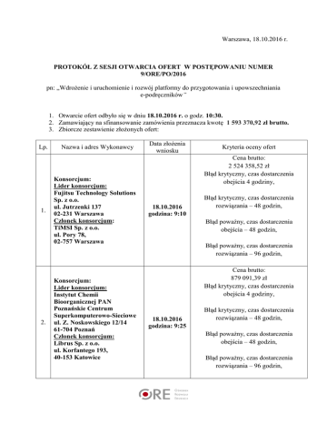 Warszawa, 18.10.2016 r. PROTOKÓŁ Z SESJI OTWARCIA OFERT W POSTĘPOWANIU NUMER 9/ORE/PO/2016 pn: „Wdrożenie i uruchomienie i rozwój platformy do przygotowania i upowszechniania e-podręczników” 1. Otwarcie ofert odbyło się w dniu 18.10.2016 r. o godz. 10:30. 2. Zamawiający na sfinansowanie zamówienia przeznacza kwotę 1 593 370,92 zł brutto. 3. Zbiorcze zestawienie złożonych ofert: Lp. 1. 2. Nazwa i adres Wykonawcy Konsorcjum: Lider konsorcjum: Fujitsu Technology Solutions Sp. z o.o. ul. Jutrzenki 137 02-231 Warszawa Członek konsorcjum: TiMSI Sp. z o.o. ul. Pory 78, 02-757 Warszawa Konsorcjum: Lider konsorcjum: Instytut Chemii Bioorganicznej PAN Poznańskie Centrum Superkomputerowo-Sieciowe ul. Z. Noskowskiego 12/14 61-704 Poznań Członek konsorcjum: Librus Sp. z o.o. ul. Korfantego 193, 40-153 Katowice Data złożenia wniosku Kryteria oceny ofert Cena brutto: 2 524 358,52 zł Błąd krytyczny, czas dostarczenia obejścia 4 godziny, 18.10.2016 godzina: 9:10 Błąd krytyczny, czas dostarczenia rozwiązania – 48 godzin, Błąd poważny, czas dostarczenia obejścia – 48 godzin, Błąd poważny, czas dostarczenia rozwiązania – 96 godzin, Cena brutto: 879 091,39 zł Błąd krytyczny, czas dostarczenia obejścia 4 godziny, 18.10.2016 godzina: 9:25 Błąd krytyczny, czas dostarczenia rozwiązania – 48 godzin, Błąd poważny, czas dostarczenia obejścia – 48 godzin, Błąd poważny, czas dostarczenia rozwiązania – 96 godzin, 3. Konsorcjum: Lider konsorcjum: INFOMEX Sp. z o.o. ul. Wesoła 19B, 34-300 Żywiec Członek konsorcjum: Mobile MS Michał Stefański Al. Tadeusza Kościuszki 80/82, 90-437 Łódź Cena brutto: 919 021,62 zł Błąd krytyczny, czas dostarczenia obejścia – 3 godziny, Błąd krytyczny, czas dostarczenia 18.10.2016 godzina: 9:26 rozwiązania – 36 godzin, Błąd poważny, czas dostarczenia obejścia – 24 godziny, Błąd poważny, czas dostarczenia rozwiązania – 48 godzin, Cena brutto: 2 361 608,97 zł Błąd krytyczny, czas dostarczenia obejścia 4 godziny-, 4. bezpieczne.it Sp. z o.o. ul. Poleczki 20A, 02-822 Warszawa 18.10.2016 godzina: 9:28 Błąd krytyczny, czas dostarczenia rozwiązania – 48 godzin, Błąd poważny, czas dostarczenia obejścia – 48 godzin, Błąd poważny, czas dostarczenia rozwiązania – 96 godzin,