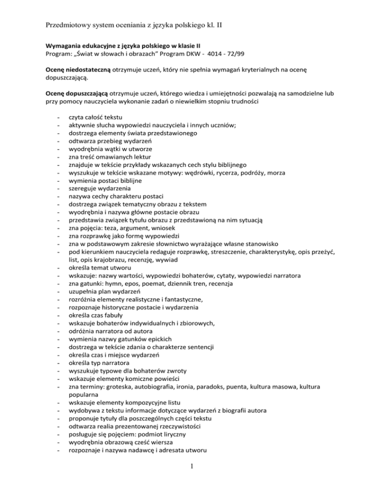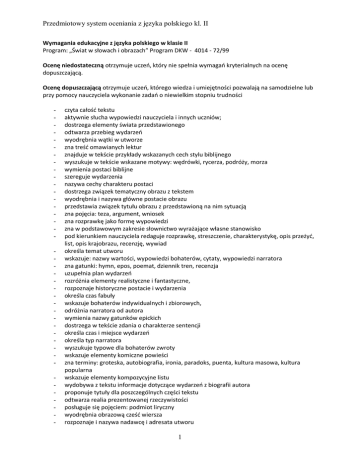 Przedmiotowy system oceniania z języka polskiego kl. II Wymagania edukacyjne z języka polskiego w klasie II Program: „Świat w słowach i obrazach” Program DKW - 4014 - 72/99 Ocenę niedostateczną otrzymuje uczeń, który nie spełnia wymagań kryterialnych na ocenę dopuszczającą. Ocenę dopuszczającą otrzymuje uczeń, którego wiedza i umiejętności pozwalają na samodzielne lub przy pomocy nauczyciela wykonanie zadań o niewielkim stopniu trudności - czyta całość tekstu aktywnie słucha wypowiedzi nauczyciela i innych uczniów; dostrzega elementy świata przedstawionego odtwarza przebieg wydarzeń wyodrębnia wątki w utworze zna treść omawianych lektur znajduje w tekście przykłady wskazanych cech stylu biblijnego wyszukuje w tekście wskazane motywy: wędrówki, rycerza, podróży, morza wymienia postaci biblijne szereguje wydarzenia nazywa cechy charakteru postaci dostrzega związek tematyczny obrazu z tekstem wyodrębnia i nazywa główne postacie obrazu przedstawia związek tytułu obrazu z przedstawioną na nim sytuacją zna pojęcia: teza, argument, wniosek zna rozprawkę jako formę wypowiedzi zna w podstawowym zakresie słownictwo wyrażające własne stanowisko pod kierunkiem nauczyciela redaguje rozprawkę, streszczenie, charakterystykę, opis przeżyć, list, opis krajobrazu, recenzję, wywiad określa temat utworu wskazuje: nazwy wartości, wypowiedzi bohaterów, cytaty, wypowiedzi narratora zna gatunki: hymn, epos, poemat, dziennik tren, recenzja uzupełnia plan wydarzeń rozróżnia elementy realistyczne i fantastyczne, rozpoznaje historyczne postacie i wydarzenia określa czas fabuły wskazuje bohaterów indywidualnych i zbiorowych, odróżnia narratora od autora wymienia nazwy gatunków epickich dostrzega w tekście zdania o charakterze sentencji określa czas i miejsce wydarzeń określa typ narratora wyszukuje typowe dla bohaterów zwroty wskazuje elementy komiczne powieści zna terminy: groteska, autobiografia, ironia, paradoks, puenta, kultura masowa, kultura popularna wskazuje elementy kompozycyjne listu wydobywa z tekstu informacje dotyczące wydarzeń z biografii autora proponuje tytuły dla poszczególnych części tekstu odtwarza realia prezentowanej rzeczywistości posługuje się pojęciem: podmiot liryczny wyodrębnia obrazową cześć wiersza rozpoznaje i nazywa nadawcę i adresata utworu 1 Przedmiotowy system oceniania z języka polskiego kl. II - na podstawie tekstu przedstawia sytuację liryczną na podstawie tekstu odtwarza elementy krajobrazu opisywanego miejsca określa temat utworu na poziomie dosłownym dostrzega szyk przestawny i nagromadzenie imiesłowów w wypowiedzi proponuje sposób wprowadzenia do tekstu znaków interpunkcyjnych określa czas prezentowany w wierszu dostrzega muzykalność wiersza podaje związki frazeologiczne i neologizmy, wyjaśnia ich znaczenia zna zasady kulturalnego prowadzenia dyskusji odróżnia świat realny od świata literackiego wyodrębnia sformułowania o charakterze tezy, pytania, wykrzyknienia odróżnia gatunki dramatyczne określa i nazywa swoje uczucia związane z lekturą utworu wie, na czym polega montaż filmowy projektuje tematyczną zawartość kilku ujęć filmowych wymienia nazwy różnych form radiowych wskazuje związki teledysku z filmem, określa relacje miedzy muzyką a filmem wskazuje cechy charakterystyczne telenoweli, reality show, reklamy próbuje rozpoznać typy zdań podrzędnie i współrzędnie złożonych, próbuje wymienić spójniki łączące zdania złożone współrzędnie wymienia nieosobowe formy czasownika rozpoznaje imiesłowy przymiotnikowe i przysłówkowe zna terminy: wyraz podstawowy i pochodny, rodzina wyrazów wymienia rodzaje formantów rozpoznaje w tekście wyrazy zapożyczone, neologizmy, archaizmy, związki frazeologiczne, skróty, skrótowce, synonimy, homonimy, homofony, antonimy zna zasady pisowni partykuły „nie” i „by” Ocenę dostateczną otrzymuje uczeń, który posiada wiadomości i umiejętności stosunkowo łatwe do opanowania, użyteczne w życiu codziennym i absolutnie niezbędne do kontynuowania nauki na wyższym szczeblu. Obowiązują go wymagania na ocenę dopuszczającą, a dodatkowo: - czyta płynnie z intonacyjnym wyodrębnieniem wypowiedzi bohaterów dostrzega symboliczne elementy świata przedstawionego odtwarza działania bohaterów rozpoznaje styl biblijny w tekście samodzielnie dostrzega motywy wymienia nazwy biblijnych postaci i miejsc relacjonuje przebieg wydarzeń zna dokładnie treść omawianych lektur charakteryzuje postać wymienia cechy przypowieści zestawia elementy świata przedstawionego na obrazie i w tekście rozpoznaje tezę, argument, wniosek uzasadnia własne stanowisko przy wsparciu nauczyciela redaguje rozprawkę, streszczenie wyodrębnia nazwy wartości i ich określenia podaje przykłady hymnów określa temat wypowiedzi narratora i bohaterów samodzielnie redaguje opis przeżyć, charakterystykę postaci, opis obrazu na podstawie definicji odtwarza cechy: hymnu, eposu, poematu, dziennika, trenu, recenzji układa plan najważniejszych wydarzeń 2 Przedmiotowy system oceniania z języka polskiego kl. II - wyodrębnia etapy podróży nazywa wartości, którymi kieruje się rycerz wskazuje związki między elementami realistycznymi i fantastycznymi podaje źródła cytatów wymienia przykłady mitów, utwory z motywem wędrówki, podróży, rycerza wyodrębnia z wypowiedzi narratora opis, relację, refleksję porządkuje elementy świata przedstawionego zna kilka gatunków lirycznych odróżnia fikcję od prawdy historycznej wymienia wydarzenia na podstawie których można określić czas akcji nazywa najważniejsze wartości w życiu rycerza rozpoznaje różne rodzaje opisu wykorzystuje fabułę i tytuł utworu do określenia jego tematyki wyróżnia trzy części kompozycyjne fabuły w prosty sposób wyjaśnia zawartość sentencji porównuje bohaterów odtwarza argumenty podane przez bohaterów cha