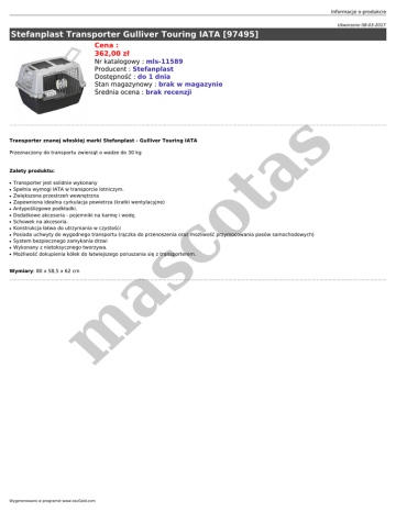 Informacje o produkcie Utworzono 08-03-2017 Stefanplast Transporter Gulliver Touring IATA [97495] Cena : 362,00 zł Nr katalogowy : mls-11589 Producent : Stefanplast Dostępność : do 1 dnia Stan magazynowy : brak w magazynie Średnia ocena : brak recenzji Zalety produktu: ● ● ● ● ● ● ● ● ● ● ● ● co ta Przeznaczony do transportu zwierząt o wadze do 30 kg s Transporter znanej włoskiej marki Stefanplast - Gulliver Touring IATA Transporter jest solidnie wykonany Spełnia wymogi IATA w transporcie lotniczym. Zwiększona przestrzeń wewnętrzna Zapewniona idealna cyrkulacja powietrza (kratki wentylacyjne) Antypoślizgowe podkładki. Dodatkowe akcesoria - pojemniki na karmę i wodę. Schowek na akcesoria. Konstrukcja łatwa do utrzymania w czystości Posiada uchwyty do wygodnego transportu (rączka do przenoszenia oraz możliwość przymocowania pasów samochodowych) System bezpiecznego zamykania drzwi Wykonany z nietoksycznego tworzywa. Możliwość dokupienia kółek do łatwiejszego poruszania się z transporterem. m as Wymiary: 80 x 58,5 x 62 cm Wygenerowano w programie www.oscGold.com
