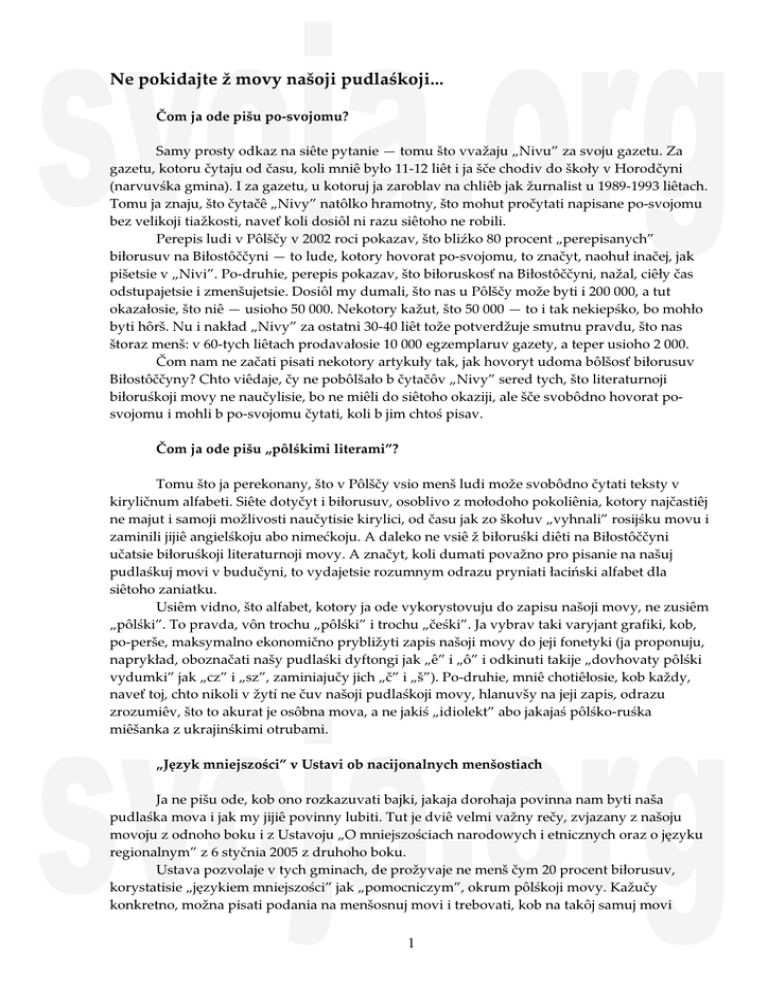 svoja.org Ne pokidajte ž movy našoji pudlaśkoji... Čom ja ode pišu po-svojomu? Samy prosty odkaz na siête pytanie — tomu što vvažaju „Nivu” za svoju gazetu. Za gazetu, kotoru čytaju od času, koli mniê było 11-12 liêt i ja šče chodiv do škoły v Horodčyni (narvuvśka gmina). I za gazetu, u kotoruj ja zaroblav na chliêb jak žurnalist u 1989-1993 liêtach. Tomu ja znaju, što čytačê „Nivy” natôlko hramotny, što mohut pročytati napisane po-svojomu bez velikoji tiažkosti, naveť koli dosiôl ni razu siêtoho ne robili. Perepis ludi v Pôlščy v 2002 roci pokazav, što bliźko 80 procent „perepisanych” biłorusuv na Biłostôččyni — to lude, kotory hovorat po-svojomu, to značyt, naohuł inačej, jak pišetsie v „Nivi”. Po-druhie, perepis pokazav, što biłoruskosť na Biłostôččyni, nažal, ciêły čas odstupajetsie i zmenšujetsie. Dosiôl my dumali, što nas u Pôlščy može byti i 200 000, a tut okazałosie, što niê — usioho 50 000. Nekotory kažut, što 50 000 — to i tak nekiepśko, bo mohło byti hôrš. Nu i nakład „Nivy” za ostatni 30-40 liêt tože potverdžuje smutnu pravdu, što nas štoraz menš: v 60-tych liêtach prodavałosie 10 000 egzemplaruv gazety, a teper usioho 2 000. Čom nam ne začati pisati nekotory artykuły tak, jak hovoryt udoma bôlšosť biłorusuv Biłostôččyny? Chto viêdaje, čy ne pobôlšało b čytačôv „Nivy” sered tych, što literaturnoji biłoruśkoji movy ne naučylisie, bo ne miêli do siêtoho okaziji, ale šče svobôdno hovorat posvojomu i mohli b po-svojomu čytati, koli b jim chtoś pisav. Čom ja ode pišu „pôlśkimi literami”? Tomu što ja perekonany, što v Pôlščy vsio menš ludi može svobôdno čytati teksty v kiryličnum alfabeti. Siête dotyčyt i biłorusuv, osoblivo z mołodoho pokoliênia, kotory najčastiêj ne majut i samoji možlivosti naučytisie kirylici, od času jak zo škołuv „vyhnali” rosijśku movu i zaminili jijiê angielśkoju abo nimećkoju. A daleko ne vsiê ž biłoruśki diêti na Biłostôččyni učatsie biłoruśkoji literaturnoji movy. A značyt, koli dumati považno pro pisanie na našuj pudlaśkuj movi v budučyni, to vydajetsie rozumnym odrazu pryniati łaciński alfabet dla siêtoho zaniatku. Usiêm vidno, što alfabet, kotory ja ode vykorystovuju do zapisu našoji movy, ne zusiêm „pôlśki”. To pravda, vôn trochu „pôlśki” i trochu „čeśki”. Ja vybrav taki varyjant grafiki, kob, po-perše, maksymalno ekonomično prybližyti zapis našoji movy do jeji fonetyki (ja proponuju, naprykład, oboznačati našy pudlaśki dyftongi jak „ê” i „ô” i odkinuti takije „dovhovaty pôlśki vydumki” jak „cz” i „sz”, zaminiajučy jich „č” i „š”). Po-druhie, mniê chotiêłosie, kob každy, naveť toj, chto nikoli v žytí ne čuv našoji pudlaśkoji movy, hlanuvšy na jeji zapis, odrazu zrozumiêv, što to akurat je osôbna mova, a ne jakiś „idiolekt” abo jakajaś pôlśko-ruśka miêšanka z ukrajinśkimi otrubami. svoja.org „Język mniejszości” v Ustavi ob nacijonalnych menšostiach Ja ne pišu ode, kob ono rozkazuvati bajki, jakaja dorohaja povinna nam byti naša pudlaśka mova i jak my jijiê povinny lubiti. Tut je dviê velmi važny rečy, zvjazany z našoju movoju z odnoho boku i z Ustavoju „O mniejszościach narodowych i etnicznych oraz o języku regionalnym” z 6 styčnia 2005 z druhoho boku. Ustava pozvolaje v tych gminach, de prožyvaje ne menš čym 20 procent biłorusuv, korystatisie „językiem mniejszości” jak „pomocniczym”, okrum pôlśkoji movy. Kažučy konkretno, možna pisati podania na menšosnuj movi i trebovati, kob na takôj samuj movi 1 svoja.org vradniki gminy čołoviêkovi odkazuvali. Zrozumiêło, što gmina maje obovjazok dati robotu takim uradnikam, kotory menšosnu movu znajut. Uže odčuvajete, kudy ja hnu? Ot že, takich biłoruśkich gminuv na Biłostôččyni je dvanadceť. Z Horodkom i Naruvkoju sprava bôlš-menš zrozumiêła. Chto maje maturu z biłoruśkoji movy z biełliceja, to robotu v siêtych gminach može dostati. Ale što z ostatnimi gminami: narvuvśkoju, bilśkovoju, čyžôvśkoju, hajnuvśkoju, vurlanśkoju, dubićkoju, kleščelôvśkoju, čeremuśkoju i našymi dvuma słavnymi horodami, Biêlśkom i Hajnuvkoju? Čy dumajete, što tam našy lude budut masovo hovoryti v gminach na biłoruśkuj literaturnuj movi i pisati na jôj podania? Ja odčuvaju, što vy tože smijetesie, dojšovšy do siêtoho miêstia... Kob dla siêtych 10 pudlaśkich gminuv Ustava ne była ono pustym papiêrciom, treba zrobiti našu pudlaśku movu „piśmovoju”, to značyt, takoju samoju normalnoju movoju, na jakôj pišut u „Nivi” tak samo ochvôtno, jak i na biłoruśkuj. A to značyt — bez dyskryminaciji i jakoho-leń movnoho getta v formi „Pudlaśkoji storônki”. Od „Nivy” treba było b začati, bo učanym i inteligentnym žurnalistam našoji gazety ne bude tiažko trochu napjatisie i od času do času šparnuti artykulčyk po-svojomu i zaochvotiti korespondentuv, kob robili toje same. A koli ministerstva začnut pisati „rozporządzenia wykonawcze” do Ustavy v konkretnych gminach, treba bude jim pudkazati, što v deseti našych gminach „językiem regionalnym” je pudlaśka mova, a ne biłoruśka literaturna. I pokazati tym ministram „Nivu”, kob pobačyli, jak pudlaśka mova vyhladaje. Bo inačej vony mohut ne poviêryti, što vona istniêje. Takiej mowy nie ma, obywatele Białorusini! Pokażcie mi jakiś tekst w tej waszej podlaskiej mowie, skoro tak twierdzicie! O tutaj, panie ministrze... Usio siête, jak kažut, proste jak duha. Ono što nam treba dobre popraciovati, kob ne „prosvistati” naohuł korysnu dla nas Ustavu ob menšostiach. I kob ne skompromitovatisie pered biłorusami v Kleščelach abo Vôrli, trebujučy od jich, kob vony hovoryli v gmini tak, jak Janka Kupała z Jakubom Kołasom. Nechaj kleščelôvci i 