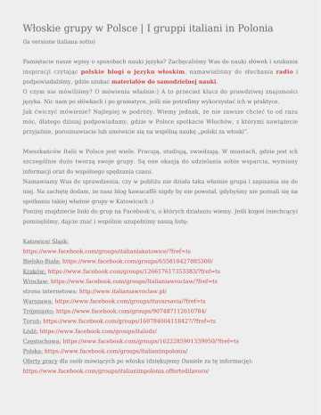 Włoskie grupy w Polsce | I gruppi italiani in Polonia (la versione italiana sotto) Pamiętacie nasze wpisy o sposobach nauki języka? Zachęcaliśmy Was do nauki słówek i szukania inspiracji czytając polskie blogi o języku włoskim, namawialiśmy do słuchania radio i podpowiadaliśmy, gdzie szukać materiałów do samodzielnej nauki. O czym nie mówiliśmy? O mówieniu właśnie:) A to przecież klucz do prawdziwej znajomości języka. Nic nam po słówkach i po gramatyce, jeśli nie potrafimy wykorzystać ich w praktyce. Jak ćwiczyć mówienie? Najlepiej w podróży. Wiemy jednak, że nie zawsze chcieć to od razu móc, dlatego dzisiaj podpowiadamy, gdzie w Polsce spotkacie Włochów, z którymi nawiążecie przyjaźnie, porozmawiacie lub umówicie się na wspólną naukę „polski za włoski”. Mieszkańców Italii w Polsce jest wiele. Pracują, studiują, zwiedzają. W miastach, gdzie jest ich szczególnie dużo tworzą swoje grupy. Są one okazją do udzielania sobie wsparcia, wymiany informacji oraz do wspólnego spędzania czasu. Namawiamy Was do sprawdzenia, czy w pobliżu nie działa taka właśnie grupa i zapisania się do niej. Na zachętę dodam, że nasz blog kawacaffè nigdy by nie powstał, gdybyśmy nie poznali się na spotkaniu takiej właśnie grupy w Katowicach ;) Poniżej znajdziecie linki do grup na Facebook’u, o których działaniu wiemy. Jeśli kogoś (niechcący) pominęliśmy, dajcie znać i wspólnie uzupełnimy naszą listę: Katowice/ Śląsk: https://www.facebook.com/groups/italianiakatowice/?fref=ts Bielsko-Biała: https://www.facebook.com/groups/655818427885300/ Kraków: https://www.facebook.com/groups/126617617353383/?fref=ts Wrocław: https://www.facebook.com/groups/Italianiawroclaw/?fref=ts strona internetowa: http://www.italianiawroclaw.pl/ Warszawa: https://www.facebook.com/groups/itavarsavia/?fref=ts Trójmiasto: https://www.facebook.com/groups/907487112610784/ Toruń: https://www.facebook.com/groups/160784004118427/?fref=ts Łódź: https://www.facebook.com/groups/italodz/ Częstochowa: https://www.facebook.com/groups/1622285901339950/?fref=ts Polska: https://www.facebook.com/groups/italianiinpolonia/ Oferty pracy dla osób mówiących po włosku (dziękujemy Daniele za tę informację): https://www.facebook.com/groups/italianiinpolonia.offertedilavoro/ Jeśli zaś chcecie poczytać o Polsce po włosku, zerknijcie na bloga Qui Polonia & Italia (https://quipoloniaeitalia.wordpress.com/) i do grupy https://www.facebook.com/groups/643495175665949/?fref=ts Przyjemnej nauki:) I gruppi italiani in Polonia Vi ricordate i nostri post sull’apprendimento della lingua? Vi abbiamo invogliato a imparare tante parole e cercare l’ispirazione leggendo i blog polacchi sulla lingua italiana, vi abbiamo consigliato di ascoltare la radio e vi abbiamo detto dove trovare del materiale per imparare la lingua da soli. Di che cosa non abbiamo ancora parlato? Proprio del parlare:) Questo è però la chiave per una vera conoscenza di una lingua. Non è importante quante parole o regole di grammatica conosciamo se non le sappiamo uttilizzare nella pratica. Come allora praticare la lingua parlata? Soprattutto in viaggio. In ogni caso sappiamo bene che non sempre volere è potere, oggi allora vi suggeriamo dove incontrerete gli Italiani in Polonia con cui potrete fare amicizie, discutere o forse anche studiare insieme scambiando l’insegnamento del polacco con l’italiano. In Polonia ci sono molti Italiani che lavorano, studiano o visitano il Paese. Nelle città dove vivono numerosi, gli italiani hanno creato i propri gruppi che danno loro la possibilità di trovare un supporto, scambiare informazioni o passare il tempo insieme. Vi invogliamo a trovare il gruppo di questo tipo vicino a voi e iscrivervi. Per invogliarvi aggiungo solo che il nostro blog kawacaffè non sarebbe creato mai se non ci fossimo incontrati all’incontro del gruppo „Italiani a Katowice” :) Sotto troverete i link per i gruppi su Facebook che conosciamo. Se abbiamo tralasciato qualche gruppo (non apposta) fateci sapere e aggiorneremo la lista: Katowice/ Slesia: https://www.facebook.com/groups/italianiakatowice Bielsko-Biała: https://www.facebook.com/groups/655818427885300/ Cracovia: https://www.facebook.com/groups/126617617353383 Breslavia: https://www.facebook.com/groups/Italianiawroclaw/?fref=ts il sito: http://www.italianiawroclaw.pl/ Varsavia: https://www.facebook.com/groups/itavarsavia/?fref=ts Le Tre città (Danzica, Sopot, Gdynia): https://www.facebook.com/groups/907487112610784/ Torun: https://www.facebook.com/groups/160784004118427/?fref=ts Lodz: https://www.facebook.com/groups/italodz/ Czestochowa: https://www.facebook.com/groups/1622285901339950/?fref=ts la Polonia: https://www.facebook.com/groups/italianiinpolonia/ Offerte di lavoro per quelli che parlano italiano (grazie Daniele per questa informazione): https://www.facebook.com/groups/italianiinpolonia.offertedilavoro/ Se invece avete voglia di leggere in italiano sulla Polonia date un’occhiata al blog Qui Polonia & Italia ( https://quipoloniaeitalia.wordpress.com/) https://www.facebook.com/groups/643495175665949/?fref=ts o al gruppo: