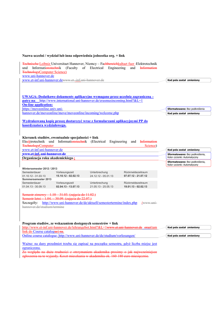 Nazwa uczelni / wydział lub inna odpowiednia jednostka org. + link Technische Leibniz Universitaet Hannover, Niemcy – Fachbereichkultaet fuer Elektrotechnik und Informationstechnik (Faculty of Electrical Engineering and Information TechnologyComputer Science) www.uni-hannover.de www.et-inf.uni-hannover.dewww.et.-inf.uni-hannover.de UWAGA: Dodatkowe dokumenty aplikacyjne wymagane przez uczelnię zagraniczną – patrz na: http://www.international.uni-hannover.de/erasmusincoming.html?&L=1 On-line application: https://moveonline.univ.unihannover.de/moveonline/move/moveonline/incoming/welcome.php Kod pola został zmieniony Sformatowano: Bez podkreślenia Kod pola został zmieniony Wydrukowaną kopię proszę dostarczyć wraz z formularzami aplikacyjnymi PP do koordynatora wydziałowego. Kierunek studiów, ewentualnie specjalności + link Elecktrotechnik und Informationstechnik (Electrical TechnologyComputer www.et-inf.uni-hannover.de www.et-inf..uni-hannover.de Organizacja roku akademickiego : Engineering and Information Science) Kod pola został zmieniony Sformatowano: Bez podkreślenia, Kolor czcionki: Automatyczny Sformatowano: Bez podkreślenia, Kolor czcionki: Automatyczny Wintersemester 2012 / 2013 Semesterdauer Vorlesungszeit 15.10.12 - 02.02.13 01.10.12 - 31.03.13 Sommersemester 2013 Semesterdauer Vorlesungszeit 02.04.13 - 13.07.13 01.04.13 - 30.09.13 Unterbrechung 24.12.12 - 05.01.13 Rückmeldezeitraum 07.07.12 - 21.07.12 Unterbrechung 21.05.13 - 25.05.13 Rückmeldezeitraum 19.01.13 - 02.02.13 Semestr zimowy – 1.10 – 31.03. (zajęcia do 11.02.) Semestr letni – 1.04. – 30.09. (zajęcia do 22.07.) Szczegóły: http://www.uni-hannover.de/de/aktuell/semestertermine/index.php hannover.de/studium/termine /www.uni- Program studiów, ze wskazaniem dostępnych semestrów + link http://www.et-inf.uni-hannover.de/lehrangebot.html?&L=1www.et.uni-hannover.de oraz(tam link do Course catalogue) na. Online course catalogue: http://www.uni-hannover.de/de/studium/vorlesungen/ Ważne: na dany przedmiot trzeba się zapisać na początku semestru, gdyż liczba miejsc jest ograniczona. Ze względu na duże trudności z otrzymaniem akademika prosimy o jak najwcześniejsze zgłoszenia na te wyjazdy. Koszt mieszkania w akademiku ok. 160-180 euro miesięcznie. Kod pola został zmieniony Kod pola został zmieniony Podstawowe informacje o terminie rozpoczęcia i zakończenia semestru w języku niemieckim/angielskim dostępne są na głównej stronie uniwersytetu: www.uni-hannover.de. Dokładne opisy przedmiotów znajdują się na stronach poszczególnych instytutów – Instytut Elektroniki i Telekomunikacji PP tematycznie zajmuje się tym, co kilka instytutów w Hanowerze (w Hanowerze instytut to najmniejsza naukowa jednostka organizacyjna, nie ma podziałów na zakłady). Z telekomunikacyjnego punktu widzenia najciekawszym instytutem jest Institut für KommunikationstechnikInstitut fuer Allgemeine Nachrichtentechnik (Inst. of Communications EngineeringTechnology; www.ant.uni-hannover.de. Na tej stronie znajduje się szczegółowy opis przedmiotów, które można sobie wybrać. Ponadto warto zajrzeć na strony http://www.tnt.uni-hannover.de/. Dla osób interesujących się projektowaniem i implementacją układów cyfrowych warta polecenia jest strona http://www.ims.unihannover.de/. Warte polecenia może być także www.dbs.uni-hannover.de. Lista wszystkich instytutów znajduje się tutaj http://www.uni-hannover.de/de/fakultaeten/fkeltin/institute/index.php. Można także uczęszczać na przedmioty związane tematycznie z telekomunikacją, prowadzone przez instytuty informatyczne. Wykaz wszystkich wykładów znajdzieuje się na stronie http://qis.verwaltung.unihannover.de/qisserver/rds;jsessionid=F5CB513E8C917A08EB5621F9069328EA?state=wtree &search=1&trex=step&root120082=16418|19866&P.vx=langhttp://qis.verwaltung.unihannover.de/qisserver/servlet/de.his.servlet.RequestDispatcherServlet?state=wtree&search=1 &trex=step&root120051=2924|2978|2780&P.vx=lang Podstawa do zaliczenia przedmiotu jest egzamin, obecność na wykładach i ćwiczeniach jest nieobowiązkowa. Egzamin przeważnie po niemiecku, ale angielski też jest możliwy – wszystko zależy od profesorów, którzy są prawie zawsze wyrozumiali. Termin i charakter egzami Zajęcia prowadzone są prawie wyłącznie po niemiecku. Kursy j. niemieckiego http://www.international.uni-hannover.de/182.html?&L=1 Kod pola został zmieniony Warunki i możliwość uzyskania dyplomu Uzyskanie dyplomu wymaga odbycia regularnych studiów magisterskich. Link (na stronach partnerów) do: ECTS Information Package / Inf. for Foreign Students itp. International students info http://www.uni-hannover.de/en/internationales/ Kod pola został zmieniony Info for ERASMUS students incoming: http://www.international.uni-hannover.de/erasmusincoming.html?&L=1 Kod pola został zmieniony Guide for visiting and exchange students: http://www.uni-hannover.de/auslandsamt/deutsch/internoff /european_credit_transfer_system.html www.uni-hannover.de/en/internationales/index.php www.uni-hannover.de > Studies >Range of Studies (Study Guide) www.unihannover.de/imperia/md/content/internationaloffice/auslandsstudium/erasmus/guidexchange_ web_02_save.pdf International Sformatowano: Bez podkreślenia, Kolor czcionki: Automatyczny Kod pola został zmieniony Sformatowano: Bez podkreślenia, Kolor czcionki: Automatyczny Sformatowano: Bez podkreślenia, Kolor czcionki: Automatyczny Sformatowane: Punktory i numeracja Kod pola został zmieniony Informacje INFORMACJE praktycznePRAKTYCZNE www.uni-hannover.de/en/studium/ campus Opłata za studia Nie ma dla studentów SocratesaErasmusa. Optymalny przejazd/przelot Hanower jest niedaleko od granicy i można w weekendy jeździć pociągiem za około 6-7 euro, wykorzystując bilety Wochenendticket. Przykładowa trasa: Frankfurt Oder - Magdeburg Hbf - Braunschweig Hbf – -Hannover. Czas przejazdu po stronie niemieckiej: 6 godzin. Najlepiej jednak dopisać 