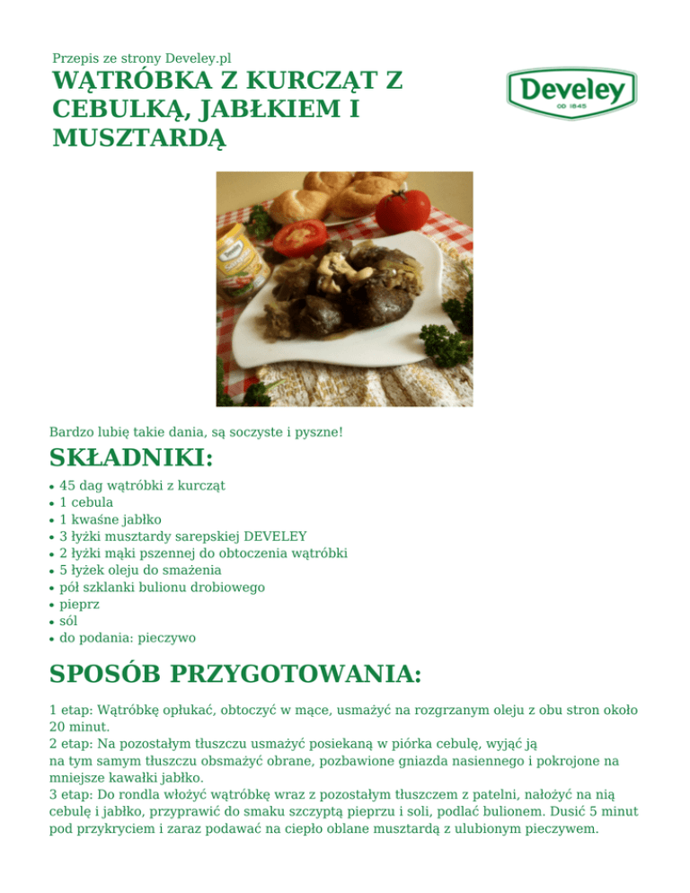 Przepis ze strony Develey.pl WĄTRÓBKA Z KURCZĄT Z CEBULKĄ, JABŁKIEM I MUSZTARDĄ Bardzo lubię takie dania, są soczyste i pyszne! SKŁADNIKI: ● ● ● ● ● ● ● ● ● ● 45 dag wątróbki z kurcząt 1 cebula 1 kwaśne jabłko 3 łyżki musztardy sarepskiej DEVELEY 2 łyżki mąki pszennej do obtoczenia wątróbki 5 łyżek oleju do smażenia pół szklanki bulionu drobiowego pieprz sól do podania: pieczywo SPOSÓB PRZYGOTOWANIA: 1 etap: Wątróbkę opłukać, obtoczyć w mące, usmażyć na rozgrzanym oleju z obu stron około 20 minut. 2 etap: Na pozostałym tłuszczu usmażyć posiekaną w piórka cebulę, wyjąć ją na tym samym tłuszczu obsmażyć obrane, pozbawione gniazda nasiennego i pokrojone na mniejsze kawałki jabłko. 3 etap: Do rondla włożyć wątróbkę wraz z pozostałym tłuszczem z patelni, nałożyć na nią cebulę i jabłko, przyprawić do smaku szczyptą pieprzu i soli, podlać bulionem. Dusić 5 minut pod przykryciem i zaraz podawać na ciepło oblane musztardą z ulubionym pieczywem.