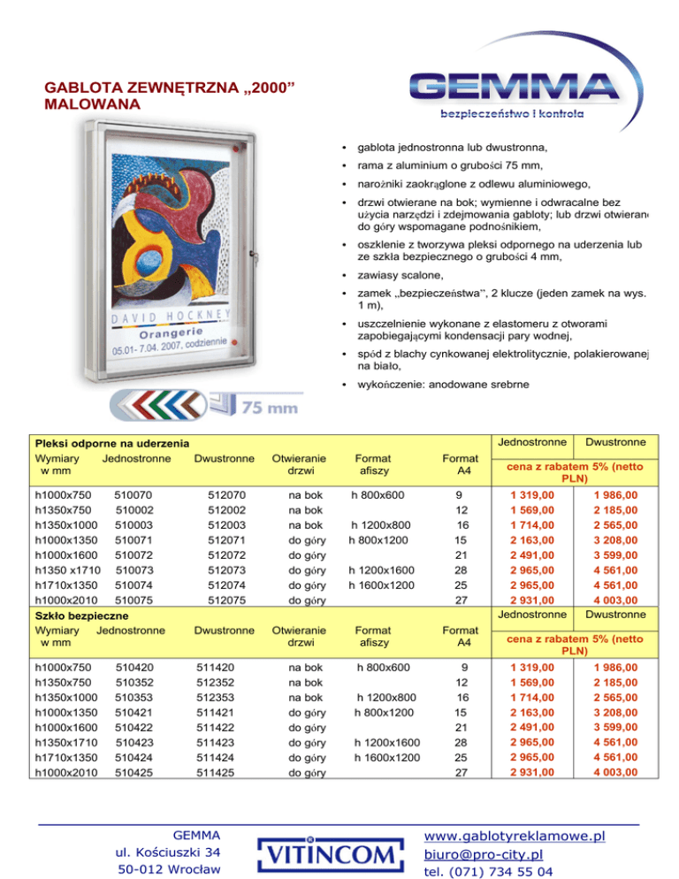 GABLOTA ZEWNĘTRZNA „2000” MALOWANA • gablota jednostronna lub dwustronna, • rama z aluminium o grubości 75 mm, • narożniki zaokrąglone z odlewu aluminiowego, • drzwi otwierane na bok; wymienne i odwracalne bez użycia narzędzi i zdejmowania gabloty; lub drzwi otwierane do góry wspomagane podnośnikiem, • oszklenie z tworzywa pleksi odpornego na uderzenia lub ze szkła bezpiecznego o grubości 4 mm, • zawiasy scalone, • zamek „bezpieczeństwa”, 2 klucze (jeden zamek na wys. 1 m), • uszczelnienie wykonane z elastomeru z otworami zapobiegającymi kondensacji pary wodnej, • spód z blachy cynkowanej elektrolitycznie, polakierowanej na biało, • wykończenie: anodowane srebrne Pleksi odporne na uderzenia Wymiary Jednostronne Dwustronne w mm h1000x750 510070 h1350x750 510002 h1350x1000 510003 h1000x1350 510071 h1000x1600 510072 h1350 x1710 510073 h1710x1350 510074 h1000x2010 510075 Szkło bezpieczne Wymiary Jednostronne w mm h1000x750 h1350x750 h1350x1000 h1000x1350 h1000x1600 h1350x1710 h1710x1350 h1000x2010 510420 510352 510353 510421 510422 510423 510424 510425 512070 512002 512003 512071 512072 512073 512074 512075 Dwustronne 511420 512352 512353 511421 511422 511423 511424 511425 GEMMA ul. Kościuszki 34 50-012 Wrocław Jednostronne Otwieranie drzwi na bok na bok na bok do góry do góry do góry do góry do góry Otwieranie drzwi na bok na bok na bok do góry do góry do góry do góry do góry Format afiszy h 800x600 h 1200x800 h 800x1200 h 1200x1600 h 1600x1200 Format afiszy h 800x600 h 1200x800 h 800x1200 h 1200x1600 h 1600x1200 Format A4 9 12 16 15 21 28 25 27 Format A4 9 12 16 15 21 28 25 27 Dwustronne cena z rabatem 5% (netto PLN) 1 319,00 1 569,00 1 714,00 2 163,00 2 491,00 2 965,00 2 965,00 2 931,00 Jednostronne 1 986,00 2 185,00 2 565,00 3 208,00 3 599,00 4 561,00 4 561,00 4 003,00 Dwustronne cena z rabatem 5% (netto PLN) 1 319,00 1 569,00 1 714,00 2 163,00 2 491,00 2 965,00 2 965,00 2 931,00 1 986,00 2 185,00 2 565,00 3 208,00 3 599,00 4 561,00 4 561,00 4 003,00 www.gablotyreklamowe.pl [email protected] tel. (071) 734 55 04