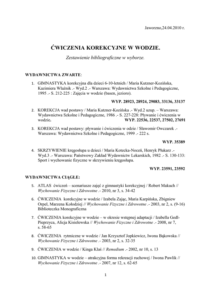 Jaworzno,24.04.2010 r. ĆWICZENIA KOREKCYJNE W WODZIE. Zestawienie bibliograficzne w wyborze. WYDAWNICTWA ZWARTE: 1. GIMNASTYKA korekcyjna dla dzieci 6-10-letnich / Maria Kutzner-Kozińska, Kazimiera Wlaźnik .- Wyd.2 .- Warszawa: Wydawnictwa Szkolne i Pedagogiczne, 1995 .- S. 212-225 : Zajęcia w wodzie (basen, jezioro). WYP. 28923, 28924, 29083, 33136, 33137 2. KOREKCJA wad postawy / Maria Kutzner-Kozińska .- Wyd.2 uzup. – Warszawa: Wydawnictwa Szkolne i Pedagogiczne, 1986 .- S. 227-228: Pływanie i ćwiczenia w wodzie. WYP. 22536, 22537, 27502, 27691 3. KOREKCJA wad postawy: pływanie i ćwiczenia w odzie / Sławomir Owczarek .- Warszawa: Wydawnictwa Szkolne i Pedagogiczne, 1999 .- 222 s. WYP. 35389 4. SKRZYWIENIE kręgosłupa u dzieci / Maria Kotecka-Noceń, Henryk Płukarz .- Wyd.3 .- Warszawa: Państwowy Zakład Wydawnictw Lekarskich, 1982 .- S. 130-133: Sport i wychowanie fizyczne w skrzywieniu kręgosłupa. WYP. 23591, 23592 WYDAWNICTWA CIĄGŁE: 5. ATLAS ćwiczeń – scenariusze zajęć z gimnastyki korekcyjnej / Robert Makuch // Wychowanie Fizyczne i Zdrowotne .- 2010, nr 3, s. 34-42 6. ĆWICZENIA korekcyjne w wodzie / Izabela Zając, Maria Karpińska, Zbigniew Orpel, Marzena Kołodziej // Wychowanie Fizyczne i Zdrowotne .- 2003, nr 2, s. (9-16) Biblioteczka Monograficzna 7. ĆWICZENIA korekcyjne w wodzie – w okresie wstępnej adaptacji / Izabella Gedl- Pieprzyca, Alicja Kisielewska // Wychowanie Fizyczne i Zdrowotne .- 2008, nr 7, s. 58-65 8. ĆWICZENIA rytmiczne w wodzie / Jan Krzysztof Jopkiewicz, Iwona Bąkowska // Wychowanie Fizyczne i Zdrowotne .- 2003, nr 2, s. 32-35 9. ĆWICZENIA w wodzie / Kinga Klaś // Remedium .- 2002, nr 10, s. 13 10. GIMNASTYKA w wodzie – atrakcyjna forma rekreacji ruchowej / Iwona Pawlik // Wychowanie Fizyczne i Zdrowotne .- 2007, nr 12, s. 62-65 1 11. HYDROAEROBIK / Monika Michalska // Lider .- 2002, nr 2, s. 21-22 12. JOGGING w wodzie głębokiej – z elementami ćwiczeń w celu korekcji wad postawy / Izabella Gedl-Pieprzyca, Alicja Kisielewska // Wychowanie Fizyczne i Zdrowotne .2010, nr 4, s. 21-24 13. KOREKCJA wad postawy – w formie aquagimnastyki / Izabella Gedl-Pieprzyca, Alicja Kisielewska // Wychowanie Fizyczne i Zdrowotne .- 2010, nr 4, s. 25-33 14. KSZTAŁTOWANIE koordynacji ruchowej i równowagi dzieci z wadami postawy w środowisku wodnym / Paweł Różański // Wychowanie Fizyczne i Zdrowotne .- 2000, nr 5, s. 188-192 15. KSZTAŁTOWANIE stabilizacji postawy ciała dzieci za pomocą ćwiczeń równoważnych w wodzie / Paweł Różański, Anna Chamerska // Lider .- 2004, nr 12, s. 25-26, bibliogr. 16. PŁYWANIE dzieci w wieku 5-6 lat z elementami korekcji / Paweł Różański // Wychowanie Fizyczne i Zdrowotne .- 2005, nr 2, s. 14-18, bibliogr. 17. PŁYWANIE korekcyjne a oczekiwania rodziców / Paweł Różański // Lider .- 1997, nr 10, s. 22-23 18. PŁYWANIE korekcyjne – ćwiczenia korekcyjne z nauką pływania i rekreacja w wodzie dla klas I-III szkoły podstawowej (Program autorski)/ Alicja Kowalska, Iwona Kwiatek // Lider .- 2007, nr 5, s. 24-30 19. PŁYWANIE korekcyjne z przedszkolakami / Paweł Różański // Wychowanie Fizyczne i Zdrowotne .- 1998, nr 4, s. (58-63) Biblioteczka Monograficzna 20. ROLA pływania w procesie rewalidacji dzieci z wadą słuchu /Aleksandra Bulas // Lider .- 1998, nr 10, s. 19 21. WPŁYW ćwiczeń w wodzie na kształtowanie postawy ciała dziecka / Barbara Waade, Stanisław Przybylski // Wychowanie Fizyczne i Zdrowotne .- 2000, nr 5, s. 193-195, bibliogr. 22. WYBRANE aspekty usprawniania korekcyjnego w wodzie / Paweł Różański // Wychowanie Fizyczne i Zdrowotne .- 2004, nr 8-9, s. (6-8) Biblioteczka Monograficzna 23. ZAJĘCIA gimnastyki korekcyjno-kompensacyjnej w szkole / Grażyna Adamczyk- Świnicka, Anna Bargieł, Maria Turczeniewicz // Lider .- 1995, nr 2, s. 3-30 24. ZASTOSOWANIE piłki w hydroterapii /Izabella Gedl-Pieprzyca, Grzegorz Głąb // Wychowanie Fizyczne i Zdrowotne .- 2004, nr 8-9, s. (8-12) Biblioteczka Monograficzna oprac. Barbara Kucharska PBW-Filia w Jaworznie 2 3