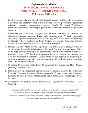 Ogłoszenia parafialne IV NIEDZIELA WIELKANOCNA NIEDZIELA DOBREGO PASTERZA 17 kwietnia 2016 roku 1. Dzisiejsza niedziela jest Niedzielą Dobrego Pasterza. Módlmy się w tym dniu o świętość dla kapłanów oraz o nowe, liczne i święte powołania kapłańskie, zakonne i misyjne, szczególnie z naszej Parafii. W naszej Wspólnocie parafialnej niedziele seminaryjną przeżywać będziemy dopiero na początku czerwca. 2. Zbliża się maj – miesiąc Maryjny. Pod chórem znajdują się karteczki na zbiorowe intencje majowe. Przez cały miesiąc maj W tych intencjach będziemy odprawiać codziennie Mszę Św. o g. 1800, a wyczytywać będziemy te intencje tylko w niedziele na Mszy Świętej wieczornej. Wypisane intencje na kartkach można składać wraz z ofiarami w zakrystii. 3. Dzisiaj o g. 1500 Msza Święta i spotkanie dla Dzieci, które przygotowują się do pierwszej Spowiedzi i do pierwszej Komunii Św. oraz ich rodziców. Dzieci te, po raz pierwszy przystąpią do Sakramentu Pokuty i Pojednania w piątek 22 kwietnia o godz. 1830. Prosimy o wpisywanie się na rozmowę egzaminacyjną z ks. Proboszczem w zakrystii. Dzieci, które się nie zgłosiły na rozmowę, na razie są niedopuszczone do tych sakramentów. W gablocie jest wywieszona lista Dzieci dopuszczonych. 4. W sobotę 23 kwietnia obchodzimy Uroczystość Św. Wojciecha, Bpa i Męcz., głównego patrona Polski. 5. Informujemy, że Sakrament Bierzmowania w naszej parafii będzie udzielony 21 maja; Pierwsza Komunia Święta przypada 22 maja a rocznica Pierwszej Komunii Świętej 29 maja. Peregrynacja figury Fatimskiej i rekolekcje od 8 do 11 maja. 6. Zachęcamy do lektury prasy katolickiej: Tygodników Niedziela i Gość Niedzielny. Serdeczne Bóg zapłać za wspólną modlitwę oraz za ofiary składane na Kościół. Wszystkim Wiernym życzymy radosnej niedzieli i błogosławionego tygodnia. Pozwólmy się prowadzić Panu Jezusowi, Dobremu Pasterzowi i zawsze Go słuchajmy; On poprowadzi nas przez życie ku zbawieniu. …..…………….................. Ks. Piotr Kopera SAC Proboszcz