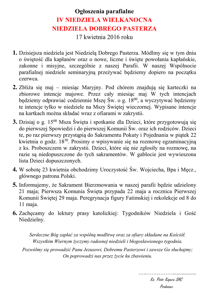 Ogłoszenia parafialne IV NIEDZIELA WIELKANOCNA NIEDZIELA
