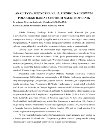 ANALITYKA MEDYCZNA NA 12. PIKNIKU NAUKOWYM POLSKIEGO RADIA I CENTRUM NAUKI KOPERNIK Dr n. farm. Grażyna Sygitowicz (Opiekun SKN DiagMed) Katedra i Zakład Biochemii i Chemii Klinicznej WUM Piknik Naukowy Polskiego Radia i Centrum Nauki Kopernik jest jedną z największych, warszawskich imprez plenerowych o tematyce naukowej, której celem jest propagowanie wiedzy z różnych dyscyplin naukowych poprzez interesujące eksperymenty oraz prezentacje. W zeszłym roku Komisja Europejska wyróżniła ten Piknik jako niezwykle ciekawy europejski projekt ostatnich lat, rozpowszechniający naukę w społeczeństwie. „Poznaj język nauki” to przewodnia myśl tegorocznej, już 12.edycji Pikniku Naukowego. Ogromne rzesze warszawiaków, ale i nie tylko, ściągnęło w tym roku na Nowe Miasto i Podzamcze w dniu 14 czerwca 2008r., gdzie prezentowało swoje osiągnięcia naukowe ponad 180 instytucji naukowych. Wszystkie biorące udział w Pikniku, instytucje naukowe przygotowały niezwykle fascynujące, godne polecenia pokazy i prezentacje, które cieszyły się niezwykle dużym zainteresowaniem. Wśród instytucji naukowych nie zabrakło również i Warszawskiego Uniwersytetu Medycznego. Studenckie Koło Naukowe DiagMed Oddziału Analityki Medycznej Wydziału Farmaceutycznego WUM aktywnie uczestniczyło w 12. Pikniku Naukowym, przedstawiając swój własny program pt.:„Diagnostyka językiem zdrowia”. Podobnie, jak w poprzednim roku została powołana Rada Programowa 12.Pikniku Naukowego, w której skład wchodzili: prof. dr hab. Jan Pachecka, dr Grażyna Sygitowicz oraz studenci Koła Naukowego DiagMed: Maciej Janiak, Paweł Kozłowski i Wojciech Zabłocki. Na koordynatora, odpowiedzialnego za zorganizowanie pokazów i współpracę z organizatorami Pikniku (Polskie Radio i Centrum Nauki Kopernik) ponownie wybrano dr Grażynę Sygitowicz. W tym roku Organizatorzy Pikniku Oddział Analityki Medycznej umieścili na Podzamczu w namiocie nr 128.. Graniczył on, po lewej stronie z Warsztatami Analiz Socjologicznych (namiot 129), po prawej stronie z Fundacją Rozwoju Kardiochirurgii w Zabrzu (namiot 127), zaś na tyłach namiotu była ścianka wspinaczkowa operatora sieci Plus (namiot 32A) W tym roku Koło Naukowe DiagMed przygotowało bogaty program, który spotkał się z dużym aplauzem Piknikowiczów. „Diagnostyka językiem zdrowia” przygotowała pokazy i prezentacje w różnych grupach tematycznych, między innymi takie jak: 1. CZŁOWIEK i JEGO PROBLEMY – przedstawione prezentacje multimedialne przybliżyły zainteresowanym ciekawostki związane z anatomią i fizjologią człowieka; fizjologiczną mikroflorą człowieka oraz możliwościami jej zachwiania, prowadzącymi do ewentualnych zakażeń. Dużym zainteresowaniem, wśród odwiedzających namiot Analityki Medycznej cieszyły się pokazy struktury modeli DNA, RNA i HIV oraz możliwość obejrzenia pod mikroskopem biologicznym złogów krystalicznych (kamieni), powstających w drogach moczowych i żółciowych człowieka. Zainteresowani mieli możliwość obejrzenia tasiemca nieuzbrojonego w formie utrwalonej. Przygotowano wiele ulotek informacyjnych związanych z tymi zagadnieniami. 2. LABORATORIUM KLINICZNE – prezentacje multimedialne pomogły przeprowadzić odwiedzających namiot Analityki Medycznej poprzez współczesne, dobrze wyposażone, pełnoprofilowe laboratorium diagnostyczne. Dzięki tym prezentacjom na ekranie komputera można było zobaczyć powstawanie i wędrówkę różnych rodzajów krwinek w płynach ustrojowych, a także na czym polega automatyczny pomiar morfologii krwi w analizatorze hematologicznym. Dopełnieniem tych prezentacji multimedialnych była możliwość obejrzenia różnych rozmazów krwi obwodowej: prawidłowej i patologicznej. Dla porównania przygotowano również rozmazy krwi obwodowej różnych zwierząt, np. psa, kota, konia, kozy czy nawet fretki. Piknikowicze mieli możliwość obejrzenia pod mikroskopem stereoskopowym tychże rozmazów krwi oraz porównywali je chociażby pod kątem wielkości, barwy czy liczby poszczególnych komórek w polu widzenia. Zadawano wiele pytań, świadczących o potrzebie rozpowszechniania takiej wiedzy wśród ogółu społeczeństwa. 3. HEMATOLOGIA - w warunkach plenerowych możliwości pobierania krwi i jej ocena są bardzo ograniczone (nie jest możliwa pełna diagnostyka, tak jak ma to miejsce w laboratorium diagnostycznym). Pokuszono się jednak o szybką, ocenę paskową w kropli krwi pobranej z opuszki palca (nakłucie tak jak glukometrem) w celu pomiaru stężenia hemoglobiny, a w niektórych przypadkach wykonywano nawet oznaczenie hematokrytu osobom zainteresowanym. Do tych oznaczeń Analityka Medyczna była dobrze przygotowana, sprowadzając do namiotu nawet wirówkę hematokrytową, która sama w sobie budziła już duże zainteresowanie. Osoby, które pragnęły wziąć udział w niniejszych badaniach wcześniej wypełniały ankietę, obejmującą 15 pytań (m.in.: wiek, płeć, ogólny stan zdrowia i inne). 4. LABORATORIUM KRYMINALISTYCZNE – w warunkach plenerowych przybliżano zastosowanie metod m.in.: traseologicznych i daktyloskopowych podczas zbierania dowodów postępowania kryminalistycznego w miejscu przestępstwa. Daktyloskopia identyfikuje na podstawie odbitki wzoru linii papilarnych (listewek) dłoni pozostawionych na miejscu zdarzenia. Wzór linii papilarnej, jest niepowtarzalny dla każdego człowieka, ale składa się z określonych indywidualnych elementów tzw. minucji. W celach identyfikacji śladów daktyloskopijnych wykorzystuje się: ogólny układ linii papilarnych tworzący wzory, minucje, rozmieszczenie i kształt porów, nieregularne kształty krawędzi linii. Traseologia zaś, bada przede wszystkim ślady przemieszczania się człowieka - zarówno pieszo, jak i za pomocą środków transportu. Przeprowadzana jest identyfikacja grupowa i indywidualna. Badania grupowe to przede wszystkim porównanie wzoru spodu obuwia, któ