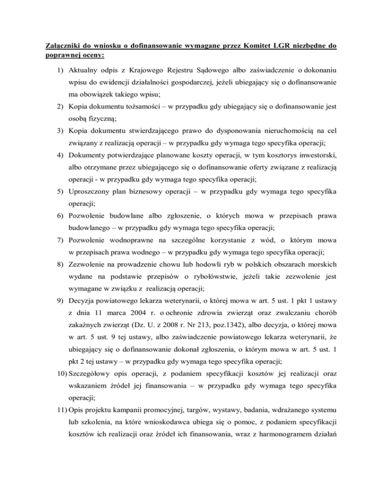 Załączniki do wniosku o dofinansowanie wymagane przez Komitet LGR niezbędne do poprawnej oceny: 1) Aktualny odpis z Krajowego Rejestru Sądowego albo zaświadczenie o dokonaniu wpisu do ewidencji działalności gospodarczej, jeżeli ubiegający się o dofinansowanie ma obowiązek takiego wpisu; 2) Kopia dokumentu tożsamości – w przypadku gdy ubiegający się o dofinansowanie jest osobą fizyczną; 3) Kopia dokumentu stwierdzającego prawo do dysponowania nieruchomością na cel związany z realizacją operacji – w przypadku gdy wymaga tego specyfika operacji; 4) Dokumenty potwierdzające planowane koszty operacji, w tym kosztorys inwestorski, albo otrzymane przez ubiegającego się o dofinansowanie oferty związane z realizacją operacji - w przypadku gdy wymaga tego specyfika operacji; 5) Uproszczony plan biznesowy operacji – w przypadku gdy wymaga tego specyfika operacji; 6) Pozwolenie budowlane albo zgłoszenie, o których mowa w przepisach prawa budowlanego – w przypadku gdy wymaga tego specyfika operacji; 7) Pozwolenie wodnoprawne na szczególne korzystanie z wód, o którym mowa w przepisach prawa wodnego – w przypadku gdy wymaga tego specyfika operacji; 8) Zezwolenie na prowadzenie chowu lub hodowli ryb w polskich obszarach morskich wydane na podstawie przepisów o rybołówstwie, jeżeli takie zezwolenie jest wymagane w związku z realizacją operacji; 9) Decyzja powiatowego lekarza weterynarii, o której mowa w art. 5 ust. 1 pkt 1 ustawy z dnia 11 marca 2004 r. o ochronie zdrowia zwierząt oraz zwalczaniu chorób zakaźnych zwierząt (Dz. U. z 2008 r. Nr 213, poz.1342), albo decyzja, o której mowa w art. 5 ust. 9 tej ustawy, albo zaświadczenie powiatowego lekarza weterynarii, że ubiegający się o dofinansowanie dokonał zgłoszenia, o którym mowa w art. 5 ust. 1 pkt 2 tej ustawy – w przypadku gdy wymaga tego specyfika operacji; 10) Szczegółowy opis operacji, z podaniem specyfikacji kosztów jej realizacji oraz wskazaniem źródeł jej finansowania – w przypadku gdy wymaga tego specyfika operacji; 11) Opis projektu kampanii promocyjnej, targów, wystawy, badania, wdrażanego systemu lub szkolenia, na które wnioskodawca ubiega się o pomoc, z podaniem specyfikacji kosztów ich realizacji oraz źródeł ich finansowania, wraz z harmonogramem działań informacyjnych, szkoleniowych i promocyjnych - w przypadku gdy wymaga tego specyfika operacji; 12) Dokument planistyczny np.: Plan Rewitalizacji Miejscowości, Plan Odnowy Miejscowości lub inny – w przypadku wniosków dot. rewitalizacji miejscowości; 13) Decyzja Wojewódzkiego Konserwatora Zabytków - w przypadku wniosków dot. odnowy obiektów zabytkowych; 14) Dokument potwierdzający że dany teren należy do obszaru Natura 2000 lub innego obszaru objętego ochroną przyrodniczą - w przypadku gdy wymaga tego specyfika operacji; 15) Dokument potwierdzająca że dany zbiornik wodny jest kąpieliskiem - w przypadku gdy wymaga tego specyfika operacji; 16) Plan Ochrony Przeciwpowodziowej - w przypadku gdy wymaga tego specyfika operacji; 17) Dokument potwierdzający że dany obiekt jest objęty programem małej retencji w przypadku gdy wymaga tego specyfika operacji; 18) Ocena operacji pod kątem zgodności z kryteriami wyboru określonymi w LSROR. Do wniosku o dofinansowanie należy złożyć dokumenty w oryginale lub potwierdzone za zgodność z oryginałem przez organ wydający dany dokument, natomiast do oceny przez komitet LGR można dołączyć kopie w/w dokumentów.