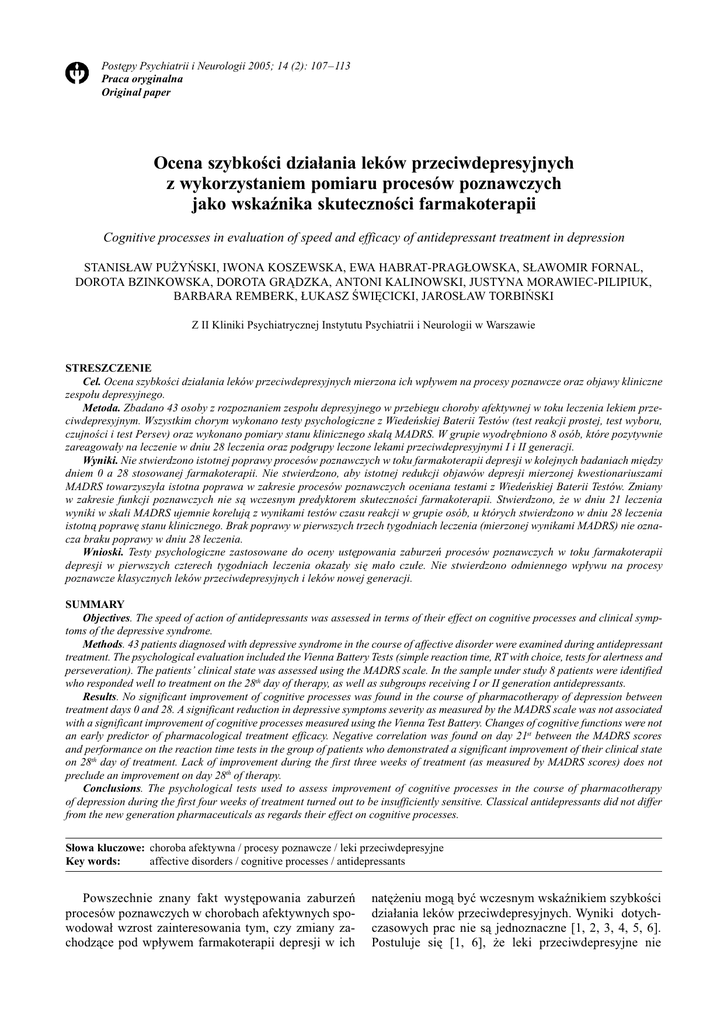 Postêpy Psychiatrii i Neurologii 2005; 14 (2): 107113 Praca oryginalna Original paper Ocena szybkoci dzia³ania leków przeciwdepresyjnych z wykorzystaniem pomiaru procesów poznawczych jako wskanika skutecznoci farmakoterapii Cognitive processes in evaluation of speed and efficacy of antidepressant treatment in depression STANIS£AW PU¯YÑSKI, IWONA KOSZEWSKA, EWA HABRAT-PRAG£OWSKA, S£AWOMIR FORNAL, DOROTA BZINKOWSKA, DOROTA GR¥DZKA, ANTONI KALINOWSKI, JUSTYNA MORAWIEC-PILIPIUK, BARBARA REMBERK, £UKASZ WIÊCICKI, JAROS£AW TORBIÑSKI Z II Kliniki Psychiatrycznej Instytutu Psychiatrii i Neurologii w Warszawie STRESZCZENIE Cel. Ocena szybkoci dzia³ania leków przeciwdepresyjnych mierzona ich wp³ywem na procesy poznawcze oraz objawy kliniczne zespo³u depresyjnego. Metoda. Zbadano 43 osoby z rozpoznaniem zespo³u depresyjnego w przebiegu choroby afektywnej w toku leczenia lekiem przeciwdepresyjnym. Wszystkim chorym wykonano testy psychologiczne z Wiedeñskiej Baterii Testów (test reakcji prostej, test wyboru, czujnoci i test Persev) oraz wykonano pomiary stanu klinicznego skal¹ MADRS. W grupie wyodrêbniono 8 osób, które pozytywnie zareagowa³y na leczenie w dniu 28 leczenia oraz podgrupy leczone lekami przeciwdepresyjnymi I i II generacji. Wyniki. Nie stwierdzono istotnej poprawy procesów poznawczych w toku farmakoterapii depresji w kolejnych badaniach miêdzy dniem 0 a 28 stosowanej farmakoterapii. Nie stwierdzono, aby istotnej redukcji objawów depresji mierzonej kwestionariuszami MADRS towarzyszy³a istotna poprawa w zakresie procesów poznawczych oceniana testami z Wiedeñskiej Baterii Testów. Zmiany w zakresie funkcji poznawczych nie s¹ wczesnym predyktorem skutecznoci farmakoterapii. Stwierdzono, ¿e w dniu 21 leczenia wyniki w skali MADRS ujemnie koreluj¹ z wynikami testów czasu reakcji w grupie osób, u których stwierdzono w dniu 28 leczenia istotn¹ poprawê stanu klinicznego. Brak poprawy w pierwszych trzech tygodniach leczenia (mierzonej wynikami MADRS) nie oznacza braku poprawy w dniu 28 leczenia. Wnioski. Testy psychologiczne zastosowane do oceny ustêpowania zaburzeñ procesów poznawczych w toku farmakoterapii depresji w pierwszych czterech tygodniach leczenia okaza³y siê ma³o czu³e. Nie stwierdzono odmiennego wp³ywu na procesy poznawcze klasycznych leków przeciwdepresyjnych i leków nowej generacji. SUMMARY Objectives. The speed of action of antidepressants was assessed in terms of their effect on cognitive processes and clinical symptoms of the depressive syndrome. Methods. 43 patients diagnosed with depressive syndrome in the course of affective disorder were examined during antidepressant treatment. The psychological evaluation included the Vienna Battery Tests (simple reaction time, RT with choice, tests for alertness and perseveration). The patients clinical state was assessed using the MADRS scale. In the sample under study 8 patients were identified who responded well to treatment on the 28th day of therapy, as well as subgroups receiving I or II generation antidepressants. Results. No significant improvement of cognitive processes was found in the course of pharmacotherapy of depression between treatment days 0 and 28. A significant reduction in depressive symptoms severity as measured by the MADRS scale was not associated with a significant improvement of cognitive processes measured using the Vienna Test Battery. Changes of cognitive functions were not an early predictor of pharmacological treatment efficacy. Negative correlation was found on day 21st between the MADRS scores and performance on the reaction time tests in the group of patients who demonstrated a significant improvement of their clinical state on 28th day of treatment. Lack of improvement during the first three weeks of treatment (as measured by MADRS scores) does not preclude an improvement on day 28th of therapy. Conclusions. The psychological tests used to assess improvement of cognitive processes in the course of pharmacotherapy of depression during the first four weeks of treatment turned out to be insufficiently sensitive. Classical antidepressants did not differ from the new generation pharmaceuticals as regards their effect on cognitive processes. S³owa kluczowe: choroba afektywna / procesy poznawcze / leki przeciwdepresyjne Key words: affective disorders / cognitive processes / antidepressants Powszechnie znany fakt wystêpowania zaburzeñ procesów poznawczych w chorobach afektywnych spowodowa³ wzrost zainteresowania tym, czy zmiany zachodz¹ce pod wp³ywem farmakoterapii depresji w ich natê¿eniu mog¹ byæ wczesnym wskanikiem szybkoci dzia³ania leków przeciwdepresyjnych. Wyniki dotychczasowych prac nie s¹ jednoznaczne [1, 2, 3, 4, 5, 6]. Postuluje siê [1, 6], ¿e leki przeciwdepresyjne nie 108 wywieraj¹ bezporedniego, korzystnego wp³ywu na procesy poznawcze, a nawet mog¹ je pogarszaæ. Prawdopodobnie obserwowana poprawa jest spowodowana g³ównie zmniejszaniem takich objawów depresji, jak np. spowolnienie psychoruchowe, zwiêkszenie motywacji do rozwi¹zywania zadañ testowych, jak równie¿ wp³ywu mechanizmów cholinergicznych tych leków. Najnowszy przegl¹d badañ dotycz¹cych procesów poznawczych w chorobach afektywnych przedstawili Borkowska i Rybakowski [7]. Badania neuropsychologiczne wykonane u osób z depresj¹ sugeruj¹ pozytywny wp³yw na procesy poznawcze niektórych leków nowej generacji [1, 6]. Badanie dynamiki procesów poznawczych i ich zmian pod wp³ywem leczenia wi¹¿e siê z wieloma ograniczeniami metodologicznymi [8]. Spowodowane to jest m. in. wtórnym wp³ywem objawów depresji, np. obni¿onej samooceny czy obni¿onej umiejêtnoci korzystania z informacji umo¿liwiaj¹cych weryfikowanie hipotez testowych, co rzutuje na poziom wykonania zadañ. Nadal trudno jest oddzieliæ objawy, które pierwotnie zaburzaj¹ funkcjonowanie poznawcze od wtórnego zaburzaj¹cego wp³ywu nastroju depresyjnego i jego psychologicznych konsekwencji 