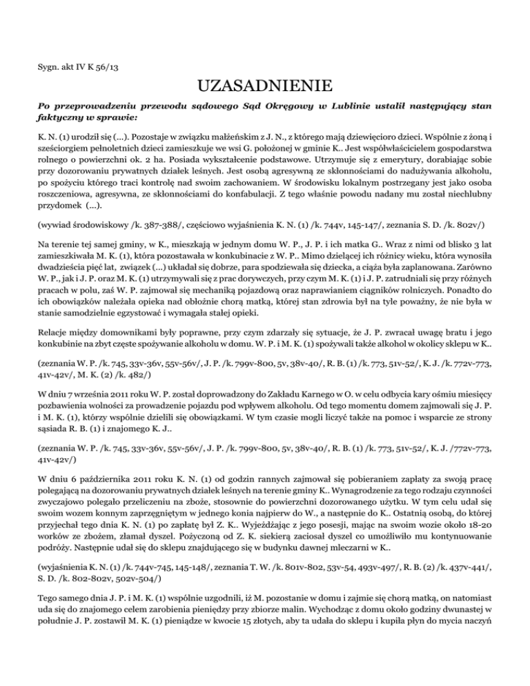 Sygn. akt IV K 56/13 UZASADNIENIE Po przeprowadzeniu przewodu sądowego Sąd Okręgowy w Lublinie ustalił następujący stan faktyczny w sprawie: K. N. (1) urodził się (...). Pozostaje w związku małżeńskim z J. N., z którego mają dziewięcioro dzieci. Wspólnie z żoną i sześciorgiem pełnoletnich dzieci zamieszkuje we wsi G. położonej w gminie K.. Jest współwłaścicielem gospodarstwa rolnego o powierzchni ok. 2 ha. Posiada wykształcenie podstawowe. Utrzymuje się z emerytury, dorabiając sobie przy dozorowaniu prywatnych działek leśnych. Jest osobą agresywną ze skłonnościami do nadużywania alkoholu, po spożyciu którego traci kontrolę nad swoim zachowaniem. W środowisku lokalnym postrzegany jest jako osoba roszczeniowa, agresywna, ze skłonnościami do konfabulacji. Z tego właśnie powodu nadany mu został niechlubny przydomek (...). (wywiad środowiskowy /k. 387-388/, częściowo wyjaśnienia K. N. (1) /k. 744v, 145-147/, zeznania S. D. /k. 802v/) Na terenie tej samej gminy, w K., mieszkają w jednym domu W. P., J. P. i ich matka G.. Wraz z nimi od blisko 3 lat zamieszkiwała M. K. (1), która pozostawała w konkubinacie z W. P.. Mimo dzielącej ich różnicy wieku, która wynosiła dwadzieścia pięć lat, związek (...) układał się dobrze, para spodziewała się dziecka, a ciąża była zaplanowana. Zarówno W. P., jak i J. P. oraz M. K. (1) utrzymywali się z prac dorywczych, przy czym M. K. (1) i J. P. zatrudniali się przy różnych pracach w polu, zaś W. P. zajmował się mechaniką pojazdową oraz naprawianiem ciągników rolniczych. Ponadto do ich obowiązków należała opieka nad obłożnie chorą matką, której stan zdrowia był na tyle poważny, że nie była w stanie samodzielnie egzystować i wymagała stałej opieki. Relacje między domownikami były poprawne, przy czym zdarzały się sytuacje, że J. P. zwracał uwagę bratu i jego konkubinie na zbyt częste spożywanie alkoholu w domu. W. P. i M. K. (1) spożywali także alkohol w okolicy sklepu w K.. (zeznania W. P. /k. 745, 33v-36v, 55v-56v/, J. P. /k. 799v-800, 5v, 38v-40/, R. B. (1) /k. 773, 51v-52/, K. J. /k. 772v-773, 41v-42v/, M. K. (2) /k. 482/) W dniu 7 września 2011 roku W. P. został doprowadzony do Zakładu Karnego w O. w celu odbycia kary ośmiu miesięcy pozbawienia wolności za prowadzenie pojazdu pod wpływem alkoholu. Od tego momentu domem zajmowali się J. P. i M. K. (1), którzy wspólnie dzielili się obowiązkami. W tym czasie mogli liczyć także na pomoc i wsparcie ze strony sąsiada R. B. (1) i znajomego K. J.. (zeznania W. P. /k. 745, 33v-36v, 55v-56v/, J. P. /k. 799v-800, 5v, 38v-40/, R. B. (1) /k. 773, 51v-52/, K. J. /772v-773, 41v-42v/) W dniu 6 października 2011 roku K. N. (1) od godzin rannych zajmował się pobieraniem zapłaty za swoją pracę polegającą na dozorowaniu prywatnych działek leśnych na terenie gminy K.. Wynagrodzenie za tego rodzaju czynności zwyczajowo polegało przeliczeniu na zboże, stosownie do powierzchni dozorowanego użytku. W tym celu udał się swoim wozem konnym zaprzęgniętym w jednego konia najpierw do W., a następnie do K.. Ostatnią osobą, do której przyjechał tego dnia K. N. (1) po zapłatę był Z. K.. Wyjeżdżając z jego posesji, mając na swoim wozie około 18-20 worków ze zbożem, złamał dyszel. Pożyczoną od Z. K. siekierą zaciosał dyszel co umożliwiło mu kontynuowanie podróży. Następnie udał się do sklepu znajdującego się w budynku dawnej mleczarni w K.. (wyjaśnienia K. N. (1) /k. 744v-745, 145-148/, zeznania T. W. /k. 801v-802, 53v-54, 493v-497/, R. B. (2) /k. 437v-441/, S. D. /k. 802-802v, 502v-504/) Tego samego dnia J. P. i M. K. (1) wspólnie uzgodnili, iż M. pozostanie w domu i zajmie się chorą matką, on natomiast uda się do znajomego celem zarobienia pieniędzy przy zbiorze malin. Wychodząc z domu około godziny dwunastej w południe J. P. zostawił M. K. (1) pieniądze w kwocie 15 złotych, aby ta udała do sklepu i kupiła płyn do mycia naczyń i maść na odciski. Chwilę później z domu wyszła także M. K. (1) i rowerem pojechała do sklepu znajdującego się w budynku dawnej mleczarni w K.. Sklep ten znajdował się w odległości około 2,5 km od ich domu, a podróż do niego i z powrotem zajmowała M. K. (1) zwykle około godziny. Po zrobieniu zakupów M. K. (1) wróciła do domu, podała G. P. tabletki, a następnie rozpakowała zakupy. Po pewnym czasie znowu wyszła z domu i ponownie rowerem udała się w okolice tego samego sklepu co poprzednio. Tam wspólnie z T. W. i R. B. (2) piła piwo. W niedalekiej odległości od nich stał także S. D.. Po kilku minutach pod sklep swoim wozem konnym podjechał K. N. (1), który wszedł do sklepu, gdzie zakupił kilka cukierków oraz piwo (...) o pojemności 0,5 l. Po wyjściu ze sklepu (...) zwrócił się do M. słowami „M. jedziesz?”. Po tych słowach M. K. (1) podeszła do niego i po krótkiej rozmowie K. N. (1) wziął należący do M. K. (1) rower i położył go na swoim wozie, na leżących tam workach ze zbożem, po czym obydwoje wsiedli na wóz i odjechali w kierunku drogi relacji P. – O.. (wyjaśnienia K. N. (1) /k. 744v-745, 145-148/, zeznania J. P. /k. 799v-800, 38v-40/, R. B. (1) /k. 773, 51v-52/, R. B. (3) /k.773-773v, 49v-50/, K. J. /772v-773, 41v-42v/, T. W. /k. 801v-802, 53v-54, 493v-497/, R. B. (2) /k. 437v-441/, S. D. /k. 802-802v, 502v-504/, P. S. /k. 772, 45v-46/) Jadąc ulicą (...) skręcili w ulicę (...), gdzie zatrzymali się pod sklepem (...). M. K. (1) pozostała na wozie, natomiast K. N. (1) udał się do sklepu, gdzie zakupił 0,5 l wódki (...) za 17 zł. W chwili dokonywania zakupu była godzina 18:23, a na dworze powoli robiło się ciemno. Czekając na K. N. (1) M. K. (1) zeszła z wozu, a wówczas koń się lekko spłoszył. Przechodzący w tym czasie A. A. doradził dziewczynie, aby ta nigdzie nie odchodziła, gdyż koń ucieknie. Chwilę później ze sklepu wyszedł K. N. (1) i wspó