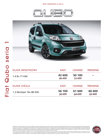 Fi a t Q u b o s e r i a 1 ROK PRODUKCJI 2016 SILNIK BENZYNOWY 1.4 8v 77 KM SILNIK DIESL A 1.3 Multijet 16v 80 KM EASY LOUNGE TREKKING 42 600 50 100 – 46 600 52 600 EASY LOUNGE TREKKING 56 100 61 600 66 600 58 600 64 600 69 600 Wszystkie samochody osobowe marki Fiat (z wyłączeniem Sedici) sprzedane od 1.01.2012 i zakupione w punktach sprzedaży dealerów Fiata w Polsce, posiadają 2-letnią gwarancję bez limitu kilometrów. W całym okresie ważności tej gwarancji Klient otrzymuje usługę ASSISTANCE 24h, ważną na terenie całej Europy. Podane informacje na temat gwarancji pojazdu nie stanowią udzielenia kupującemu gwarancji, w szczególności w rozumieniu art. 13 Ustawy z dnia 27 lipca 2002 r. o szczególnych warunkach sprzedaży konsumenckiej oraz o zmianie Kodeksu cywilnego. Gwarancja zostanie udzielona przy sprzedaży pojazdu, a jej warunki zostaną określone w dokumencie gwarancyjnym. Fiat zastrzega sobie prawo do wprowadzenia w dowolnym momencie zmian w modelach opisanych w niniejszym cenniku z powodów natury technicznej lub handlowej. Szczegóły w salonie sprzedaży. Cennik zawiera ceny detaliczne w złotych z VAT. Ceny zawierają podatek akcyzowy. Ceny mogą ulec zmianom bez uprzedniego zawiadomienia w przypadku zmian cen przez producenta, zmian podatkowych, przepisów celnych lub innych przyczyn. Wyposażenie seryjne i dodatkowe poszczególnych modeli może ulegać zmianom w zależności od potrzeb poszczególnych rynków i wymogów prawnych. Dane w niniejszym cenniku mają charakter orientacyjny i nie stanowią oferty w rozumieniu Kodeksu Cywilnego. PAKIETY WYDŁUŻONEJ GWARANCJI MAXIMUM CARE Paleta usług przygotowanych pod kątem Twojego samochodu, zapewnia, że wszystkie czynności serwisowe są wykonywane u Dealerów i w Autoryzowanych Stacjach Obsługi marki Fiat w Europie, przez wysoko kwalifikowanych i odpowiednio wyspecjalizowanych techników, z zastosowaniem oryginalnych części zamiennych. Maximum Care jest to najbardziej kompleksowy program Mopar® Vehicle Protection. Zapewnia całkowite zabezpieczenie Twojego samochodu przed usterkami komponentów mechanicznych i elektrycznych, umożliwiając wybór okresu trwania gwarancji w zależności od Twoich potrzeb i preferencji. Do wyboru jest kilka wariantów zależnych od okresu i granicznego przebiegu, które przewidują wydłużenie gwarancji posiadaneg o pojazdu o: • + 1 rok i do 45 000 lub do 90 000 km lub do 120 000 km (opcja – 3 lata gwarancji), • + 2 lata i do 60 000 lub do 120 000 km lub do 160 000 km (opcja – 4 lata gwarancji), • + 3 lata i do 75 000 lub do 150 000 km lub do 200 000 km (opcja – 5 lat gwarancji). Fi a t Q u b o s e r i a 1 LIMIT KILOMETRÓW WARIANT 45 000 90 000 120 000 do 3 lat 490 zł 890 zł 1 090 zł 490 zł 1 190 zł 1 490 zł silniki benzynowe do 3 lat silniki Diesla do 4 lat silnik benzynowy do 4 lat silnik Diesla 60 000 120 000 160 000 990 zł 1 990 zł 2 290 zł 1 090 zł 2 790 zł 3 390 zł do 5 lat silnik benzynowy do 5 lat silnik Diesla 75 000 150 000 200 000 1 590 zł 3 290 zł 3 490 zł 1 990 zł 4 590 zł 5 490 zł PAKIETY SERWISOWE Easy Care Pakiety Serwisowe zapewniają serwisowanie pojazdu na zasadzie usługi przedpłaconej. Użytkownik ma zagwarantowaną obsługę auta w uzgodnionym zakresie określonym umową, stosownie do wybranego wariantu uzależnionego od przebiegu pojazdu. Może być ona wykonana w dowolnym Autoryzowanym Serwisie FIAT w Polsce, a profesjonalna obsługa i wysoka jakość napraw, także pozapakietowych, gwarantują utrzymanie pojazdu w prawidłowym, wysokim stanie technicznym i spokojną jego eksploatację w długim okresie. Do wyboru jest kilka wariantów pakietu EASY CARE, zależnych od okresu i granicznego przebiegu eksploatacji pojazdu: • do 3 lat i do 45 000 lub do 90 000 km lub do 120 000 km, • do 4 lat i do 60 000 lub do 120 000 km lub do 160 000 km, • do 5 lat i do 75 000 lub do 150 000 km lub do 200 000 km. FINANSOWANIE KREDYT ROK BEZ RAT ROK/0 • WPŁATA WŁASNA - 50% • JEDNORAZOWA SPŁATA KREDYTU PO 12 MIESIĄCACH LEASING NOWY • NISKIE RATY LEASINGOWE • BRAK ZAŚWIADCZEŃ ZUS I US ORAZ DOKUMENTÓW REJESTROWYCH • SPŁATA W KOLEJNYCH 84 MIESIĘCZNYCH RATACH SPECJALNE OFERTY LEASINGOWE KREDYT Z RATAMI ROCZNYMI 3x33, 4x25, 5x20 • MINIMALNA WPŁATA WŁASNA - 20% • PIERWSZY CZYNSZ 0% • ATRAKCYJNY CAŁKOWITY KOSZT LEASINGU LUB 3x33 4x25 5x20 LEASING NOWY LEASING • NISKI CAŁKOWITY KOSZT LEASINGU • OKRES KREDYTU 24-48 MIESIĘCY • WARUNKI LEASINGU SZYTE NA MIARĘ • RATY PŁATNE CO 12 MIESIĘCY • ELASTYCZNA WYSOKOŚĆ WYKUPU SAMOCHODU - Z GWARANCJĄ WYKUPU PRZEZ WYBRANYCH DEALERÓW • BRAK ZAŚWIADCZEŃ ZUS I US ORAZ DOKUMENTÓW REJESTROWYCH MIÓD MALINA KREDYT MIÓD-MALINA UBEZPIECZENIA • NAJLEPSZY PRODUKT FINANSOWY ROKU 2015 (TYTUŁ NADANY PRZEZ CENTRALNE BIURO CERTYFIKACJI KRAJOWEJ SP. Z O.O.) • UBEZPIECZENIE SPŁATY KREDYTU / LEASINGU - PRZEZ CAŁY OKRES FINANSOWANIA • MINIMALNA WPŁATA WŁASNA OD 0% • UBEZPIECZENIE GAP AŻ DO 5 LAT • ELASTYCZNY OKRES KREDYTU 12-96 MIESIĘCY • UBEZPIECZENIE AWARII ELEKTROMECHANICZNEJ PRZEDŁUŻONA GWARANCJA • ATRAKCYJNE OPROCENTOWANIE • ATRAKCYJNY PAKIET UBEZPIECZEŃ KOMUNIKACYJNYCH W LEASINGU Fi a t Q u b o s e r i a 1 TAPICERKI EASY 094 Czarno-szara LOUNGE 162 Beżowo-czarna TREKKING 163 Szaro-czarna 213 Szaro-czarna KOLORY 168 Czerwony Passione (pastelowy) 249 Biały Gelato (pastelowy) 479 Niebieski Riviera (pastelowy) 551 Pomarańczowy Sicilia (pastelowy) 293 Czerwony Amore (metalizowany) 487 Niebieski Mediterraneo (metalizowany) 612 Szary Maestro (metalizowany) 632 Czarny Tenore (metalizowany) 333 Niebieski Liberta (metalizowany) 444 Brązowy Magneico (metalizowany) FELGI EASY / LOUNGE (STANDARD) EASY / LOUNGE (OPCJA) TREKKING (STANDARD) EASY / LOUNGE (OPCJA) Kołpaki ochronne kół 15" (opcja 878) Obręcze ze stopów lekkich 16" (opcja 421) Obręcze ze stopów lekkich 15" (opcja 420) Fi a t Q u b o s e r i a 1 DANE TECHNICZNE SILNIK BENZYNOW
