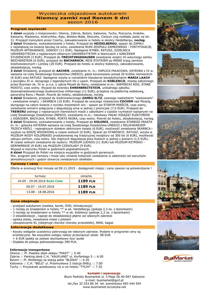 Wycieczka objazdowa autokarem Niemcy zamki nad Renem 6 dni sezon 2016 Program wycieczki 1 dzień wyjazdy z miejscowości: Gliwice, Zabrze, Bytom, Katowice, Tychy, Pszczyna, Kraków, Kalwaria, Wadowice, Andrychów, Kęty, Bielsko-Biała, Skoczów, Cieszyn (wg rozkładu jazdy na str. 3). Przejazd tranzytem przez Czechy, zakwaterowanie w hotelu w okolicy Heidelbergu, nocleg. 2 dzień Śniadanie, wykwaterowanie z hotelu. Przejazd do HEIDELBERGU, spacer do ZAMKU z największą na świecie beczką na wino, zwiedzanie RUIN ZESPOŁU ZAMKOWEGO - FORTYFIKACJE, MUZEUM APTEKARSKIE, OGRODY (11 EUR). Następnie RYNEK, RATUSZ, DZIELNICA UNIWERSYTECKA z najstarszym elitarnym UNIWERSYTETEM w Niemczech z KARCEREM STUDENCKIM (3 EUR). Przejazd do TRECHTINGSHAUSEN zwiedzanie wnętrz XI-wiecznego zamku REICHENSTEIN (6 EUR), przejazd do BACHARACH, REJS STATKIEM po RENIE trasą zamków średniowiecznych i Lorelay (20 EUR). Przejazd do hotelu w okolicy Koblencji, zakwaterowanie, obiadokolacja, nocleg. 3 dzień Śniadanie, przejazd do AACHEN, zwiedzanie m. in.: KAPLICA PAŁACOWA, KATEDRA z IX w. wpisana na Listę Światowego Dziedzictwa UNESCO, gdzie koronowano ponad 30 królów niemieckich (6 EUR) oraz RATUSZ. Następnie wizyta w romańskim klasztorze benedyktyńskim MARIA LAACH z początku XI w. słynącego z legendarnych lilii z Laach. Przejazd do KOBLENCJI, miasta założonego przez Rzymian ok. IX w. p.n.e. u ujścia Mozeli do Renu, zwiedzanie m.in.: NIEMIECKI RÓG, STARE MIASTO, czas wolny. Wyjazd do twierdzy EHRENBREITSTEIN, unikalnego zabytku dziewiętnastowiecznego budownictwa militarnego (11 EUR), przejście na platformę widokową, panorama Renu i Mozeli. Powrót do hotelu, obiadokolacja, nocleg. 4 dzień Śniadanie, przejazd do średniowiecznego ZAMKU ELTZ, zwanego nadreńskim "wieżowcem" - zwiedzanie wnętrz i SKARBCA (10 EUR). Przejazd do uroczego miasteczka COCHEM nad Mozelą, słynącego na całym świecie z wyrobu mozelskich win - spacer po STARYM MIEŚCIE, czas wolny, zwiedzanie winiarni połączone z degustacją wina w jednej z piwniczek (7,5 EUR). Przejazd do TREWIRU jednego z najstarszych niemieckich miast z zabytkami z czasów rzymskich wpisanymi na Listę Światowego Dziedzictwa UNESCO, zwiedzanie m.in.: rokokowy PAŁAC KSIĄŻĄT ELEKTORÓW z OGRODEM, BAZYLIKA, RYNEK, PORTA NIGRA, czas wolny. Powrót do hotelu, obiadokolacja, nocleg. 5 dzień Śniadanie, wykwaterowanie z hotelu. Przejazd do KOLONII, zwiedzanie STAREGO MIASTA m. in.: gotycka KATEDRA wpisana na Listę Światowego Dziedzictwa UNESCO z RELIKWIARZEM TRZECH KRÓLI - największym dziełem złotniczym świata (6 EUR), możliwość zwiedzania SKARBCA i wyjście na WIEŻĘ WIDOKOWĄ w czasie wolnym (6 EUR). Spacer po STARÓWCE: RATUSZ, wizyta w MUZEUM WODY KOLOŃSKIEJ produkowanej wg tradycyjnej receptury od 300 lat (6 EUR), możliwość zakupu perfum, czas wolny. Dla chętnych degustacja piwa Koelsch w jednej z piwiarni (1,5 EUR). W czasie wolnym zwiedzanie do wyboru: MUZEUM LUDWIG (11 EUR) lub MUZEUM RZYMSKO GERMAŃSKIE (9 EUR) lub MUZEUM CZEKOLADY (9 EUR). Wyjazd w kierunku Polski w godzinach popołudniowych. 6 dzień Przyjazd do Polski na miejsca wyjazdów w godzinach porannych. Ww. program jest ramowy i może ulec zmianie kolejność zwiedzania w zależności od warunków atmosferycznych i godzin otwarcia zwiedzanych obiektów. Turnusy i ceny Oferta w promocji first minute od 09.11.2015 - dostępność miejsc i cena zawsze na potwierdzenie ! turnusy cena/os. 24.05 - 29.05.2016 Boże Ciało 1189 PLN 05.07 - 10.07.2016 1189 PLN 13.08 - 18.08.2016 1189 PLN a Cena obejmuje - przejazd autokarem (toaleta, barek, DVD, klimatyzacja) 1 nocleg ze śniadaniem w hotelu ** w ok. Heidelbergu (pokoje 2,3 os. z łazienkami) 3 noclegi ze śniadaniami w hotelu ** w ok. Koblencji (pokoje 2,3 os. z łazienkami) 3 obiadokolacje , napoje do obiadokolacji płatne we własnym zakresie opieka pilota, zwiedzanie miast z pilotem ubezpieczenie KL (obejmuje również choroby przewlekłe), NNW, bagaż Informacje dodatkowe - Koszty wstępów uczestnicy pokrywają we własnym zakresie. Podane w programie ceny są orientacyjne. Na wszystkie wstępy należy przeznaczyć około 98 EUR + 6 EUR opłata za zestaw słuchawkowy tour quide - Dopłata do pokoju jednoosobowego 399 PLN. Informacje transportowe Gliwice :: Pl. Piastów obok sklepu "PIAST" :: 5.40 Zabrze :: Parking obok C.H. "KAUFLAND" ul. Korfantego 5 :: 6.00 Bytom :: Pl. Wolskiego za stacją paliw "BLISKA" :: 6.20 Katowice :: C.H. "BELG" ul. Przemysłowa 3 /stacja SHELL :: 7.00 Tychy :: Przystanek autobusowy vis a vis hotelu "TYCHY" :: 7.35 kontakt i rezerwacja: Biuro Podróży Busmarket ul. 3 Maja 36 40-097 Katowice e-mail: [email protected] tel./fax 32 253 86 34 tel. komórkowy 693 444 554 www.busmarket.turystyka.net Pszczyna :: Przystanek obok sklepu "ALDI" ul. Broniewskiego 1 :: 7.55 Czechowice-Dziedzice :: Mc Donald's ul. Węglowa 15, przy DK 1 :: 8.05 Kraków :: ul. Kałuży za hotelem "CRACOVIA" :: 6.00 Kalwaria :: Dw. PKS :: 6.45 Wadowice :: Dw. PKP :: 7.00 Andrychów :: Zatoczka przy WSW Andoria :: 7.20 Kęty :: Dw. PKS :: 7.40 BIELSKO-BIAŁA :: DW. PKS (dolny plac) :: 8.30 Skoczów :: Stare targowisko przy Dw. PKS :: 8.50 Żory :: Dworzec autob. ul. Męczenników Oświęcimskich :: 7.00 Rybnik :: Stacja BP obok Mc Donald's ul. Budowlanych 4 :: 7.25 Wodzisław Śląski :: Stacja STATOIL przy Mc Donald's ul. Jastrzębska 2 :: 7.50 Jastrzębie-Zdrój :: Dworzec Arki Bożka ul. Podhalańska :: 8.25 Cieszyn-Boguszowice :: Przejście graniczne :: 9.15 Informujemy, że na trasie Gliwice-Bielsko oraz Kraków-Bielsko przejazd może być realizowany innymi środkami transportu. W Bielsku-Białej istnieje możliwość przesiadki. kontakt i rezerwacja: Biuro Podróży Busmarket ul. 3 Maja 36 40-097 Katowice e-mail: [email protected] tel./fax 32 253 86 34 tel. komórkowy 693 444 554 www.busmarket.turystyka.net