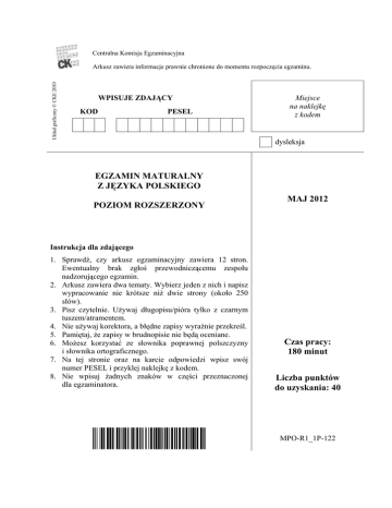 Centralna Komisja Egzaminacyjna Układ graficzny © CKE 2010 Arkusz zawiera informacje prawnie chronione do momentu rozpoczęcia egzaminu. WPISUJE ZDAJĄCY KOD PESEL Miejsce na naklejkę z kodem dysleksja EGZAMIN MATURALNY Z JĘZYKA POLSKIEGO POZIOM ROZSZERZONY MAJ 2012 Instrukcja dla zdającego 1. Sprawdź, czy arkusz egzaminacyjny zawiera 12 stron. Ewentualny brak zgłoś przewodniczącemu zespołu nadzorującego egzamin. 2. Arkusz zawiera dwa tematy. Wybierz jeden z nich i napisz wypracowanie nie krótsze niż dwie strony (około 250 słów). 3. Pisz czytelnie. Używaj długopisu/pióra tylko z czarnym tuszem/atramentem. 4. Nie używaj korektora, a błędne zapisy wyraźnie przekreśl. 5. Pamiętaj, że zapisy w brudnopisie nie będą oceniane. 6. Możesz korzystać ze słownika poprawnej polszczyzny i słownika ortograficznego. 7. Na tej stronie oraz na karcie odpowiedzi wpisz swój numer PESEL i przyklej naklejkę z kodem. 8. Nie wpisuj żadnych znaków w części przeznaczonej dla egzaminatora. Czas pracy: 180 minut Liczba punktów do uzyskania: 40 MPO-R1_1P-122 2 Egzamin maturalny z języka polskiego Poziom rozszerzony Temat 1. Dokonaj analizy i interpretacji porównawczej wierszy Jana Kochanowskiego O żywocie ludzkim i Agnieszki Osieckiej Kolęda z pretensjami. Zwróć uwagę na przedstawione w nich obrazy ludzkiego życia oraz postawę podmiotu mówiącego wobec świata. O ŻYWOCIE LUDZKIM Wieczna Myśli, któraś jest dalej niż od wieka, Jesli Cię też to rusza1, co czasem człowieka, Wierzę, że tam na niebie masz mięsopust prawy2, Patrząc na rozmaite świata tego sprawy. Bo leda co wyrzucisz, to my, jako dzieci, W taki treter3, że z sobą wyniesiem i śmieci. Więc temu rękaw urwą, a ten czapkę straci; Drugi tej krotochwile i włosy przypłaci4. Na koniec niefortuna5 albo śmierć przypadnie, To drugi, choćby nierad, czacz6 porzuci snadnie. Panie, godnoli7, niech tę rozkosz z Tobą czuję, Niech drudzy za łby chodzą8, a ja się dziwuję. Jan Kochanowski, Fraszki, Wrocław 1998 KOLĘDA Z PRETENSJAMI Wielki Boże białych koźląt, czarnych owiec i Ameryk, oddal od nas chmurę groźną i pożaru żar. Biednym dzieciom Twojej ery, słabym dzieciom Twojej ery podaj białą dłoń. Ta dziewczyna, co tak płacze, że sukienka nazbyt droga, ten wodzirej, co wciąż skacze, choć się skończył bal – to zabawki Pana Boga, to zabawki Pana Boga, których trochę żal. Ta kobieta, która nie śpi, bo ją dręczy ciemna trwoga, 1 rusza – tu: wzrusza, porusza. mięsopust prawy – prawdziwy karnawał, tu: widowisko karnawałowe. 3 treter – zamieszanie, rozgardiasz, tu: wydzieranie sobie rzuconych łakoci, darów. 4 tej krotochwile i włosy przypłaci – tę zabawę przypłaci utratą włosów. 5 niefortuna – nieszczęście. 6 czacz – cacko, błyskotka, datek. 7 godnoli – jeśli się godzi, jeśli pozwolisz. 8 za łby chodzą – wodzą się za łby, biją się. 2 Egzamin maturalny z języka polskiego Poziom rozszerzony 3 ten mężczyzna udręczony, co hartował stal9 – to zabawki Pana Boga, to zabawki Pana Boga, których trochę żal. Tą kolędą z pretensjami chcę Ci dzisiaj dopiec, bo też Ty się bawisz nami jak niegrzeczny chłopiec. Ten podróżny, co spostrzega, że się nagle gmatwa droga, ta tancerka, którą dusi muślinowy szal10, ten, kto czuje, że już jutro stanie przed nim dama sroga, ten, kto wierzy, że go czeka niebostrunna dal – to zabawki Pana Boga, to zabawki Pana Boga, których trochę żal. Tą kolędą z pretensjami chcę Ci dzisiaj dopiec, bo też Ty się bawisz z nami jak niegrzeczny chłopiec. Agnieszka Osiecka, Najpiękniejsze wiersze i piosenki, Warszawa 2010 9 Jak hartowała się stal – jedna z najbardziej znanych powieści realizmu socjalistycznego autorstwa radzieckiego pisarza Mikołaja Ostrowskiego. 10 tancerka, którą dusi muślinowy szal – słynna amerykańska tancerka Isadora Duncan (1877-1922) zginęła w czasie jazdy otwartym samochodem, gdy jej szal wkręcił się w nieosłonięte koła. 4 Egzamin maturalny z języka polskiego Poziom rozszerzony Temat 2. Codzienność w czasach Zagłady. Analizując i interpretując opowiadanie Idy Fink11 Przed lustrem, zwróć uwagę na kreację bohaterek, ich sytuację oraz znaczenie tytułowego lustra. PRZED LUSTREM W grudniowe, ponure popołudnie Adela postanowiła przerobić swoją sukienkę, włożyła więc buciki ojca i pobiegła do koleżanki, Nisi-krawcowej. Nisia od roku mieszkała w pobliżu Adeli, od roku wszyscy byli bliskimi sąsiadami. Zdyszana wpadła do małego pokoju na parterze. Nisia siedziała przy oknie wychodzącym na puste, kamienne podwórze, na jej kolanach leżała czysta ściereczka, na ściereczce stała patelnia. Nisia-krawcowa jadła swój obiad, odgrzane kartofle. O parapet okna opierała się wielka, ciężka łopata, ręce Nisi były grube, spękane na wierzchu dłoni, a maszyny do szycia w ogóle nie było. Nisia sprzedała ją, nie szyła już od dawna, tylko pracowała łopatą przy budowie wielkiego mostu na niewielkiej rzece, podobnie zresztą jak Adela, która także miała w domu łopatę i pracowała łopatą przy załadunku węgla na kolejowej stacji. Adela zamknęła za sobą drzwi, zatupała stopami o podłogę, otrzepując śnieg z bucików, i przysiadła na zydelku, będącym niegdyś własnością ojca Nisi, szewca. Nisia nie przerwała obiadu, powolnym, miarowym ruchem zgarniała z patelni kartofle i żuła je z trudem. W pokoju stały cztery łóżka, trzy z nich nieużyteczne, najpierw, latem, zwolniło się jedno, potem, wczesną jesienią, drugie, a później trzecie. Czwarte służyło Nisi, która, nie przerywając obiadu, słuchała szybkiego mówienia siedzącej na ojcowskim zydlu Adeli. Skończywszy zajadać kartofle, wstała. Była drobna i wciąż jeszcze ładna, mimo że po kolei zwolniły się trzy łóżka i tylko patrzeć było, jak zwolni się czwarte, spłukała patelnię zimną wodą i powiesiła na haku nad wy