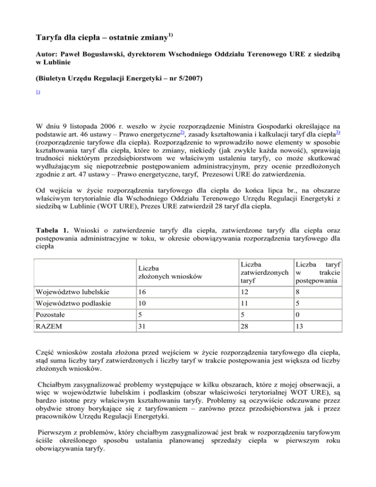 Taryfa dla ciepła – ostatnie zmiany1) Autor: Paweł Bogusławski, dyrektorem Wschodniego Oddziału Terenowego URE z siedzibą w Lublinie (Biuletyn Urzędu Regulacji Energetyki – nr 5/2007) 1) W dniu 9 listopada 2006 r. weszło w Ŝycie rozporządzenie Ministra Gospodarki określające na podstawie art. 46 ustawy – Prawo energetyczne2), zasady kształtowania i kalkulacji taryf dla ciepła3) (rozporządzenie taryfowe dla ciepła). Rozporządzenie to wprowadziło nowe elementy w sposobie kształtowania taryf dla ciepła, które to zmiany, niekiedy (jak zwykle kaŜda nowość), sprawiają trudności niektórym przedsiębiorstwom we właściwym ustaleniu taryfy, co moŜe skutkować wydłuŜającym się niepotrzebnie postępowaniem administracyjnym, przy ocenie przedłoŜonych zgodnie z art. 47 ustawy – Prawo energetyczne, taryf, Prezesowi URE do zatwierdzenia. Od wejścia w Ŝycie rozporządzenia taryfowego dla ciepła do końca lipca br., na obszarze właściwym terytorialnie dla Wschodniego Oddziału Terenowego Urzędu Regulacji Energetyki z siedzibą w Lublinie (WOT URE), Prezes URE zatwierdził 28 taryf dla ciepła. Tabela 1. Wnioski o zatwierdzenie taryfy dla ciepła, zatwierdzone taryfy dla ciepła oraz postępowania administracyjne w toku, w okresie obowiązywania rozporządzenia taryfowego dla ciepła Liczba złoŜonych wniosków Liczba Liczba taryf zatwierdzonych w trakcie taryf postępowania Województwo lubelskie 16 12 8 Województwo podlaskie 10 11 5 Pozostałe 5 5 0 RAZEM 31 28 13 Część wniosków została złoŜona przed wejściem w Ŝycie rozporządzenia taryfowego dla ciepła, stąd suma liczby taryf zatwierdzonych i liczby taryf w trakcie postępowania jest większa od liczby złoŜonych wniosków. Chciałbym zasygnalizować problemy występujące w kilku obszarach, które z mojej obserwacji, a więc w województwie lubelskim i podlaskim (obszar właściwości terytorialnej WOT URE), są bardzo istotne przy właściwym kształtowaniu taryfy. Problemy są oczywiście odczuwane przez obydwie strony borykające się z taryfowaniem – zarówno przez przedsiębiorstwa jak i przez pracowników Urzędu Regulacji Energetyki. Pierwszym z problemów, który chciałbym zasygnalizować jest brak w rozporządzeniu taryfowym ściśle określonego sposobu ustalania planowanej sprzedaŜy ciepła w pierwszym roku obowiązywania taryfy. Zmiana regulacji określonej aktualnie w treści § 12 ust. 3 pkt 2 rozporządzenia taryfowego dla ciepła wprowadziła swobodę przy planowaniu sprzedaŜy ciepła. Dotychczasowy sposób narzucający wyznaczenie wskaźnika Wn, wykorzystania zamówionej mocy cieplnej, ustalonego jako średnia z okresu ostatnich pięciu lat ilość sprzedanego ciepła przypadająca na 1 MW zamówionej mocy cieplnej lub z faktycznego okresu prowadzenia działalności przez przedsiębiorstwo energetyczne, gdy okres ten jest krótszy niŜ pięć lat [w GJ/MW], który w iloczynie z zamówioną mocą cieplną wyznaczał planowaną sprzedaŜ ciepła, został pominięty. Poprzednie rozporządzenie taryfowe dla ciepła4) dawało moŜliwość wyznaczenia planowanej sprzedaŜy przy zminimalizowanym wpływie warunków pogodowych w okresie sezonu grzewczego. Cieszę się, gdy ten sposób planowania sprzedaŜy ciepła jest proponowany nadal przez przedsiębiorstwa. To powinno skutkować pewną stabilnością przychodów w przedsiębiorstwie, niezaleŜnie od średnich temperatur w sezonie grzewczym i długości zimy. Są jednak przedsiębiorstwa, które próbują tę dowolność wykorzystać w celu zwiększenia przychodów w pierwszym roku obowiązywania taryfy i podają wielkość z ostatniego roku kalendarzowego, wiedząc, Ŝe sprzedaŜ była duŜo niŜsza od przeciętnej, co daje im większą cenę i stawkę. MoŜe się to jednak „zemścić” przy zatwierdzaniu kolejnej taryfy, kiedy poprzedzającym rok stosowania taryfy pojawi się rok kalendarzowy ze zwiększoną sprzedaŜą. W rozporządzeniu taryfowym nie ma mowy o zachowaniu tej samej metody planowania sprzedaŜy przy kształtowaniu kolejnej taryfy, ale nie moŜna za kaŜdym razem dopasowywać metody do potrzeb chwili. Myślę, Ŝe w tym wypadku spojrzenie w przyszłość i stosowanie tej samej metody przez lata, zwłaszcza jeŜeli opiera się ona o przekrój sprzedaŜy ciepła z kilku ostatnich lat działalności przedsiębiorstwa, będzie korzystna zarówno dla przedsiębiorstw, jak i dla odbiorców. Poza tym naleŜałoby rozwaŜyć długofalowe skutki wyjścia do odbiorców z niską ceną. Pomimo, iŜ mechanizm zatwierdzanych taryf nie pozwala na ciągłe dostosowywanie oferty cenowej do zgłaszanego popytu na ciepło oraz pamiętając o kapitałochłonności inwestycji ciepłowniczych, które w naturalny sposób wyznaczają bariery tak wejścia jak i wyjścia z rynku ciepła po stronie podaŜowej, naleŜałoby spróbować ceną przyciągnąć naszych potencjalnych, przyszłych odbiorców, a obecnych – zatrzymać. Bo ucieczka dotychczasowych, nawet niewielu odbiorców, będzie miała czarny scenariusz dla przedsiębiorstw w dalszej perspektywie. Koszty stałe przedsiębiorstwa pozostaną na poziomie zbliŜonym do ustalonego, a wielkość zamówionej mocy zmniejszy się. SprzedaŜ wyraŜona w GJ teŜ spadnie. Naturalnym w takiej sytuacji będzie wzrost cen i stawek opłat. Nastąpi eskalacja ucieczek od scentralizowanego ciepła. Tam, gdzie to moŜliwe, i nie tylko w wolnostojących domach jednorodzinnych, czy szeregowcach, ale w całych spółdzielniach mieszkaniowych nastąpi zmiana sposobu ogrzewania na alternatywne kotłownie osiedlowe. Paliwo gazowe czy olej opałowy to substytuty ciepła scentralizowanego. Powinny być stosowane tylko tam, gdzie brak jest ciepła sieciowego. Takiego wyboru dokonuje się po starannej analizie ekonomicznej (biorącej pod uwagę wszystkie koszty związane z inwestycją i eksploatacją w długim horyzoncie czasowym), która powinna wykazać, iŜ koszt 1 GJ ciepła wytworzonego w du