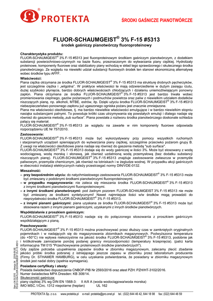 ŚRODKI GAŚNICZE PIANOTWÓRCZE FLUOR-SCHAUMGEIST® 3% F-15 #5313 środek gaśniczy pianotwórczy fluoroproteinowy Charakterystyka produktu: FLUOR-SCHAUMGEIST® 3% F-15 #5313 jest fluoroproteinowym środkiem gaśniczym pianotwórczym, z dodatkiem substancji powierzchniowo-czynnych na bazie fluoru, przeznaczonym do wytwarzania piany ciężkiej. Hydrolizaty proteinowe, komponenty fluorowe oraz stabilizatory piany wchodzą w skład tego sprawdzonego i skutecznego środka pianotwórczego. Ze względu na niewielki udział substancji fluorowych środek ten stanowi ekonomiczną alternatywę wobec środków typu AFFF. Właściwości: Piana ciężka otrzymana ze środka FLUOR-SCHAUMGEIST® 3% F-15 #5313 ma strukturę drobnych pęcherzyków, jest szczególnie ciężka i „wilgotna”. W praktyce właściwości te mają odzwierciedlenie w dużym zasięgu rzutu, dużej szybkości płynięcia, bardzo dobrych właściwościach chłodzących i działaniu uniemożliwiającym ponowny zapłon. Piana otrzymana ze środka FLUOR-SCHAUMGEIST® 3% F-15 #5313 jest bardzo trwała wobec promieniowania cieplnego, gazów pożarowych i podmuchów powietrza oraz paliw z niewielkim udziałem dodatków niszczących pianę, np. alkoholi, MTBE, estrów, itp. Dzięki użyciu środka FLUOR-SCHAUMGEIST® 3% F-15 #5313 niebezpieczeństwo ponownego zapłonu już ugaszonego ogniska pożaru jest znacznie zmniejszone. Piana ma właściwości oleofobowe, tj. ma bardzo niewielkie właściwości emulgujące i w bardzo niewielkim stopniu nasiąka substancjami palnymi. To powoduje krótki czas utrzymywania się powstałych emulsji i dlatego nadaje się również do gaszenia metodą „sub surface”. Piana powstała z roztworu środka pianotwórczego doskonale schładza palący się materiał. FLUOR-SCHAUMGEIST® 3% F-15 #5313 ze względu na zawarte w nim komponenty fluorowe odpowiada rozporządzeniu UE Nr 757/2010. Zastosowanie: FLUOR-SCHAUMGEIST® 3% F-15 #5313 może być wykorzystywany przy pomocy wszystkich ruchomych i stacjonarnych urządzeń spieniających do wytwarzania piany ciężkiej, szczególnie przeciwko pożarom grupy B. Z uwagi na właściwości oleofobowe piana nadaje się również do gaszenia metodą "sub surface". FLUOR-SCHAUMGEIST® 3% F-15 #5313 dodaje się do wody gaśniczej w ilości 3%. Może być stosowany z wodą wodociągową, wodą morską i słonawą, jak również uzdatnioną wodą przemysłową (bez dodatku substancji niszczących pianę). FLUOR-SCHAUMGEIST® 3% F-15 #5313 znajduje zastosowanie zwłaszcza w przemyśle paliwowym, przemyśle chemicznym, jak również na lotniskach i w żegludze wodnej. W przypadku akcji gaśniczych w obecności instalacji elektrycznych należy przestrzegać normy DIN/VDE-0132. Mieszalność: – przy bezpośrednim użyciu: do natychmiastowego zastosowania FLUOR-SCHAUMGEIST® 3% F-15 #5313 może być zmieszany z podobnymi środkami pianotwórczymi fluoroproteinowymi. – w przypadku magazynowania: nie zaleca się mieszania środka FLUOR-SCHAUMGEIST® 3% F-15 #5313 z innymi środkami pianotwórczymi fluoroproteinowymi. – z innymi środkami pianotwórczymi: pod żadnym pozorem FLUOR-SCHAUMGEIST 3% F-15 #5313 nie może być zmieszany ze środkami syntetycznymi! Nawet najmniejsze ilości w/w środków mogą prowadzić do nieprzydatności środka FLUOR-SCHAUMGEIST® 3% F-15 #5313. – z innymi pianami gaśniczymi: piana uzyskana ze środka FLUOR-SCHAUMGEIST® 3% F-15 #5313 może być stosowana razem z innymi pianami gaśniczymi, uzyskanymi z innych środków pianotwórczych. Stan z 04.03.2015 Wersja: 04 [2016-09-26] PD-5313-V04-FLUOR-SCHAUMGEIST 3% F-15 #5313 Współdziałanie z proszkiem gaśniczym: FLUOR-SCHAUMGEIST® 3% F-15 #5313 nadaje się do połączonego stosowania z proszkiem gaśniczym współdziałającym z pianą. Przechowywanie: FLUOR-SCHAUMGEIST® 3% F-15 #5313 można przechowywać przez dłuższy czas w zamkniętych oryginalnych pojemnikach i w nadających się do magazynowania zbiornikach magazynowych. Podwyższona temperatura (do +50°C) nie wpływa niekorzystnie na jakość środka FLUOR-SCHAUMGEIST® 3% F-15 #5313, podobnie jak i krótkotrwałe zamrażanie poniżej podanej granicy mrozoodporności (temperatury krzepnięcia). (patrz karta informacyjna TM 015 "Przechowywanie proteinowych środków pianotwórczych"). Gdy zajdzie potrzeba uzupełnienia zapasów środka w zbiorniku magazynowym, zalecamy zlecić zbadanie jakości próbki środka pobranej z istniejącego jeszcze zapasu w zbiorniku przez laboratorium producenta (Firmy Dr. STHAMER HAMBURG), w celu uzyskania potwierdzenia, że posiadany w zbiorniku magazynowym środek jest nadal dobry (spełnia wymagania). Posiadane certyfikaty i atesty: Posiada świadectwo dopuszczenia CNBOP-PIB Nr 2593/2016 oraz atest PZH: PZH/HT-3102/2016. Numer świadectwa MPA Dresden: KB 308/14. Skuteczność gaśnicza: piany ciężkiej 3% wg DIN EN 1568-3: II A/II A (woda wodociągowa/woda morska) IMO MSC.1/Circ. 1312 niepolarne (heptan) UL 162 PROTEKTA Sp. z o.o. www.protekta.pl e-mail: [email protected] tel.: (022) 644 46 42, 644 18 98 fax: (022) 644 46 59 ŚRODKI GAŚNICZE PIANOTWÓRCZE Właściwości fizyczne środka gaśniczego pianotwórczego FLUOR-SCHAUMGEIST® 3% F-15 #5313 Zalecana domieszka do wody: 3% piana ciężka: ciecze niepolarne Liczba spienienia*: piana ciężka* 6 do 9 Czas wykroplenia 25% piany*: piana ciężka* 2 - 5 minut Czas wykroplenia 50% piany*: piana ciężka* 5 - 10 minut Kolor: ciemny brązowy do czarnego pH w temp. 20°C: 6,8 do 7,4 Gęstość w temp. 20°C: 1,180 ± 0,02 g/ml Zawartość osadu: brak Najniższa temperatura stosowania: -15°C Lepkość: w temp. 20°C w temp. 0°C w temp. -15°C < 20 < 40 < 120 mm2/sek. mm2/sek. mm2/sek. Tolerancja środowiska: FLUOR-SCHAUMGEIST® 3% F-15 #5313 jest środkiem nieszkodliwym pod względem fizjologicznym i bardzo dobrze biodegradowalnym, z wyjątkiem komponentów fluorowych, które nie ulegają biodegradacji. Pozostałe informacje zawiera karta charak
