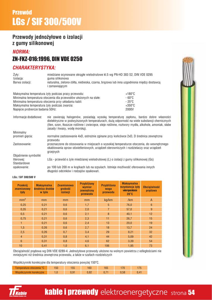 Przewód LGs / SIF 300/500V Przewody jednożyłowe o izolacji z gumy silikonowej NORMA: ZN-FKZ-016:1996, DIN VDE 0250 CHARAKTERYSTYKA: ¯yły: Izolacja: Barwa izolacji: miedziane ocynowane okrągłe wielodrutowe kl.5 wg PN-HD 383 S2, DIN VDE 0295 guma silikonowa naturalna, zielono-żółta, niebieska, czarna, brązowa lub inna uzgodniona między dostawcą i zamawiającym Maksymalna temperatura żyły podczas pracy przewodu: Minimalna temperatura otoczenia dla przewodów ułożonych na stałe: Minimalna temperatura otoczenia przy układaniu kabli: Maksymalna temperatura żyły podczas zwarcia: Napięcie probiercze badania 50Hz: Informacje dodatkowe: +180°C - 60°C - 25°C +350°C 2000V nie zawierają halogenów, posiadają wysoką temperaturę zapłonu, bardzo dobre własności dielektryczne w podwyższonych temperaturach, dużą odporność na wiele substancji chemicznych (tlen, ozon, tłuszcze roślinne i zwierzęce, oleje roślinne, roztwory mydła, alkohole, amoniak, słabe zasady i kwasy, wodę morską). Minimalny promień gięcia: normalne zastosowanie 4xD, ostrożnie zginane przy końcówce 2xD, D średnica zewnętrzna przewodu przeznaczone do stosowania w miejscach o wysokiej temperaturze otoczenia, do wewnętrznego okablowania opraw oświetleniowych, urządzeń sterowniczych i rozdzielaczy oraz urządzeń grzejnych Zastosowanie: Objaśnienie symboliki literowej: Standardowe opakowanie: LGs - przewód o żyle miedzianej wielodrutowej (L) o izolacji z gumy silikonowej (Gs) po 100 lub 200 m w krążkach lub na szpulach. Istnieje możliwość oferowania innych długości odcinków i rodzajów opakowań. LGs / SIF 300/500 V Maksymalna rezystancja żyły wtemperaturze 20°C Obci¹¿alnoœæ pr¹dowa /km A Przekrój znamionowy żyły Maksymalna œrednica drutów w ¿yle Znamionowa grubośæ izolacji Przybliżony wymiar zewnêtrzny przewodu Przybliżona waga przewodu mm2 mm mm mm kg/km , 0.25 0,21 0,6 1,7 5 76.0 , , 0.35 0,21 0,6 2,0 7 57.0 , 9 , 0.5 0,21 0,6 2,1 8 40.1 , 12 , 0.75 0,21 0,6 2,3 11 26.7 , 15 1 0,21 0,6 2,4 13 20.0 , 19 1.5 , 0,26 0,6 2,7 18 13.7 , 24 6 2.5 , 0,26 0,7 3,4 29 8.21 , 32 4 0,31 0,8 4,1 44 5.09 , 42 6 0,31 0,8 4,6 62 3.39 , 54 10 0,41 1,0 6,1 106 1.95 , 73 Obciążalność prądowa wg DIN VDE 0289-4. Jednożyłowe przewody ułożone na wolnym powietrzu z odległościami nie mniejszymi niż średnica zewnętrzna przewodu, a także w szafach rozdzielczych Współczynniki korekcyjne dla temperatury otoczenia powyżej 150°C. Temperatura otoczenia °C 150 155 160 165 170 175 Współczynniki korekcyjne 1,0 0,91 0,82 0,71 0,58 0,41 kable i przewody elektroenergetyczne strona 54