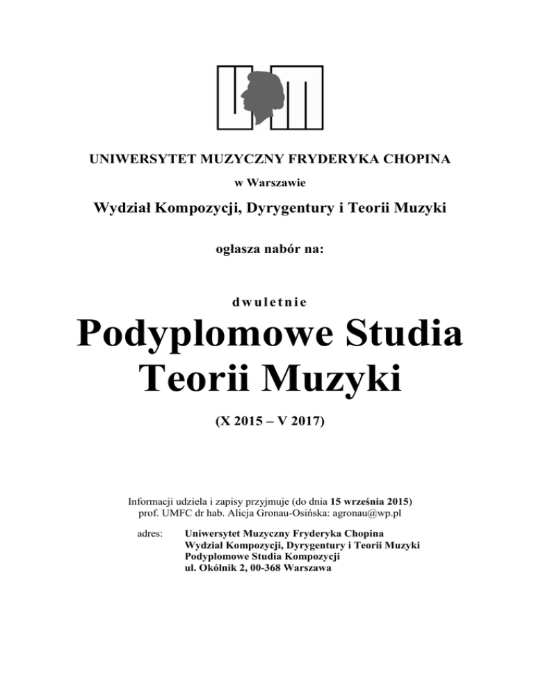 UNIWERSYTET MUZYCZNY FRYDERYKA CHOPINA w Warszawie Wydział Kompozycji, Dyrygentury i Teorii Muzyki ogłasza nabór na: dwuletnie Podyplomowe Studia Teorii Muzyki (X 2015 – V 2017) Informacji udziela i zapisy przyjmuje (do dnia 15 września 2015) prof. UMFC dr hab. Alicja Gronau-Osińska: [email protected] adres: Uniwersytet Muzyczny Fryderyka Chopina Wydział Kompozycji, Dyrygentury i Teorii Muzyki Podyplomowe Studia Kompozycji ul. Okólnik 2, 00-368 Warszawa Uniwersytet Muzyczny Fryderyka Chopina Wydział Kompozycji, Dyrygentury i Teorii Muzyki ul. Okólnik 2, 00-368 Warszawa Informacja o ósmej edycji dwuletnich Podyplomowych Studiów Teorii Muzyki 1. Organizator: Wydział Kompozycji, Dyrygentury i Teorii Muzyki; kierownik dr hab. prof. UMFC Alicja Gronau-Osińska 2. Termin studiów: październik 2015 – maj 2017. 3. Planowane zajęcia w roku akademickim 2015/2016: 10 i 24 X, 7 i 21 XI, 5 i 19 XII, 9 i 23 I, 6 i 20 II, 5 i 19 III, 9 i 23 IV, 7 i 21 V (soboty 10.00– 15.30). 4. Cel studiów: intensywny rozwój warsztatu w zakresie teorii muzyki w aspekcie naukowym; możliwe wstępne przygotowanie do Studiów Doktoranckich UMFC lub rozpoczęcia pracy nad dysertacją doktorską w zakresie teorii muzyki (z wolnej stopy). 5. Kandydaci: absolwenci polskich uczelni muzycznych lub uniwersytetów z tytułem licencjata lub magistra sztuki albo muzykologii; absolwenci zagranicznych uczelni muzycznych lub uniwersytetów po kierunkach kompatybilnych z kierunkami analogicznych polskich uczelni z tytułem bachelor lub master of art; obywatelstwo polskie nie jest wymagane; językiem wykładowym jest język polski. 6. Przedmioty: Seminaria teorii muzyki (pięć, w tym Hermeneutyka), Seminaria form muzycznych (cztery), Technologia pracy naukowej, Metodologia nauk, Redagowanie tekstów naukowych, Filozofia, Filozofia muzyki, Psychologia muzyki, Pedagogika muzyki, Antropologia muzyki, Estetyka, Podstawy nauk o sztukach pięknych, Wykład monograficzny (na wybrany przez słuchaczy temat). 7. Wykładowcy: prof. dr hab. Irena Poniatowska (UW), dr Katarzyna Szymańska-Stułka, prof. dr hab. Stanisław Dąbek, dr hab. Anna Brożek (UW), dr hab. Jagna Dankowska, dr Jolanta Welbel, prof. dr hab. Alicja Jarzębska (UJ), dr hab. Violetta Przerembska, dr Małgorzata Waszak, dr Iwona Świdnicka, dr hab. Krzysztof Lipka, dr hab. Wojciech Nowik i in. 8. Wymagane dokumenty (vide Regulamin studiów podyplomowych w UMFC: www.chopin.edu.pl / uniwersytet / akty prawne): • dyplom ukończenia studiów I lub II st. (oryginał lub uwierzytelniony odpis; w przypadku dyplomu studiów zagranicznych wymagana jest nostryfikacja lub dokument uznania) z tytułem określonym w p. 5. • podanie o przyjęcie na PSTM wraz z zobowiązaniem do ponoszenia kosztów odpłatności za studia (zał. 13), • kwestionariusz osobowy (zał. 14), • życiorys (adres, telefon, e-mail) oraz 3 zdjęcia legitymacyjne, • kserokopia dowodu osobistego lub paszportu albo innego dokumentu ze zdjęciem, • wykaz dorobku naukowego i dydaktycznego (publikacje, konferencje, sesje i sympozja, kursy dokształcające, stypendia, nagrody itp.), • dokument potwierdzający znajomość języka polskiego jako obcego w przypadku osób niebędących obywatelami polskimi lub absolwentami polskich uczelni. UWAGA! Opłata rekrutacyjna wynosi 250 zł Na konto: 62 1750 0009 0000 0000 1333 6188 Dowód wpłaty należy okazać przez rozmową kwalifikacyjną. Opłata nie ulega zwrotowi. 10. Zgłoszenia: do 15.09.2015 na adres: Uniwersytet Muzyczny Fryderyka Chopina Wydział Kompozycji, Dyrygentury i Teorii Muzyki Podyplomowe Studia Teorii Muzyki ul. Okólnik 2, 00-368 Warszawa 11. Rozmowa kwalifikacyjna: 3.10.2015 (sobota), UMFC, s. 452 (II p.). 12. Informacji udziela: Alicja Gronau-Osińska: [email protected]